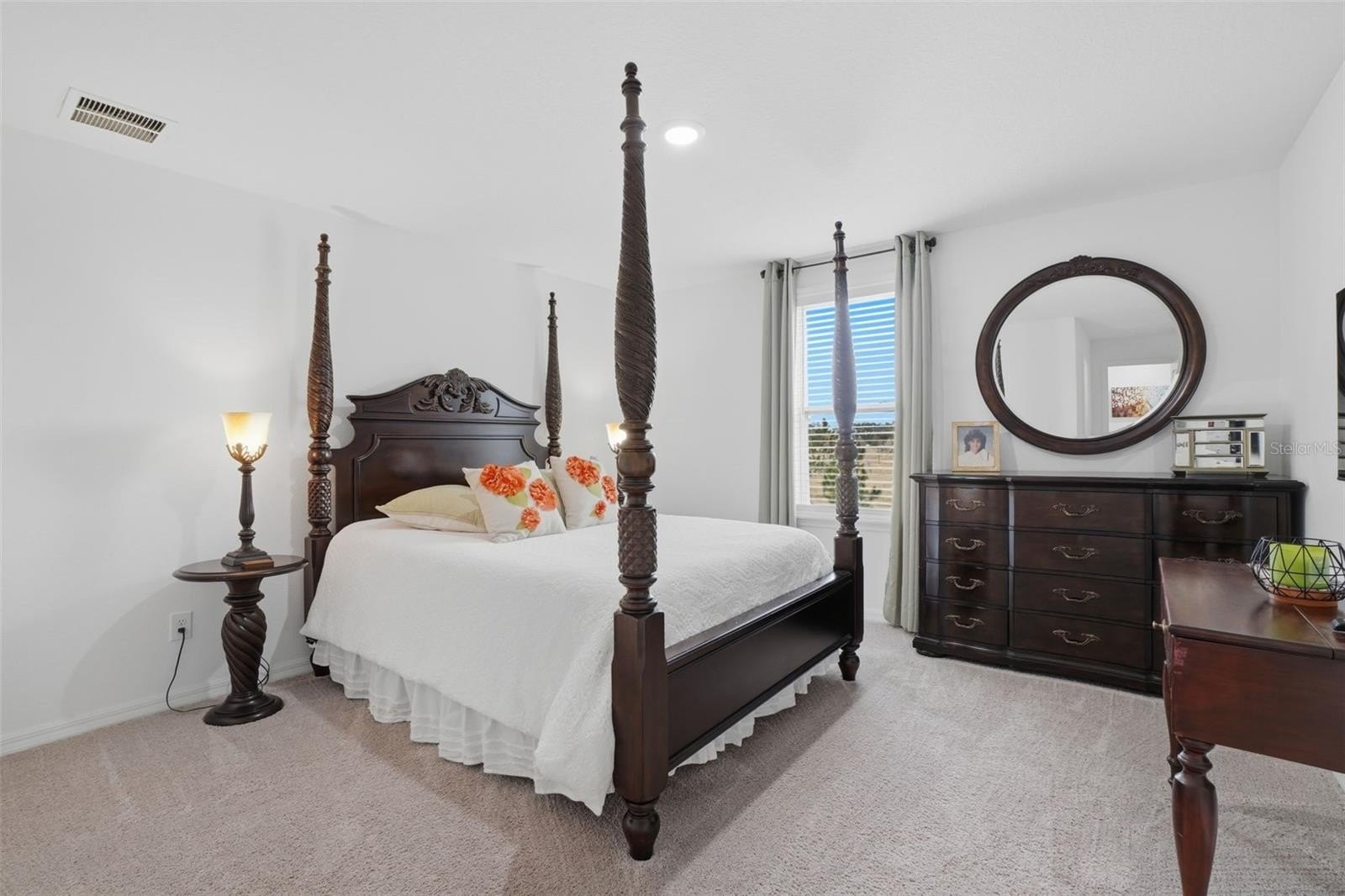 Upstairs, the grand staircase leads to a double-door primary suite retreat with a refined en-suite bathroom showcasing upgraded countertops, dual sinks, a spacious shower, and a premium frameless glass enclosure. All secondary bedrooms are generously sized and conveniently located near bathrooms and the laundry room.