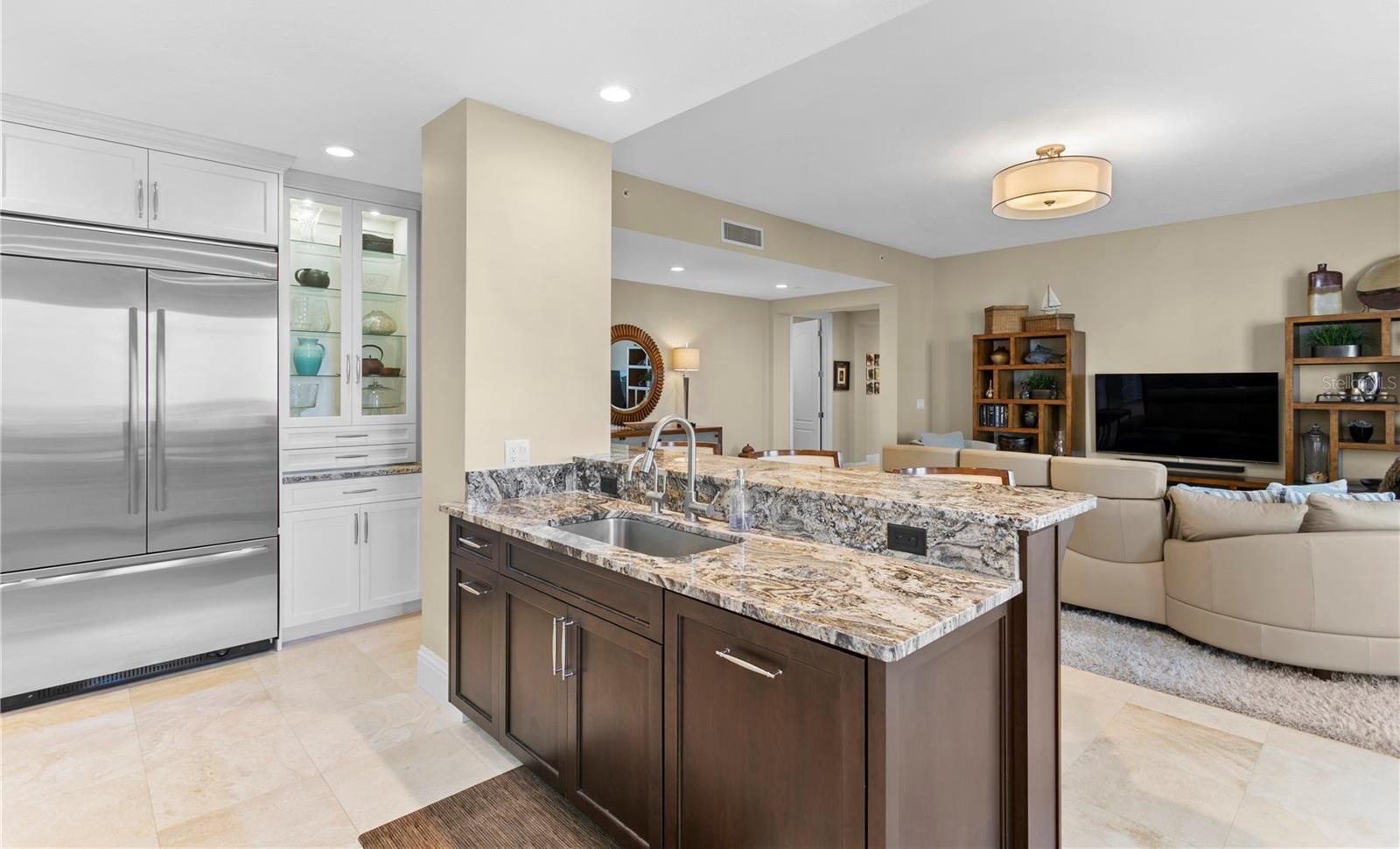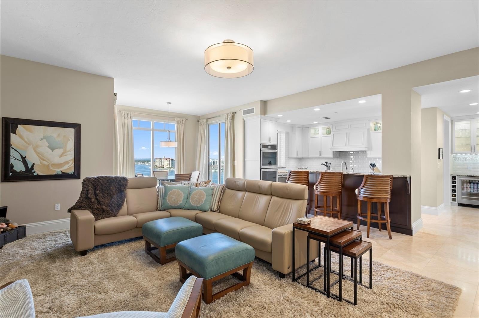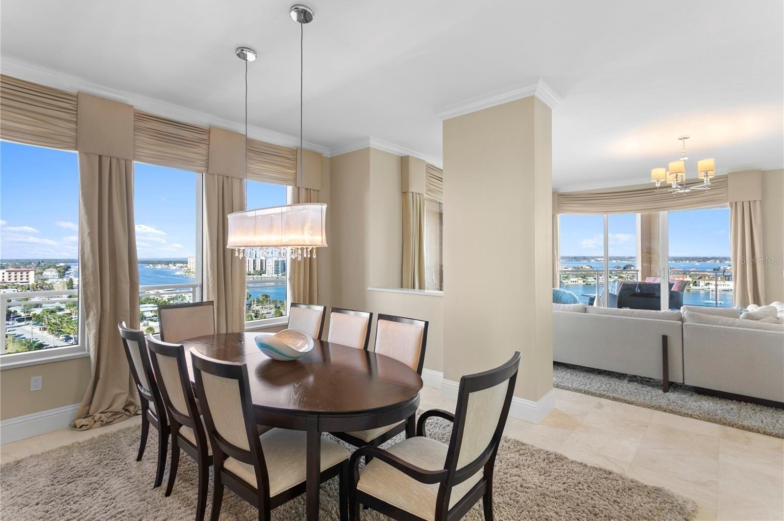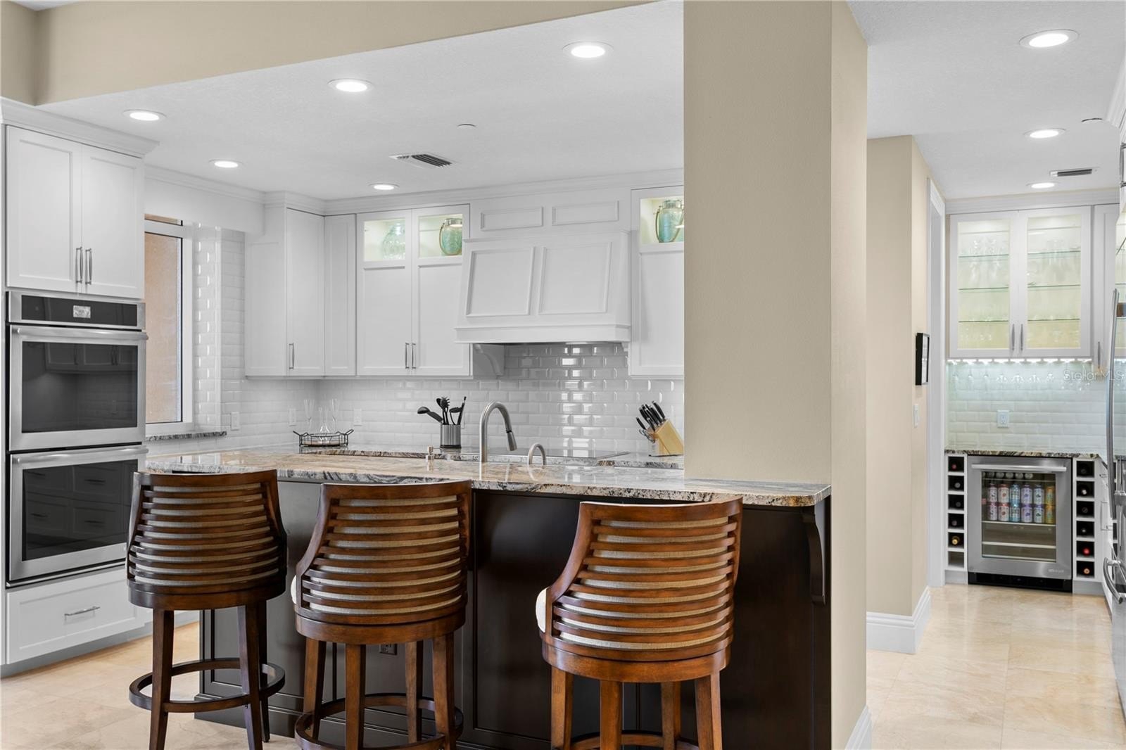 Designed for both elegance and comfort, the residence features travertine and ceramic tile flooring throughout the main living areas, expansive windows, and a thoughtfully designed layout that flows seamlessly from indoors to out. The four large balconies wrap the entire penthouse, creating multiple vantage points to enjoy sunrise and sunset, lending to one of the most visually stunning vantage points in all of Clearwater Beach. Additionally, this unit features a beautifully updated, custom kitchen with high end appliances, millwork range hood, bar seating, and butler’s pantry. Additional rooms include, formal dining space, family room, living room, indoor laundry room, and breakfast nook with panoramic views.