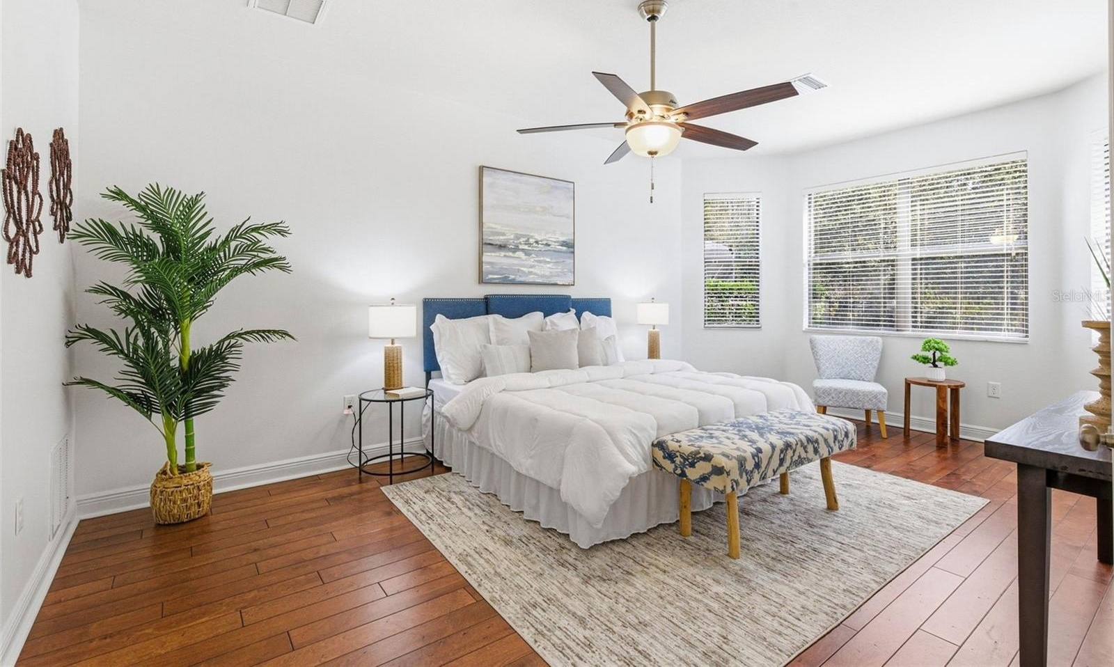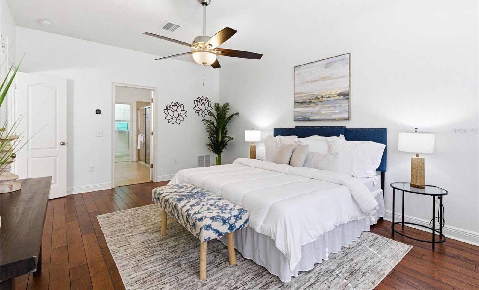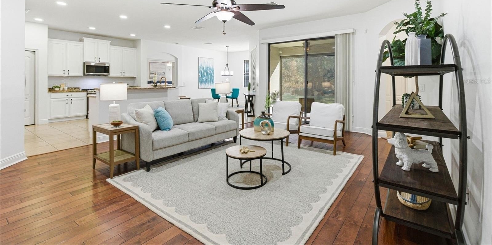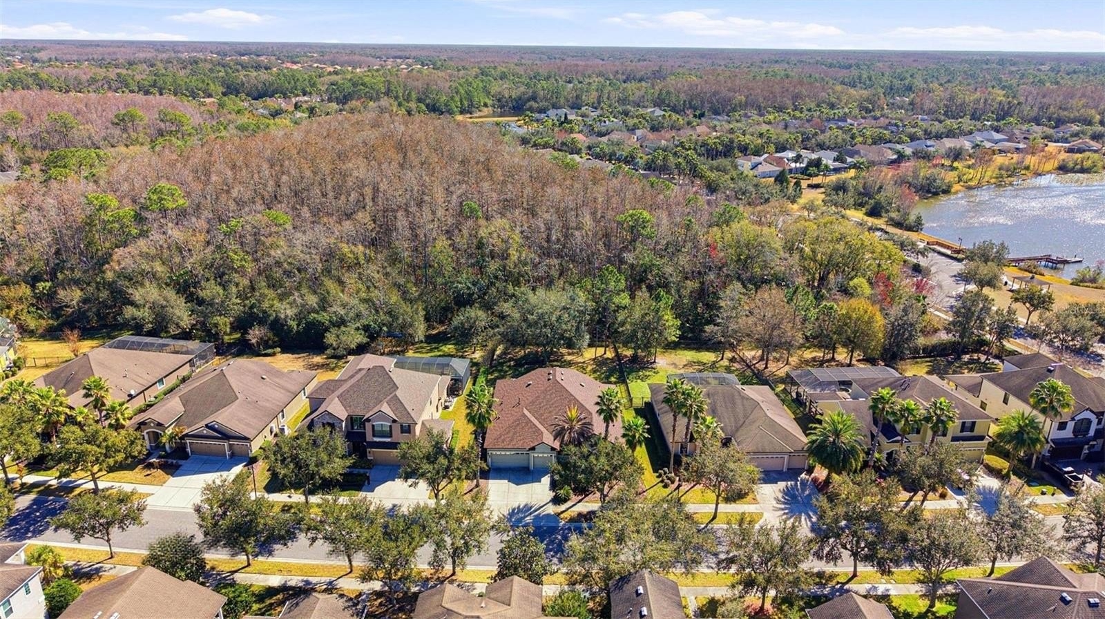 One or more photo(s) has been virtually staged. Located within the desirable, gated community of Grand Hampton, this William Ryan Homes residence at 7907 Hampton Lake Drive offers a thoughtfully designed floor plan, refined finishes, and serene conservation views on an oversized lot. As you arrive, Florida-friendly lush landscaping and modern outdoor lighting guide you toward the covered front entryway framed by classic columns, setting the tone for what awaits inside. Upon entry, the foyer opens into the formal dining room, highlighted by a cascading chandelier and ample space for hosting large gatherings and special occasions. Just adjacent is a bonus room currently used as a dedicated office, filled with natural light and ideal for productivity or creative use. Nearby, Bedroom Two and the first full bathroom provide a convenient and private setup for guests. The home then unfolds into a bright open-concept living area featuring recessed lighting and expansive sliding glass doors—complete with a screen—allowing you to enjoy cool Florida days while overlooking the outdoor oasis. Just beyond the living room, the breakfast area offers a peaceful setting for quiet mornings and casual meals. The kitchen serves as the heart of the home, showcasing recessed lighting, solid wood cabinetry, a tiled backsplash, granite countertops, stainless steel appliances including a gas range, and a large center island with seating. A spacious under-the-stair storage closet with custom shelving provides exceptional organization. The expansive primary suite, thoughtfully positioned on the main floor, offers a peaceful retreat with generous proportions and abundant natural light. The space comfortably accommodates a king-size bed and sitting area, creating a true sanctuary within the home. The large walk-in closet provides ample storage, while the spa-inspired primary bathroom features a dual-sink granite vanity, a deep soaking tub, and a glass-enclosed walk-in shower, delivering a relaxing, resort-like experience. Down the hall, two additional bedrooms and a third full bathroom complete the main level. Upstairs, a massive bonus room offers endless possibilities—entertainment lounge, media room, home gym, or play space—enhanced by built-in surround sound speakers. The outdoor living area features a covered porch equipped with a Sunbelt remote-controlled screen, overlooking a fully fenced expansive backyard with uninterrupted conservation views, providing privacy and tranquility. The three-car garage includes upper storage shelving and a utility sink for added convenience. Notable Updates & Features: Roof (2025) | HVAC (2025) | Tankless Gas Water Heater (2021) | Hunter Irrigation System | Ecobee Thermostat | IQ Panel Home System. The Grand Hampton community offers an exceptional lifestyle with resort-style amenities, including a 24-hour manned gate, state-of-the-art clubhouse, fitness center, playgrounds, lake access, and heated pools—featuring a lagoon-style pool with slide and a dedicated lap pool. Residents also enjoy tennis courts and basketball courts. Ideally located near I-75 and I-275, this home provides convenient access to AdventHealth Hospital, PHSC, AdventHealth Center Ice, The Shops at Wiregrass, and Tampa Premium Outlets. Schedule your private showing today, and for a virtual tour, click the provided link to experience this remarkable property firsthand.