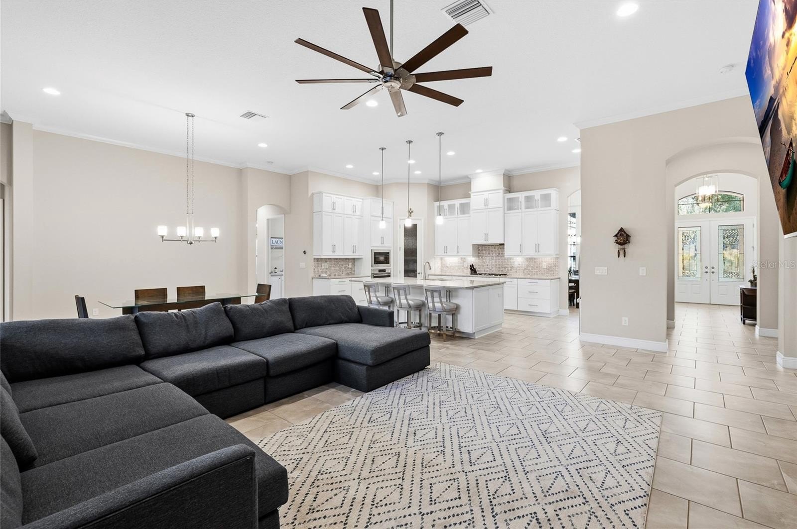 GORGEOUS PRIVATE POOL HOME! Located in the exclusive gated community of FishHawk Preserve, this luxury WestBay built home has 4 bedrooms, 3 full bathrooms, and a 3-car garage. Upon arrival, you'll notice this one-story ranch style home sits on an oversized lot, with striking features that include a stacked stone exterior, tiled roof, driveway and walkway pavers, and a side entry garage! Step inside into an open foyer, with tile floors, high ceilings, and crown molding throughout, and a private office enclosed with double French doors and formal dining room near the entryway. The home has a desirable open floorplan, with the kitchen overlooking the family room which centers around an electric fireplace with a stone mantle. The kitchen features a center island with pendant lights, modern stainless-steel appliances with a gas cooktop and built-in oven, quartz countertops and tiled backsplash, and a walk-in pantry. The bedrooms are split with the primary suite offering a tray ceiling, spacious sitting room with French door to the lanai, and a dual walk-in closets. The en-suite bathroom includes a wide double sink vanity, tiled walk-in shower, and a separate garden tub. Towards the back of the home, there is a BONUS ROOM to use as a playroom, game room, or as flex space, with a glass slider for access to the pool! The pavered lanai is screened and has the SALTWATER POOL WITH SPA & OUTDOOR KITCHEN, with a grill, sink, and bar fridge, covered with plenty of space for outdoor seating. Zoned for all A-rated schools in a highly sought after area, this home truly has it all. Call today to schedule a private viewing!