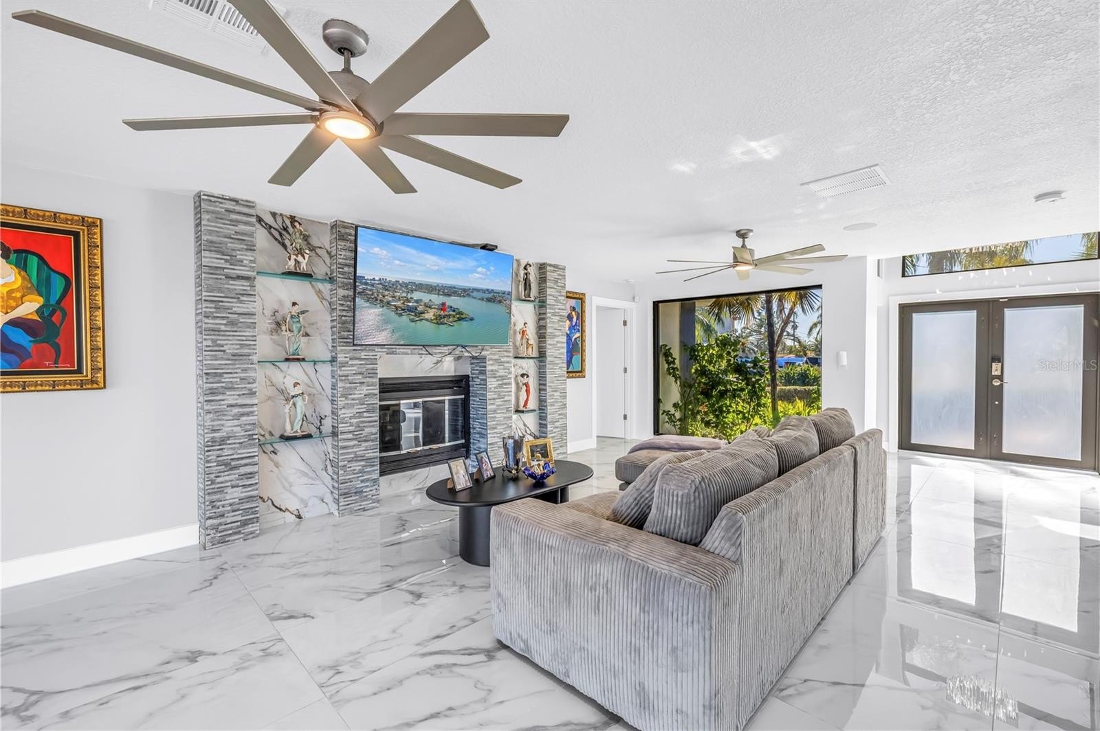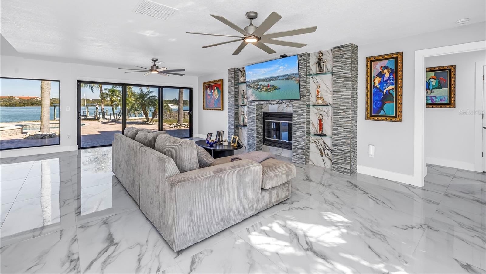 Outdoors, a resort-style pool is surrounded by expansive paved patios, a one of a kind fire pit surround, and all of this is framed by water on three sides, offering an ideal setting for both intimate gatherings and grand celebrations. This spot gives you a front row seat to the most Spectacular Christmas Boat Parades. Nearly 160 linear feet of deep-water seawall, dual 10,000-lb boat lifts, and direct Gulf access with no fixed bridges create a true mariner’s haven.