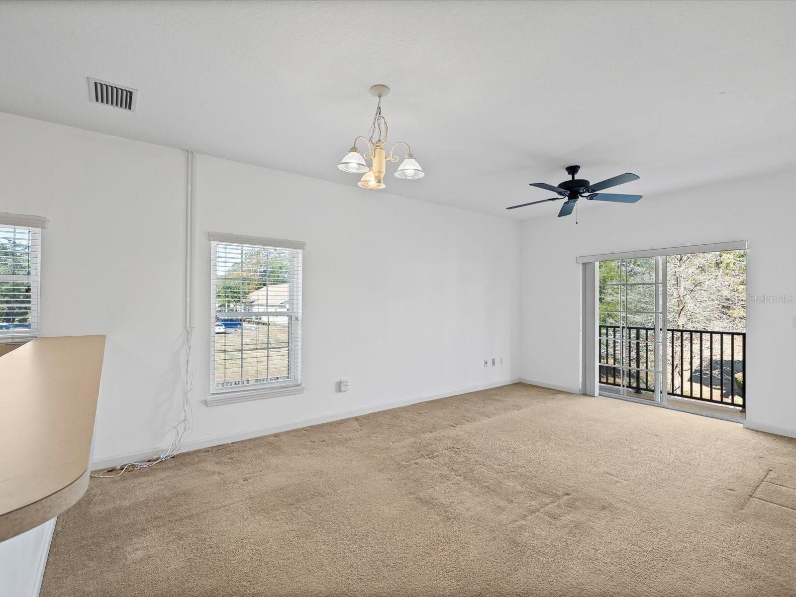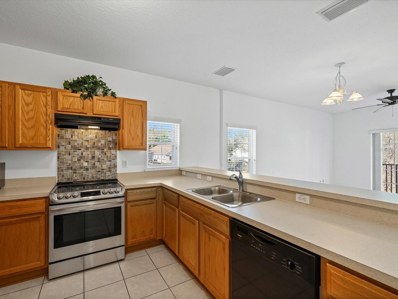 This corner unit home is light and bright with soft neutral walls and noticeably better natural light than interior units. The great room opens directly to a balcony, creating usable outdoor space right off the living area, perfect for entertaining. The kitchen includes stainless steel appliances and a large breakfast bar that works well for seating and everyday meals. Windows are double-pane, double-hung, contributing to comfort and efficiency.
