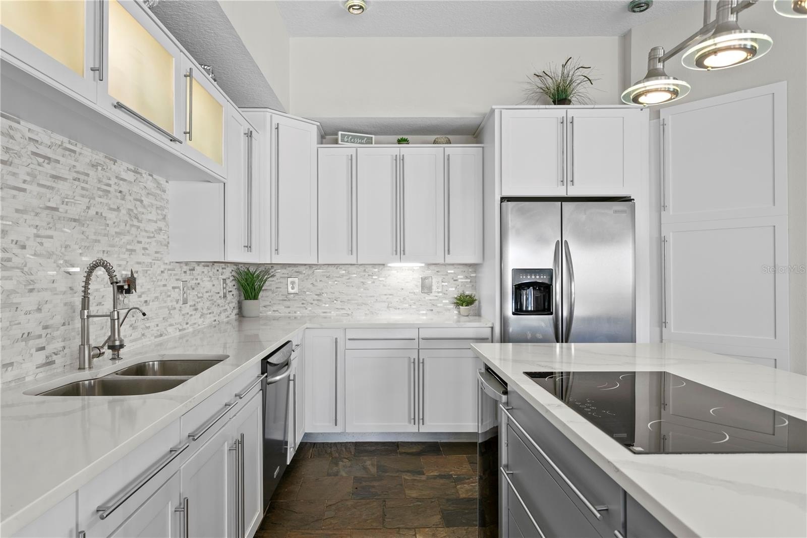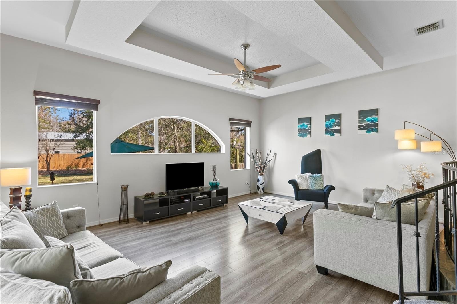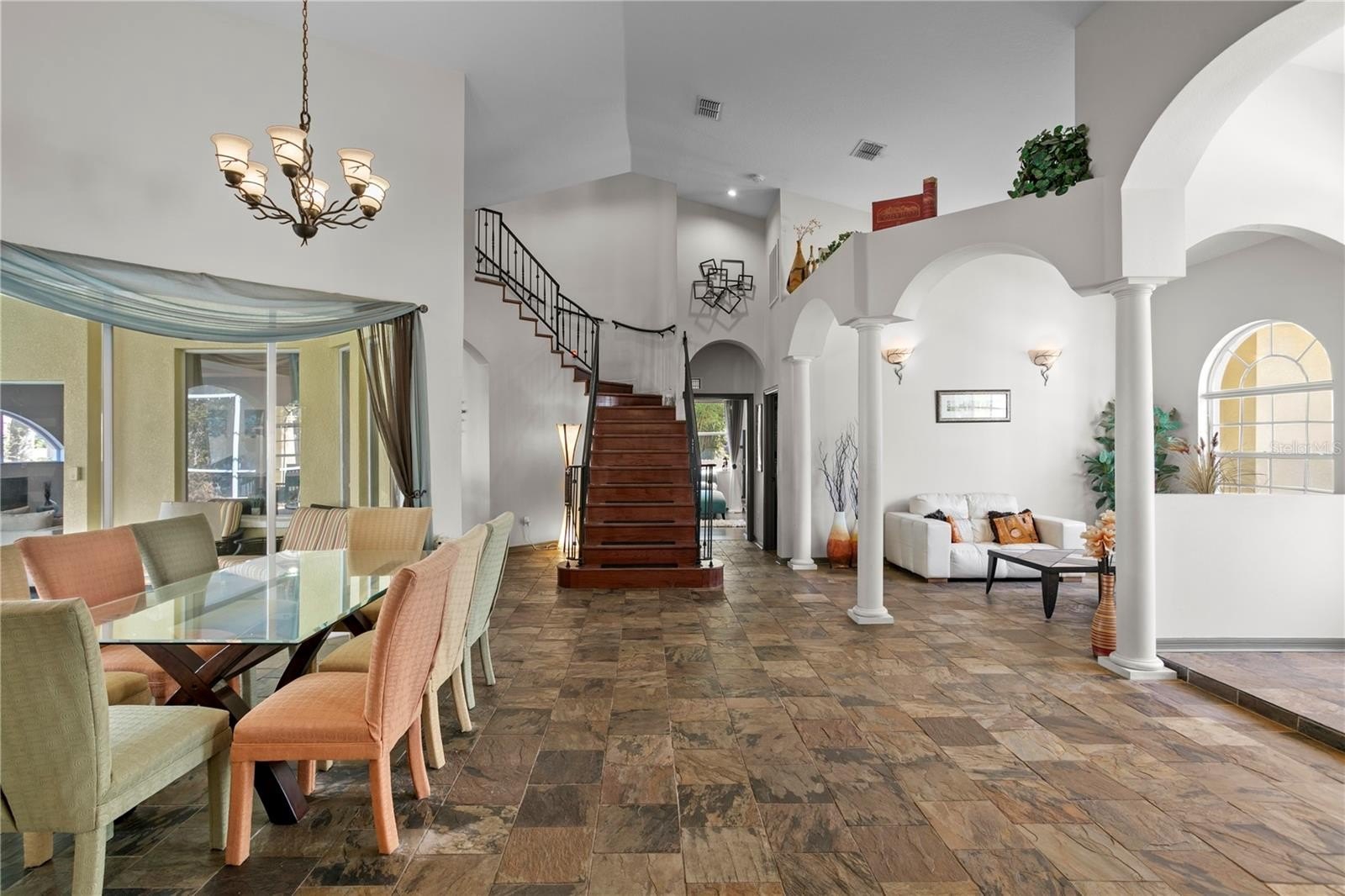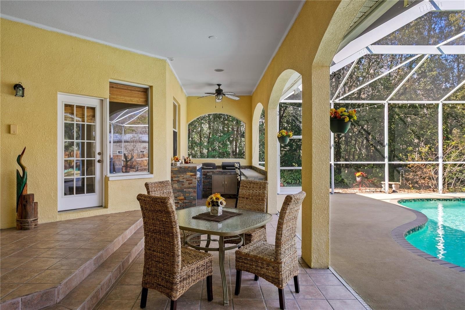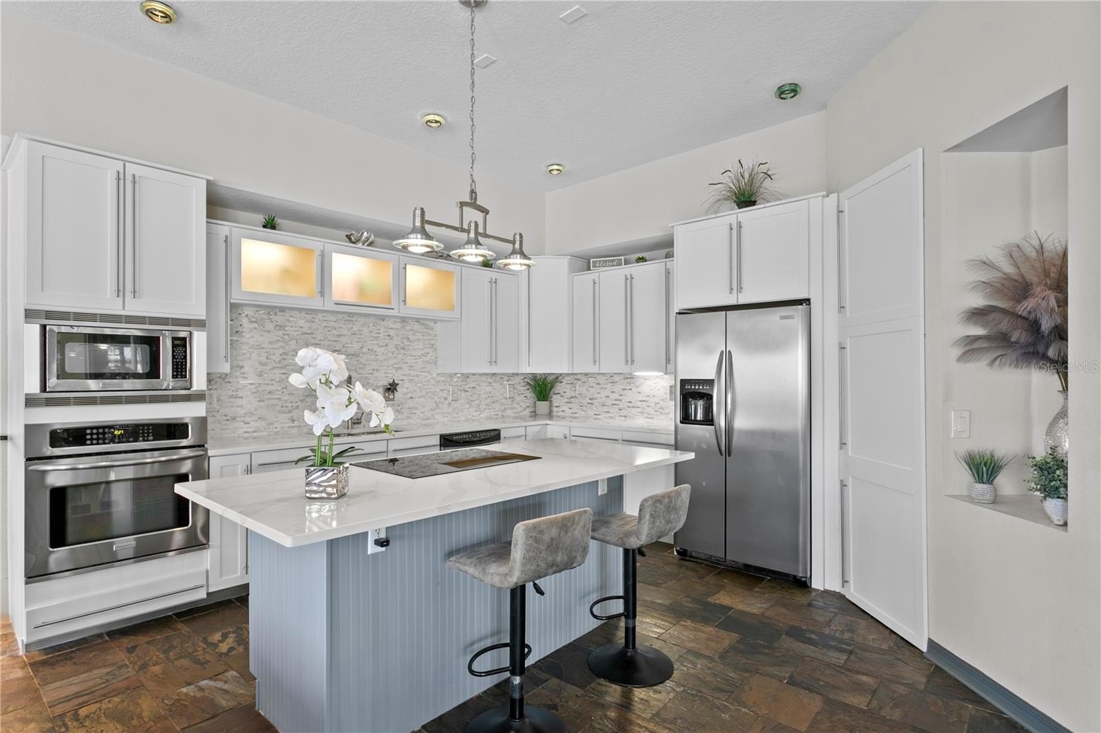 Upon entering the home, you are welcomed into a formal living room and dining room that overlook the pool and backyard, creating an immediate sense of space and an effortless indoor-outdoor connection - ideal for entertaining or relaxed everyday living. A private home office at the front of the home provides a dedicated and quiet workspace, while two spacious bedrooms offer comfortable accommodations for family or guests. A generously sized fourth bedroom adds flexibility for a home theater, media room, or private guest suite. New interior doors throughout enhance the home’s updated and well-cared-for feel. Completing the main level, the renovated kitchen is a true chef’s delight, featuring quartz countertops, an elegant backsplash, generous workspace, kitchen island with cooktop, an eat in area and a layout that opens to a large family room, creating the perfect gathering space for everyday living, entertaining, and making lasting memories with family and friends.