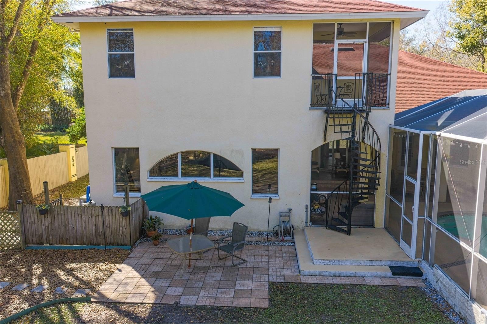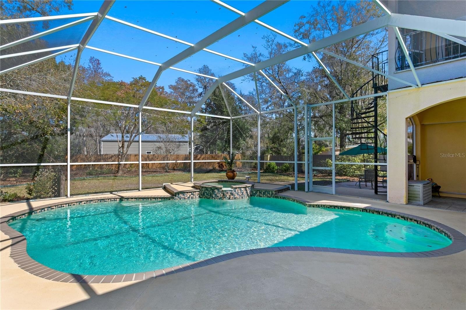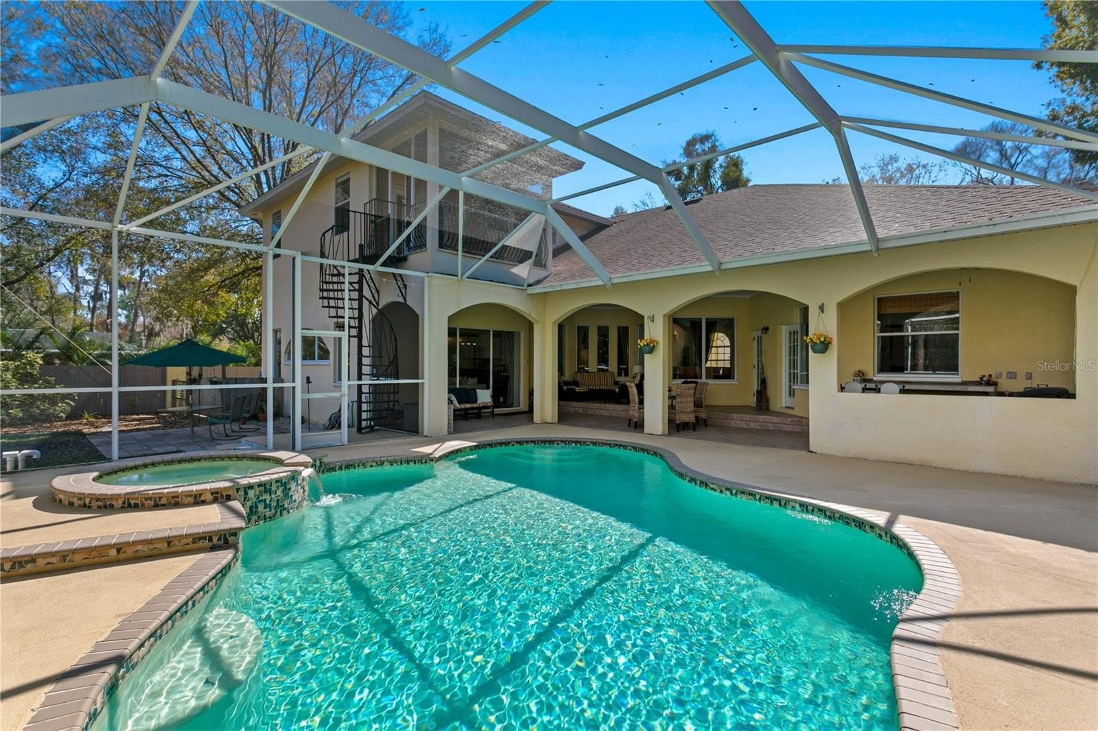Upstairs, the spacious primary suite offers a private retreat with abundant room to unwind. The suite features large walk-in closets, a luxurious bathroom with a separate walk-in shower and soaking tub, dual sink areas, and a cozy sitting area - perfect for reading or enjoying a quiet morning. Step out onto the private balcony overlooking the pool and lush trees, creating a serene setting to relax and take in the tranquil surroundings. Take the spiral staircase from the balcony down to pool and spa area, perfect for convenience and privacy.