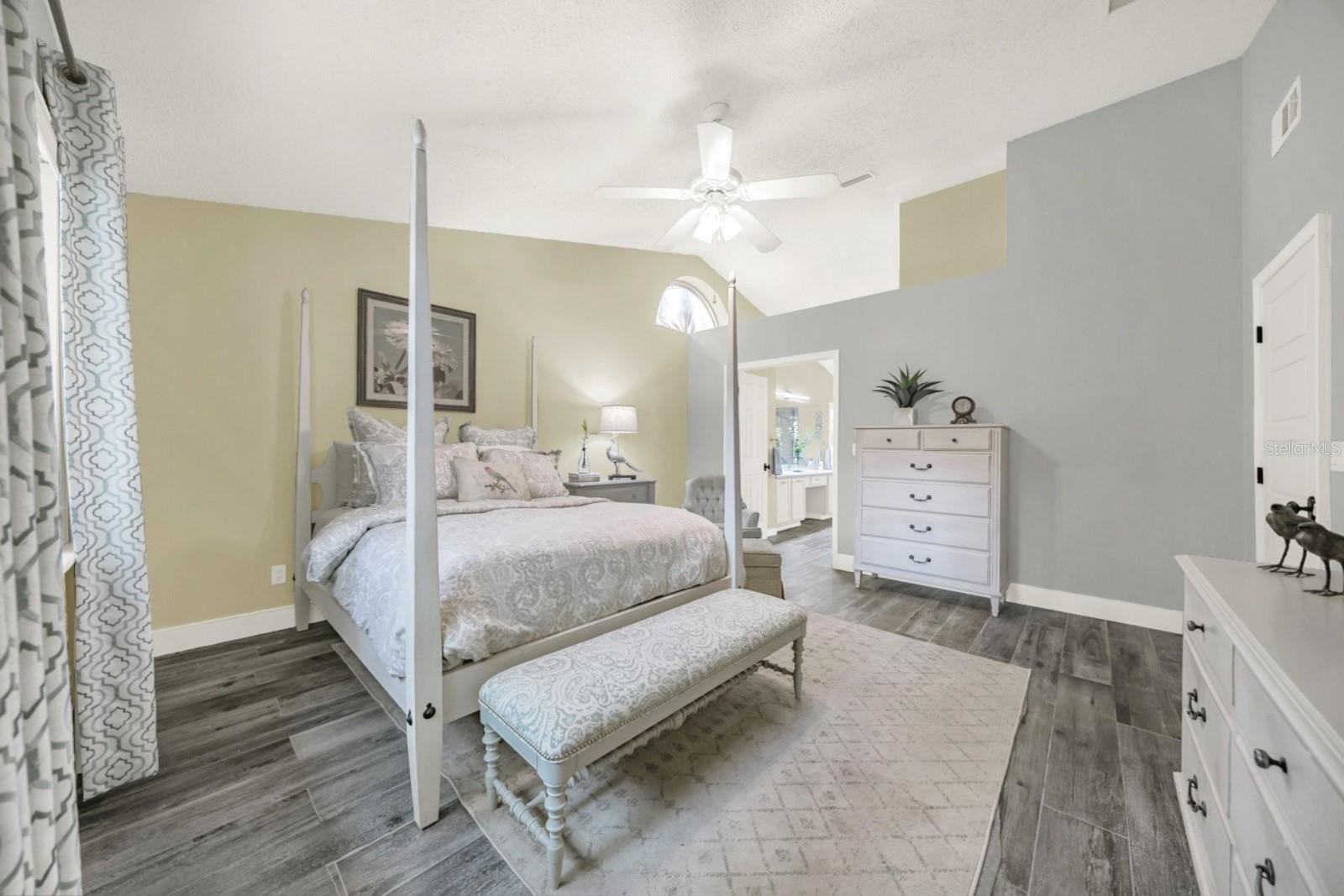 The home features a true SPLIT-BEDROOM FLOOR PLAN for maximum individual respite. To the right, the RENOVATED PRIMARY SUITE and ENSUITE boasts an elongated 8’ DUAL SINK GRANITE VANITY, a FRAMELESS-GLASS WALK-IN SHOWER, a HEATED, JETTED, JACUZZI WHIRLPOOL SPA TUB, and a WALK-IN CLOSET. Two additional bedrooms occupy the opposite side of the home, each with LARGE PICTURESQUE WINDOWS framing the outdoor views and each with access to a RENOVATED GUEST BATH.
