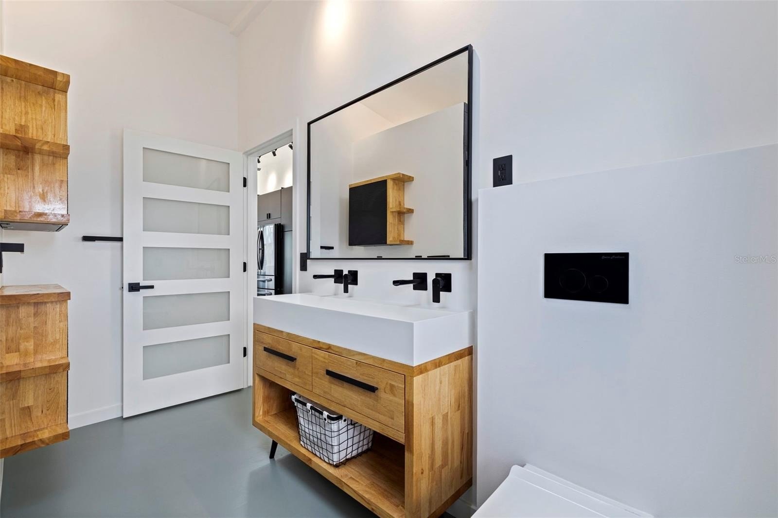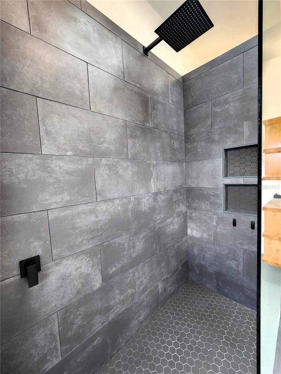 The beautifully updated bathroom showcases both style and function, with custom built-in storage cleverly integrated into the décor, a handcrafted dual-sink vanity, a high-efficiency low-flow toilet, and a stunning glass walk-in shower with rainfall showerhead.