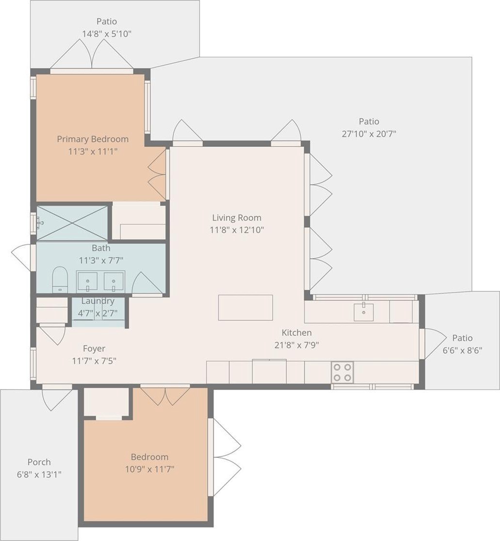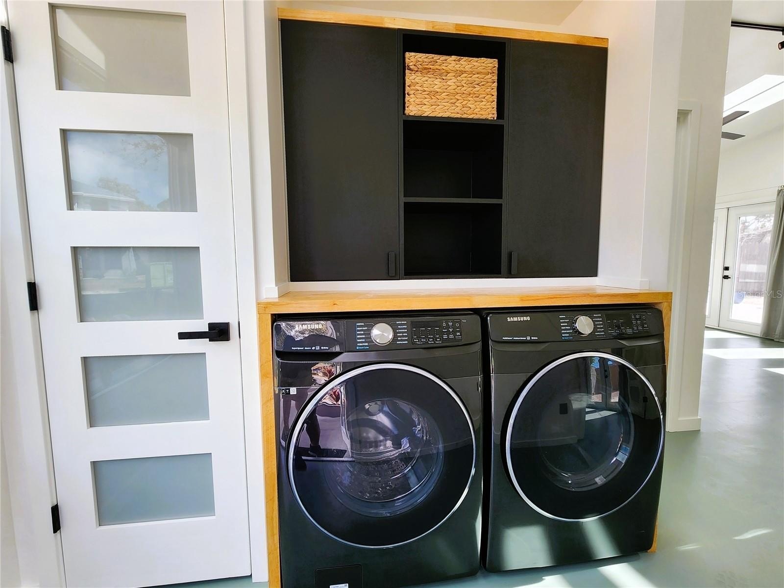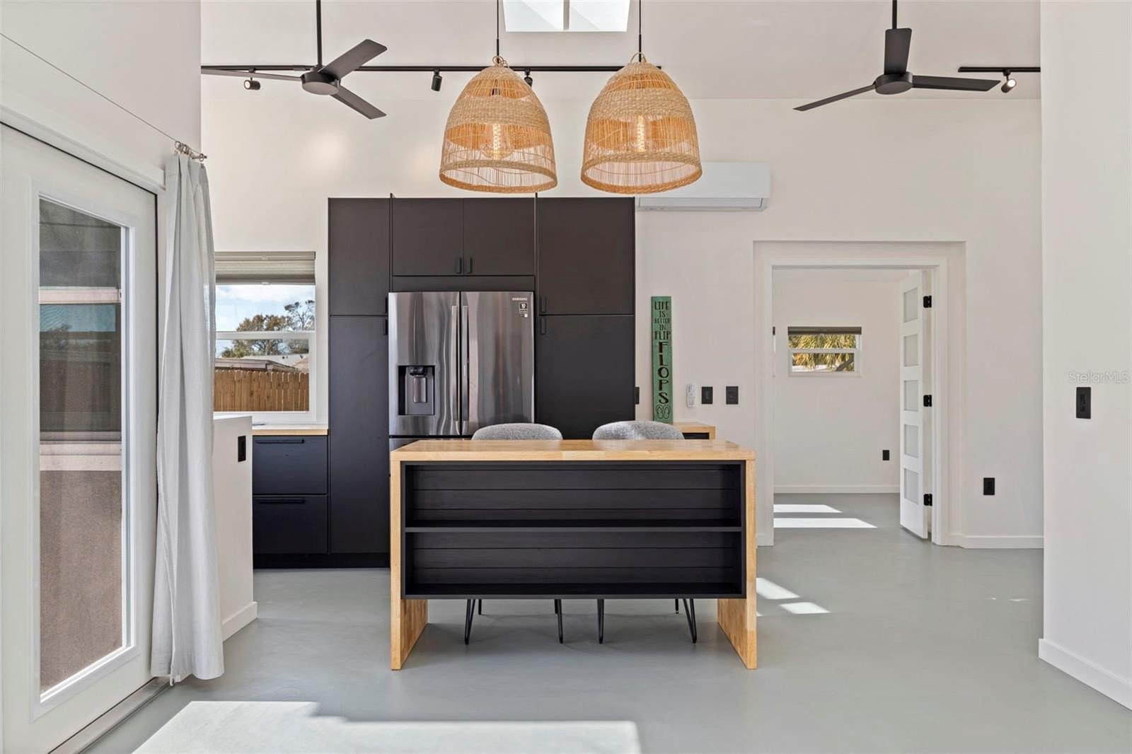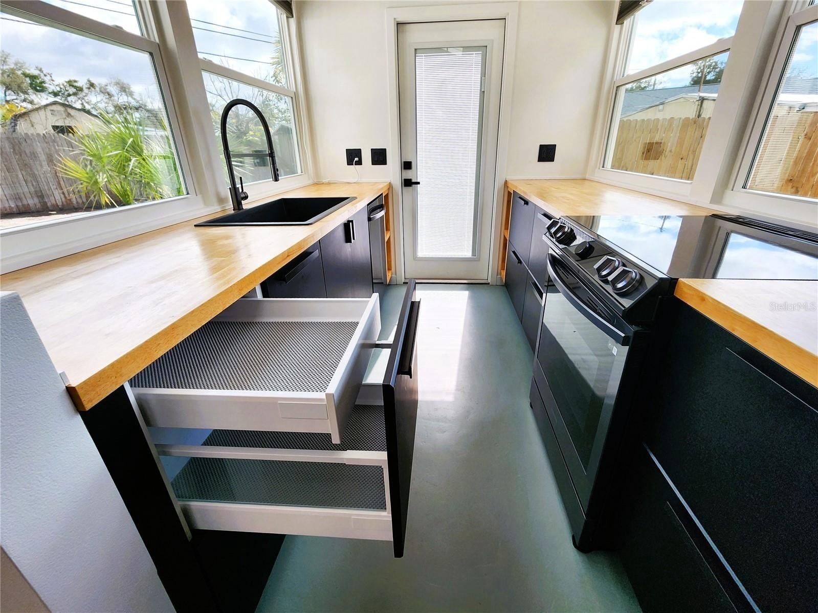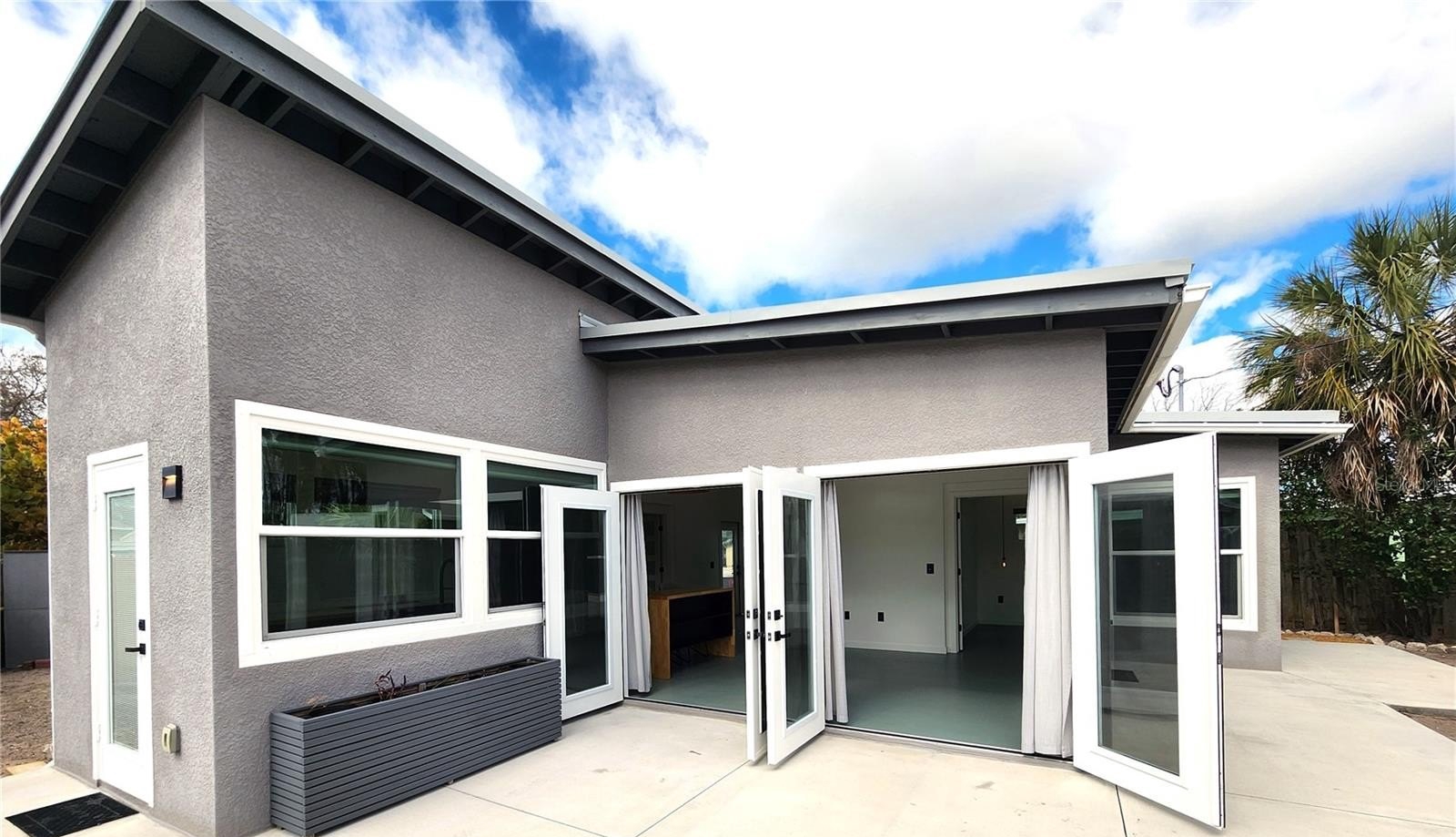 The kitchen is warm, open, and inviting, featuring high-end appliances, an under-mount sink, butcher-block countertops, and exceptionally efficient storage, including innovative drawer-within-drawer organization to maximize space. A rare and delightful feature of this home is that each bedroom offers private double-door access to the backyard — perfect for stepping outside to enjoy the weather or seamlessly blending indoor and outdoor living.