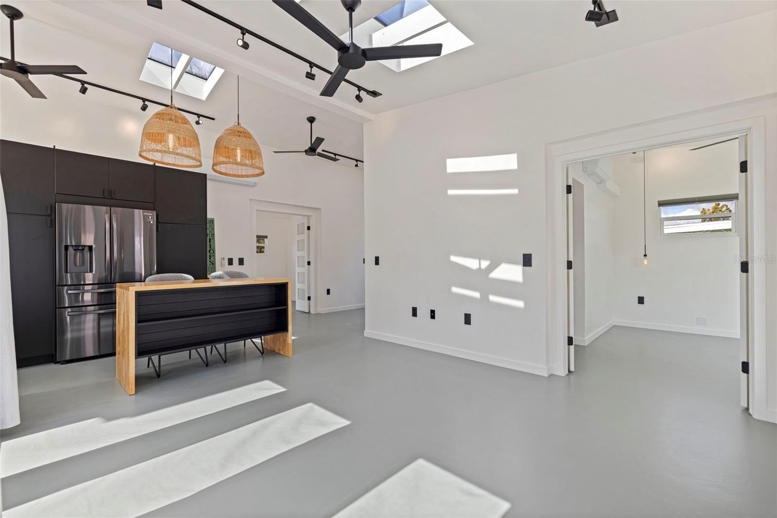 Step into this striking modern industrial home with a touch of boho-chic style — a thoughtfully curated blend of design elements that delivers a true wow factor from the moment you walk in. Soaring vaulted ceilings, an impressive open floor plan, and abundant natural light streaming through large windows, glass doors, and skylights create a bright, airy atmosphere that feels spacious without the upkeep of a larger home.