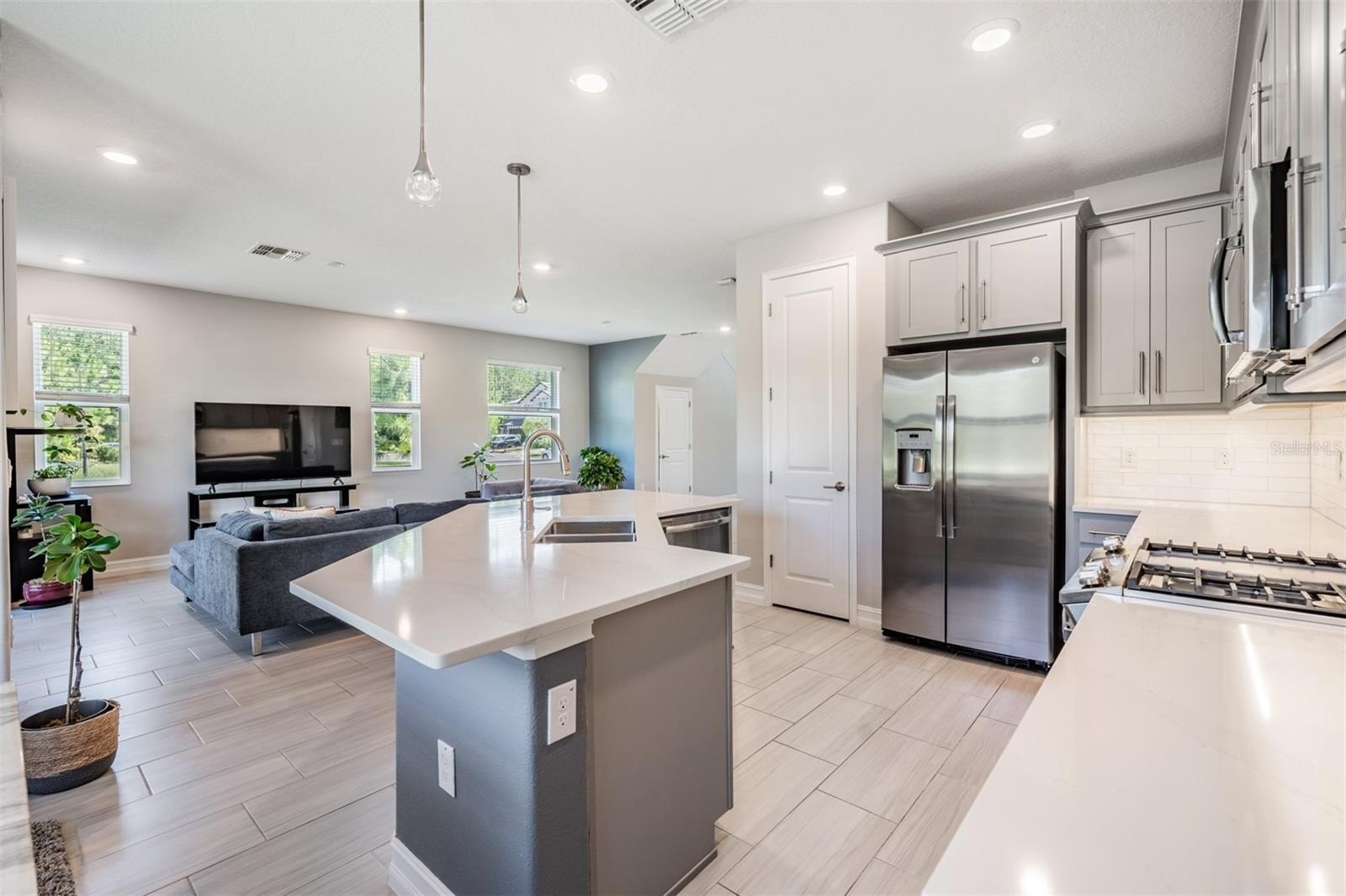 Experience the best of resort-style living in this meticulously maintained, upscale townhome located in the highly desirable Estancia community of Wesley Chapel. This stunning end-unit residence is perfectly positioned on a quiet street that ends in a cul-de-sac next to an open lot offering enhanced privacy with no immediate neighbor. With 2,047 sq ft of beautifully designed living space, this home features 3 bedrooms, 2.5 bathrooms, a flexible den/flex space, and a 2-car garage. From the moment you step inside, you’ll be impressed by the gorgeous 12x24 tile flooring that flows seamlessly throughout the entire first floor. The gourmet kitchen overlooks the spacious living room and is ideal for both entertaining and everyday living. Enjoy 42” upper cabinets with crown molding and light rail, soft-close drawers, elegant quartz countertops, a stylish tile backsplash, and stainless-steel appliances, including a gas range. The large center island with breakfast bar and walk-in pantry complete this chef-inspired space. The living room (15x10) features sliding glass doors that open onto a screened, covered lanai, where you can unwind while taking in tranquil views of the pond and conservation area. The first floor also includes a versatile den/flex space and a convenient powder room. Upstairs, you’ll find all three bedrooms, a full bath, and a dedicated laundry room. The spacious owner’s retreat (18x12) offers a tray ceiling, a private screened balcony with panoramic water and conservation views, a large walk-in closet, and a luxurious ensuite bathroom with dual vanities and a walk-in shower. Additional highlights include high ceilings, 8’ doors, LED recessed lighting throughout, a tankless water heater, and a brick-paved driveway—all on a premium $32K homesite. Estancia offers exceptional amenities, including a clubhouse, fitness center, two resort-style pools, playground, dog park, and courts for basketball, tennis, and pickleball, as well as miles of nature trails. CDD fees are included in property taxes. This is a truly magnificent home offering a rare combination of luxury, privacy, and lifestyle. Don’t miss your chance—schedule your private tour today!