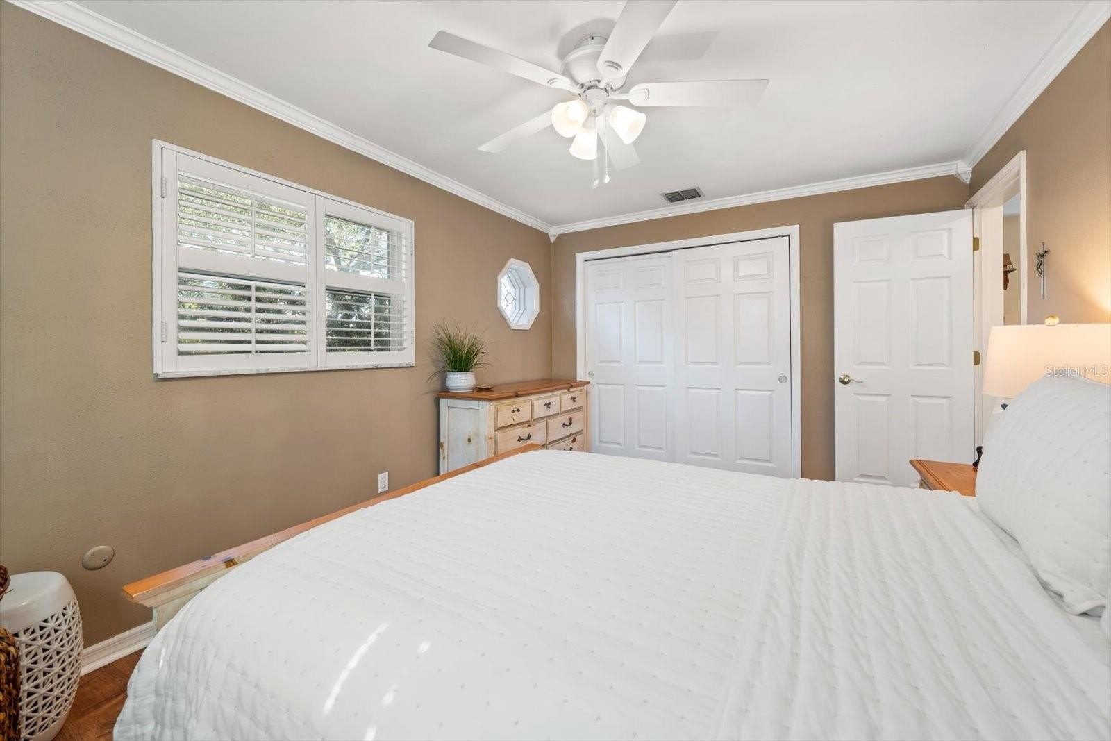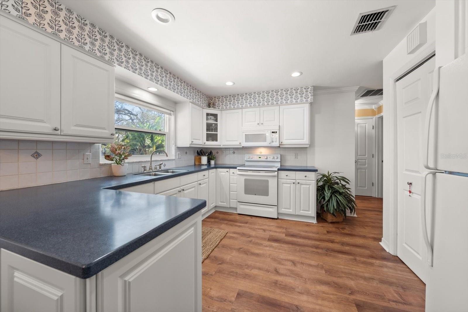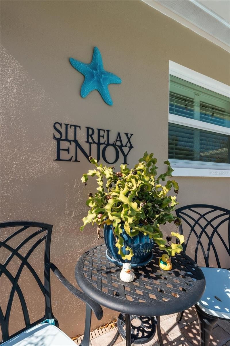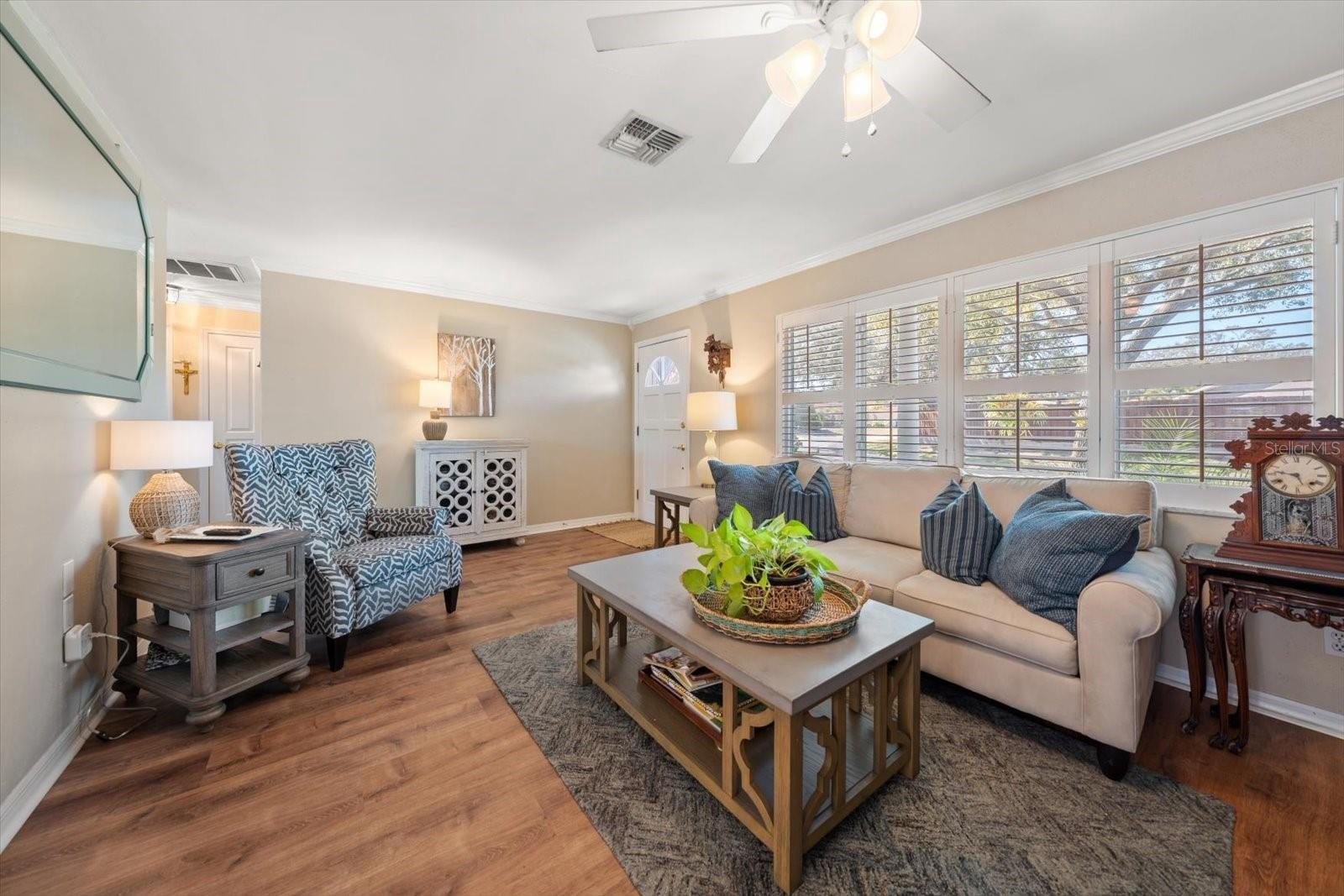 Perfectly positioned on a quiet street in a friendly, walkable neighborhood, this beautifully maintained home offers outstanding curb appeal with a circular driveway, mature landscaping, and a welcoming front porch. Step inside and pride of ownership is immediately evident, with fresh paint, luxury wide-plank vinyl flooring throughout, crown molding, and plantation shutters enhancing the bright, open floor plan. The sparkling white kitchen features abundant counter space and a sink overlooking the pool, flowing seamlessly into the dining area—ideal for everyday living and entertaining. French doors lead to a meticulously maintained backyard oasis with a newly resurfaced pool and new paver deck, creating the perfect setting to relax poolside or enjoy gardening with the convenience of a garden shed and endless possibilities for outdoor living. Both bedrooms are spacious and filled with natural light, offering generous closet space and sharing an updated hall bath. A versatile bonus/flex room makes an ideal home office, guest space, or multipurpose area, with an additional bathroom nearby for added convenience. An oversized garage provides excellent storage, and thoughtful upgrades include impact windows, an upgraded electrical panel with generator hookup, a new AC (2023), and an irrigation system with well. Ideally located close to shopping, restaurants, and beautiful beaches, this move-in ready home truly has it all.