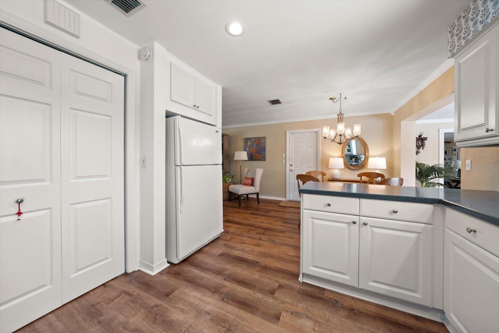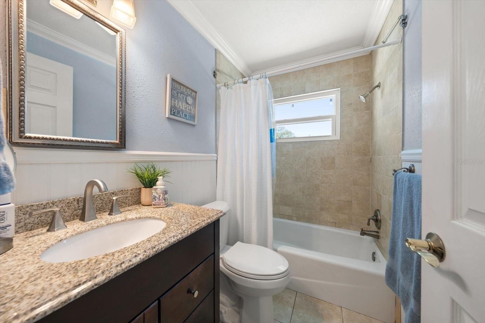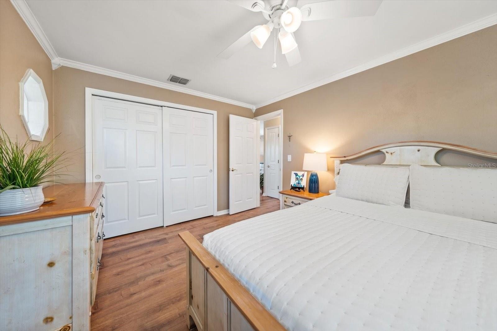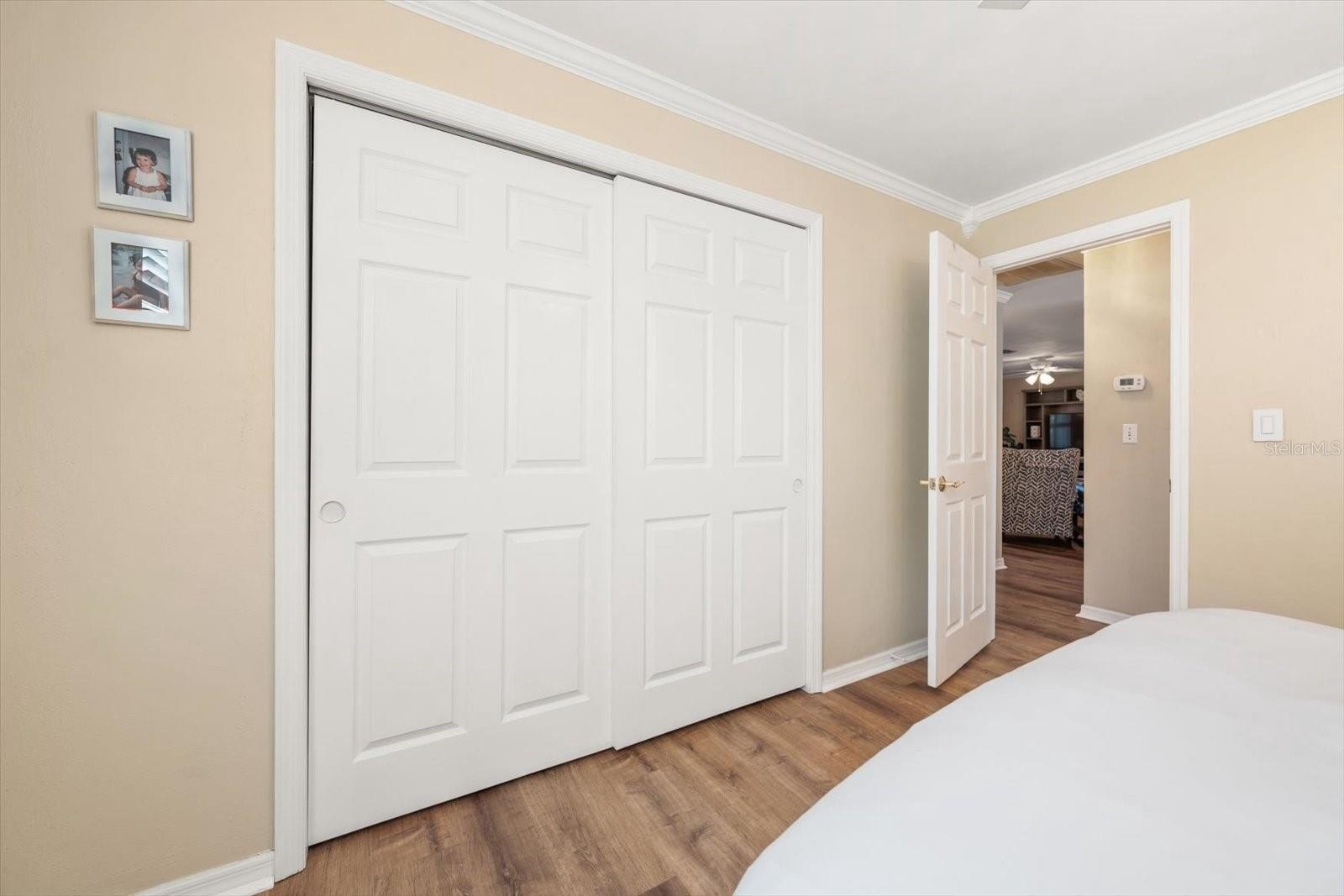 Perfectly positioned on a quiet street in a friendly, walkable neighborhood, this beautifully maintained home offers outstanding curb appeal with a circular driveway, mature landscaping, and a welcoming front porch. Step inside and pride of ownership is immediately evident, with fresh paint, luxury wide-plank vinyl flooring throughout, crown molding, and plantation shutters enhancing the bright, open floor plan. The sparkling white kitchen features abundant counter space and a sink overlooking the pool, flowing seamlessly into the dining area—ideal for everyday living and entertaining. French doors lead to a meticulously maintained backyard oasis with a newly resurfaced pool and new paver deck, creating the perfect setting to relax poolside or enjoy gardening with the convenience of a garden shed and endless possibilities for outdoor living. Both bedrooms are spacious and filled with natural light, offering generous closet space and sharing an updated hall bath. A versatile bonus/flex room makes an ideal home office, guest space, or multipurpose area, with an additional bathroom nearby for added convenience. An oversized garage provides excellent storage, and thoughtful upgrades include impact windows, an upgraded electrical panel with generator hookup, a new AC (2023), and an irrigation system with well. Ideally located close to shopping, restaurants, and beautiful beaches, this move-in ready home truly has it all.