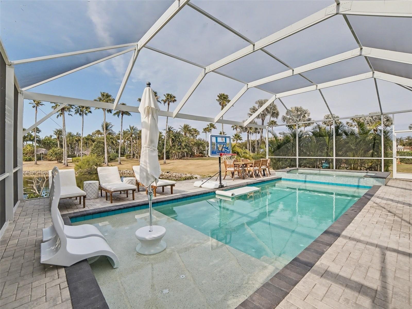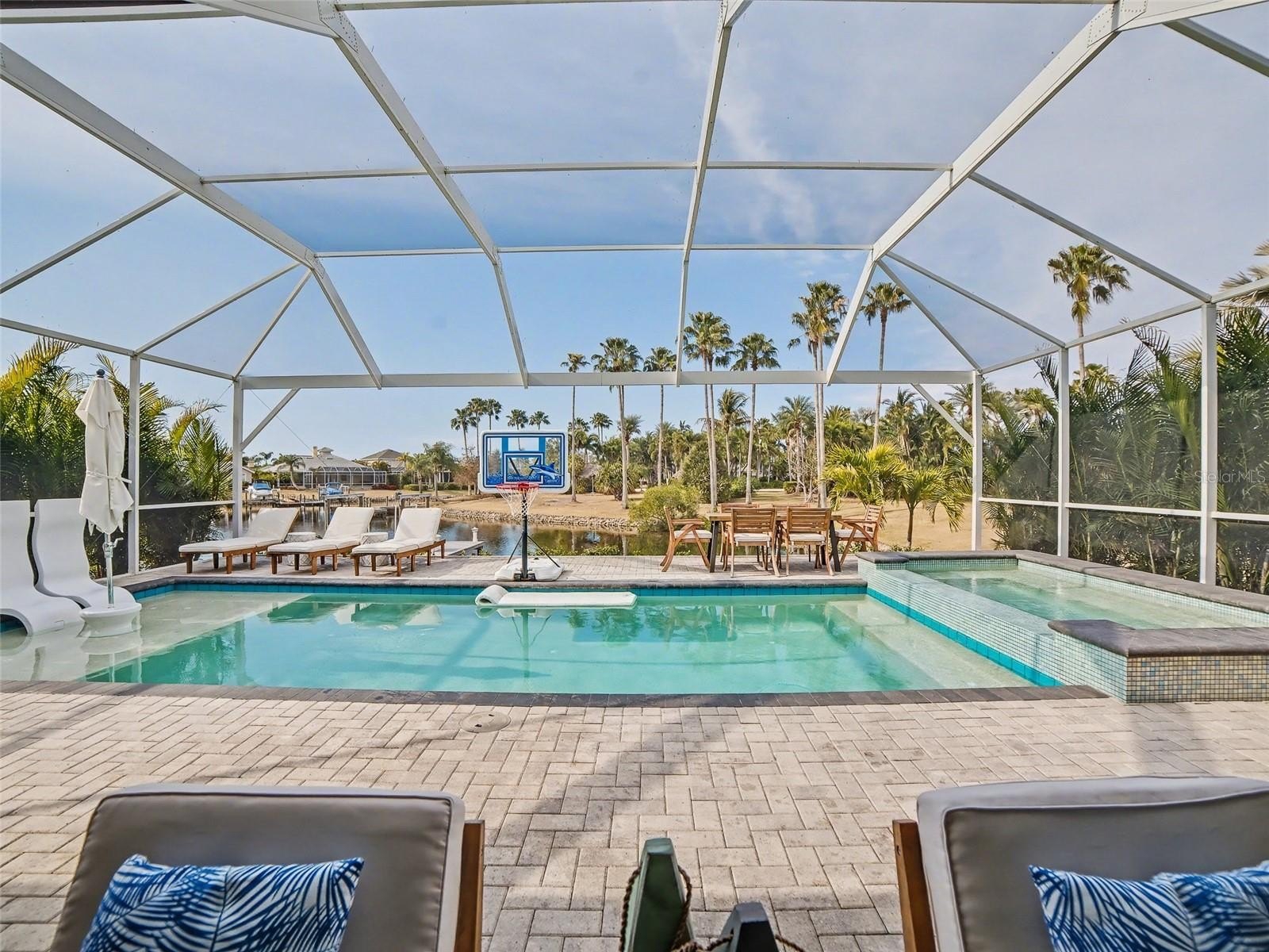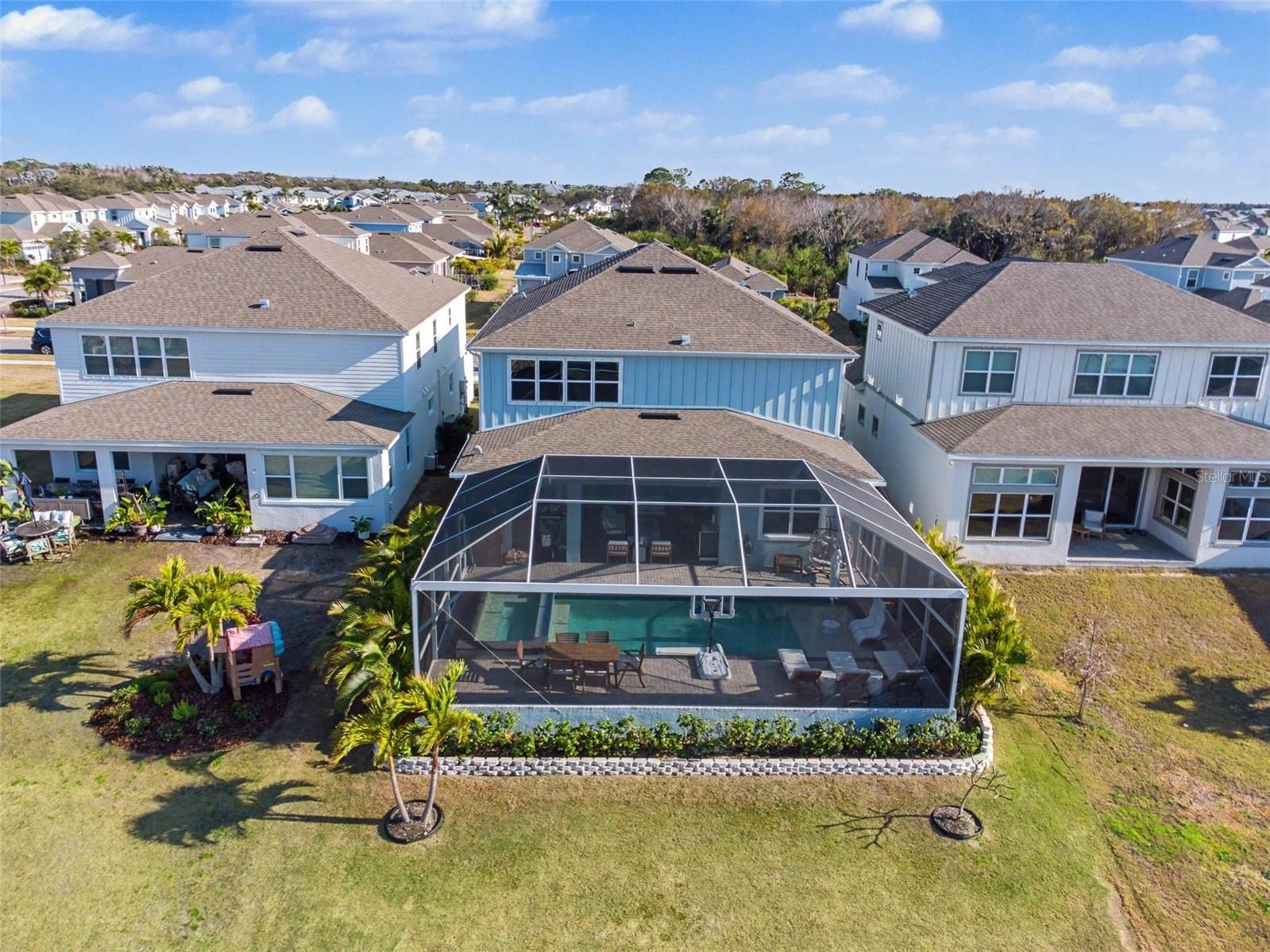 Refined Coastal Luxury in MiraBay — Lagoon Lot with Designer Upgrades & Resort-Style Outdoor Living. Welcome to an exceptional coastal residence in the highly sought-after MiraBay community, where refined design meets waterfront living along the shores of Tampa Bay. Perfectly positioned on a desirable lagoon lot, this stunning home offers an elevated lifestyle with seamless indoor-outdoor living, thoughtful upgrades, and beautifully curated finishes throughout. From the moment you arrive, timeless Key West architecture is enhanced by Kichler black coach lights, permanent soffit holiday lighting, lush landscaping with concrete curbing, and a brick paver driveway that creates striking curb appeal. A glass front door opens to a bright interior featuring luxury vinyl plank flooring throughout the main living areas, a striking spindle staircase, soaring 20-foot foyer ceiling, recessed lighting, surround sound speakers, and designer gold ceiling fixtures. The chef’s kitchen serves as the heart of the home, showcasing white and grey soft-close cabinetry, quartz countertops, a spacious center island with pendant lighting, farmhouse sink, stainless steel appliances, built-in oven and microwave, glass tile backsplash, cabinet hardware, and an elegant butler’s pantry with gold and nickel finishes. The open gathering room is filled with natural light through triple sliding glass doors, creating a seamless connection to the outdoor living space. The primary suite offers a peaceful retreat with tray ceiling and spa-inspired bathroom featuring grey cabinetry, quartz countertops, dual sinks with premium Moen gold faucets, gold mirrors and lighting, and a walk-in shower with rain head and decorative listello tile. A custom walk-in closet with built-in organization system completes the suite. Upstairs, a spacious bonus room plumbed for a future bar provides flexible living space perfect for a media room, game room, or lounge area. Bedrooms two and three share a Jack and Jill bathroom with dual sinks and tub/shower combination. Another secondary bedroom features its own ensuite bath, while bedroom five serves as a second primary suite with walk-in shower, glass enclosure, quartz countertops, grey cabinetry, and closet organizer. Designed for year-round enjoyment, the outdoor living area is a private oasis featuring a saltwater pool and spa with self-cleaning system, brick paver pool deck, pool cage with lighting, outdoor kitchen, ceiling fans, and a dedicated pool bath. Waterfront living is elevated by the lagoon setting and paid dock easement, offering the opportunity to build a private dock and launch directly from your backyard. From the lagoon, boaters can navigate through MiraBay’s waterways to Tampa Bay and onward to the open waters of the Gulf of America. The oversized laundry room includes cabinetry, quartz countertops, and utility sink, while additional enhancements include cabinets above toilets, premium fixtures, garage ceiling storage racks, and thoughtful storage solutions. MiraBay residents enjoy a waterfront clubhouse, lagoon-style pool with waterslide, lap pool, fitness center, spa services, café, marina, tennis and pickleball courts, parks, trails, and community events. This exceptional property offers the perfect blend of luxury, comfort, and coastal lifestyle in one of the area’s most desirable waterfront communities. MiraBay is a One of a Kind Community!