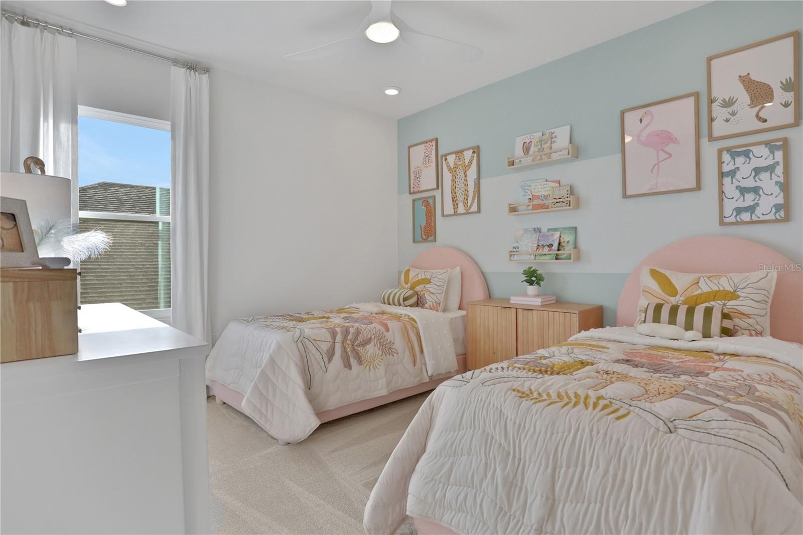 One or more photo(s) has been virtually staged. Welcome to the Ellington floor plan by Dream Finders Homes, a spacious two-story residence offering 5 bedrooms, 3.5 bathrooms, and 3,550 square feet of thoughtfully designed living space in Angeline. This open-concept home features laminate flooring throughout the great room, kitchen, dining area, and flex room, creating a seamless and inviting layout ideal for everyday living and entertaining. The chef-inspired kitchen showcases 42” cabinets with under-cabinet lighting, 3cm quartz countertops, a farmhouse sink, stainless steel appliances, and a herringbone tile backsplash. The primary suite offers a private retreat with tray ceilings, his-and-hers walk-in closets, and a spa-style en-suite bathroom featuring a glass-enclosed shower and quartz finishes. Bathrooms throughout the home include ceramic tile flooring, while the upstairs loft provides flexible space for a media room, home office, or additional living area. Located in the award-winning Angeline master-planned community, residents enjoy miles of trails, a community farm, future parks and lakes, a resort-style lagoon, top-rated STEM schools, and a planned city center with dining and entertainment. Conveniently positioned with easy access to Tampa and major highways, Angeline offers a forward-thinking lifestyle in a true city in the making.