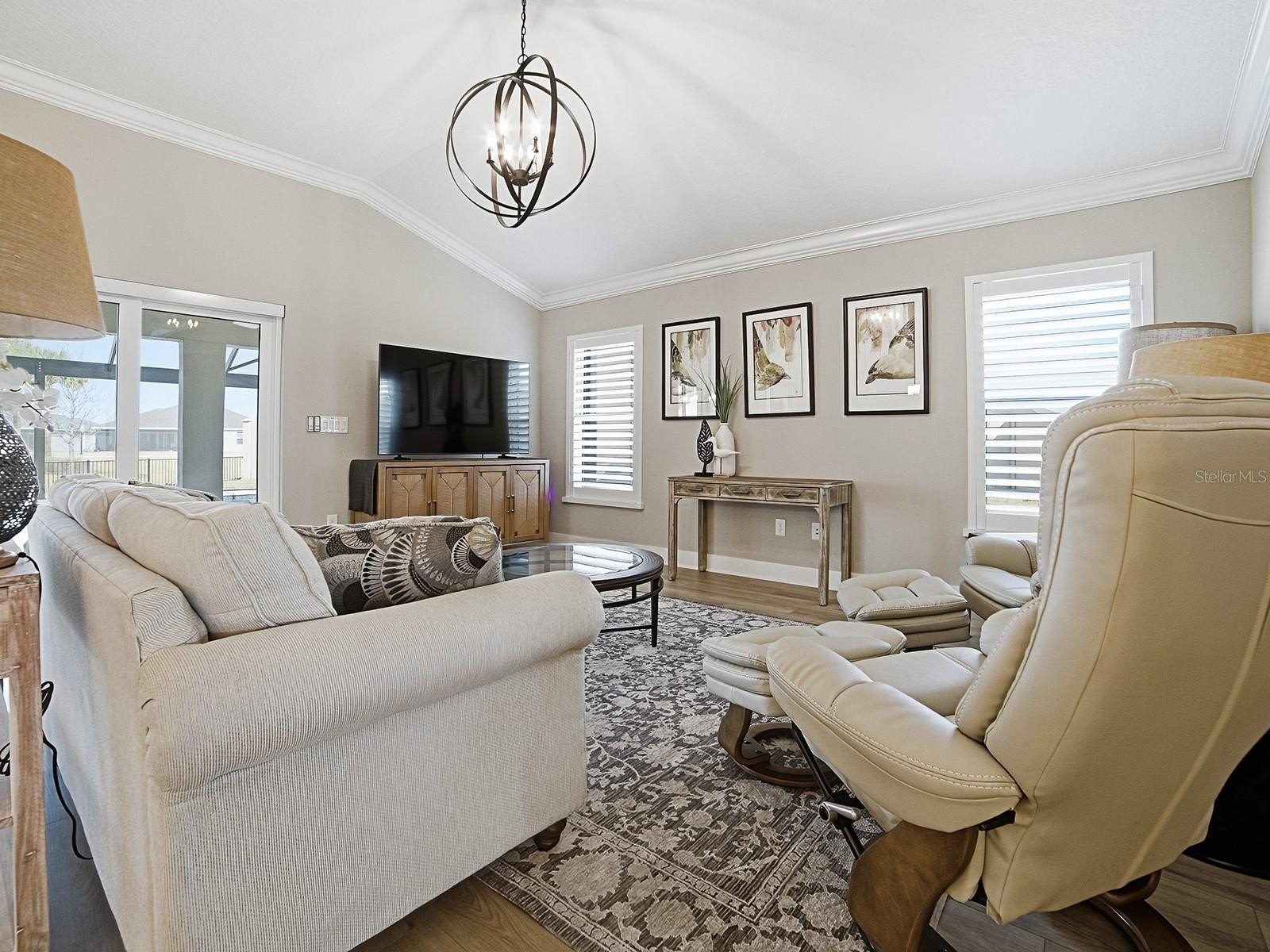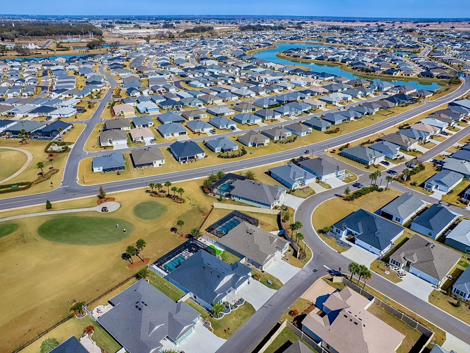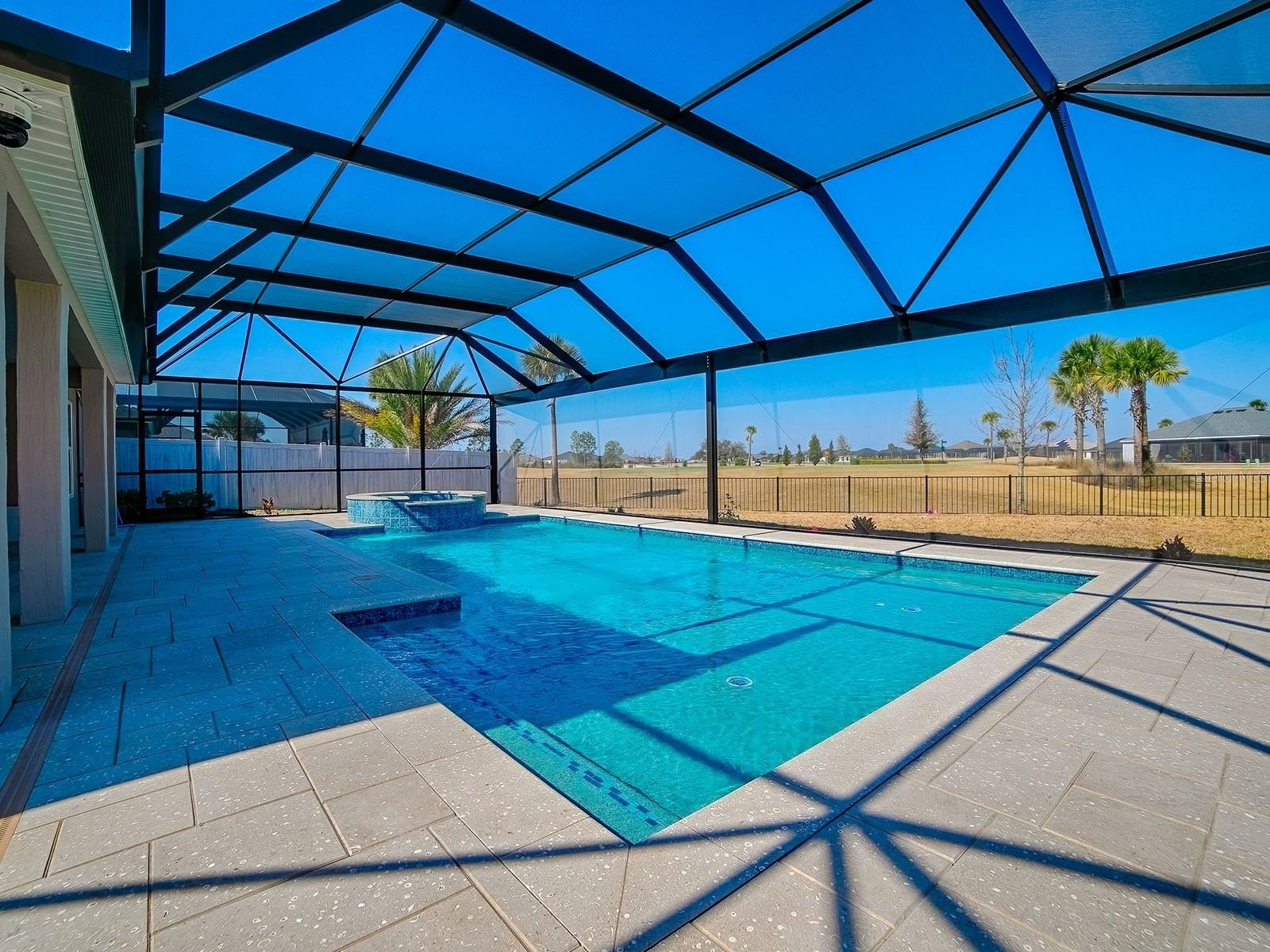 TURN KEY, Golf Course View w pool and spa, heated in this StUNNING, oversized yard with room for putting green, tiki bar and much more. This Monroe Veranda 3/2 with golf garage model must be seen to really appreciate. Home facing South with giant birdcage allowing plenty of poolside activity and fenced for your fur babies. Every detail has been taken care of in this ready to move into home that will allow the best Village living imaginable. Professionally decorated and everything stays. Garage has Epoxy floors and a closet system already installed as well as outside camera and security system. Crown molding throughout, tray ceilings, golf cart garage, and fenced with unblocked full golf view on Shallow Creek Championship golf course. Great neighbors and active Village of all Cement homes all part of this village also know as Eagles Nest preserve. This is a must see home 5 min from Eastport town square and also 5 min cart ride to the new Middleton Town square bosting more restaurants and shopping than most any area ever built in the Villages. Come see what all the excitement is about, you wont believe what this area has grown into.
