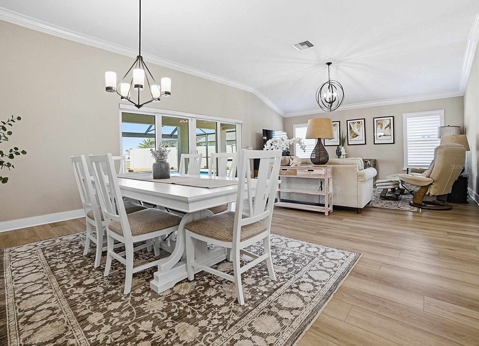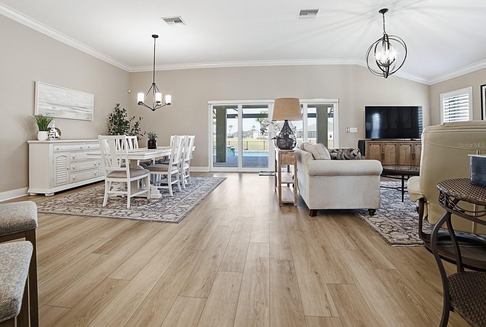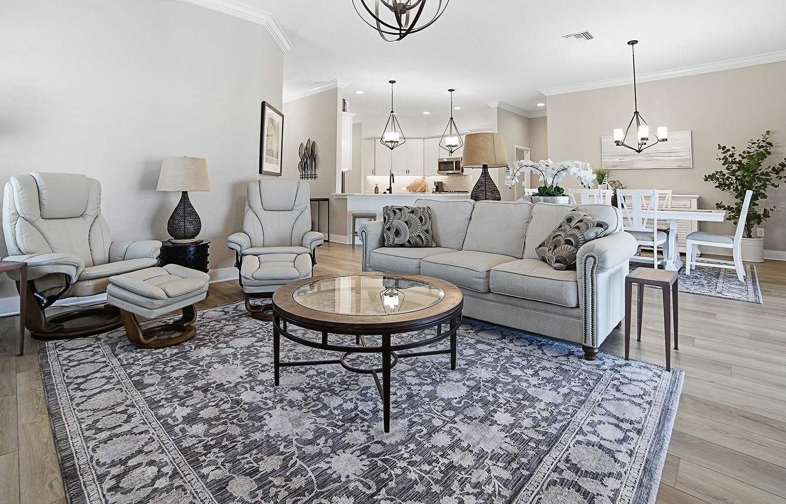 TURN KEY, Golf Course View w pool and spa, heated in this StUNNING, oversized yard with room for putting green, tiki bar and much more. This Monroe Veranda 3/2 with golf garage model must be seen to really appreciate. Home facing South with giant birdcage allowing plenty of poolside activity and fenced for your fur babies. Every detail has been taken care of in this ready to move into home that will allow the best Village living imaginable. Professionally decorated and everything stays. Garage has Epoxy floors and a closet system already installed as well as outside camera and security system. Crown molding throughout, tray ceilings, golf cart garage, and fenced with unblocked full golf view on Shallow Creek Championship golf course. Great neighbors and active Village of all Cement homes all part of this village also know as Eagles Nest preserve. This is a must see home 5 min from Eastport town square and also 5 min cart ride to the new Middleton Town square bosting more restaurants and shopping than most any area ever built in the Villages. Come see what all the excitement is about, you wont believe what this area has grown into.