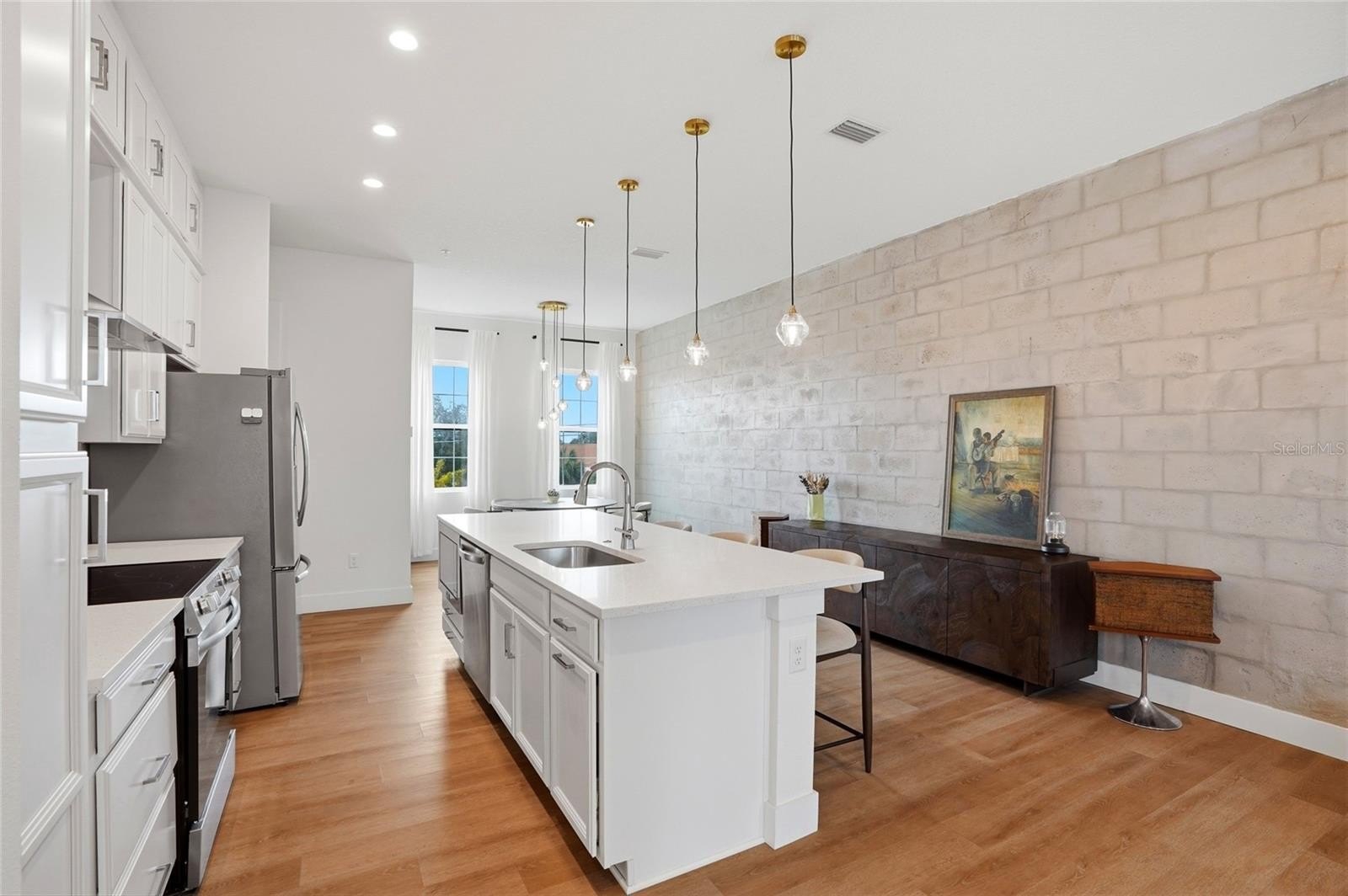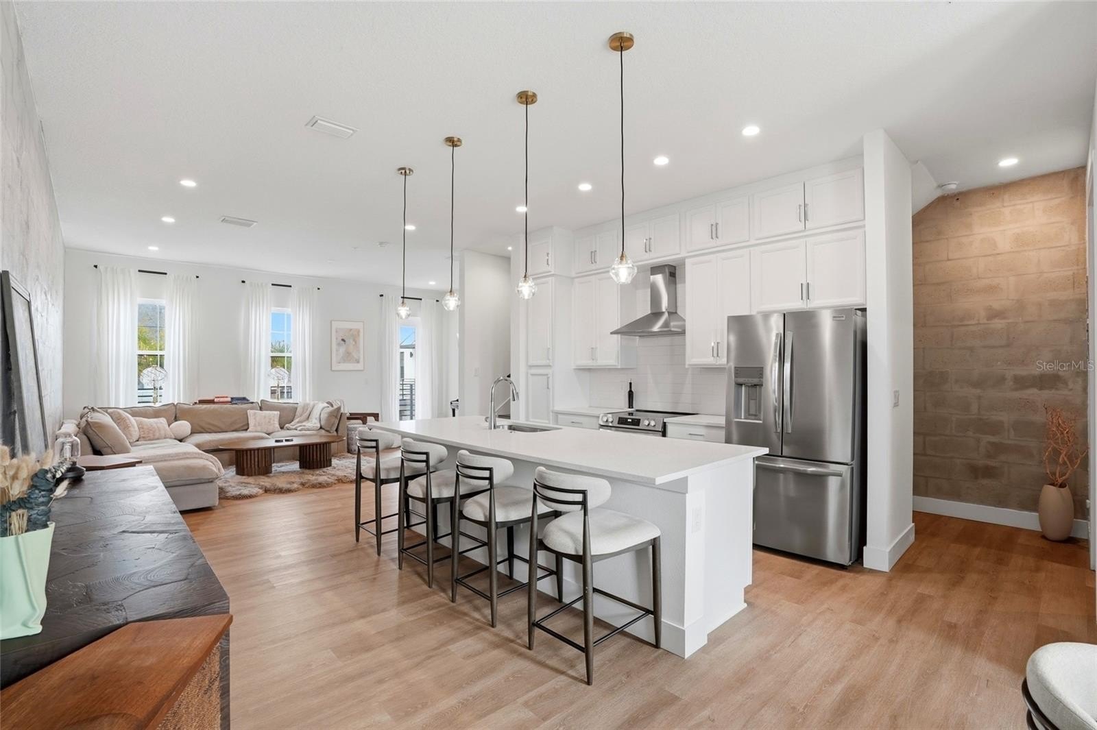An architecturally driven townhome designed for those who value form, function, and location. The soaring ceilings, expansive windows, and striking exposed concrete walls set the tone throughout this home. This home is thoughtfully designed across three levels. The entry level welcomes you with polished concrete floors and a private ensuite bedroom ideal for guests, a creative studio, or a quiet home office. Upstairs, the main living level unfolds into a loft-style open concept space anchored by a chef-inspired kitchen featuring quartz countertops, white cabinetry, stainless steel appliances, and an oversized island with seating for effortless entertaining. A convenient half bath completes this level.