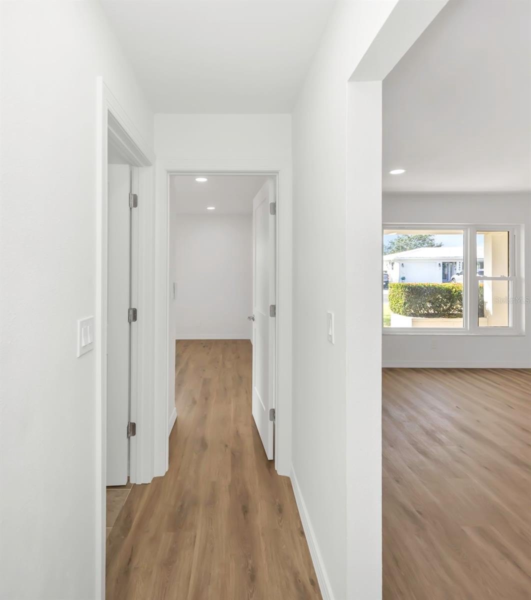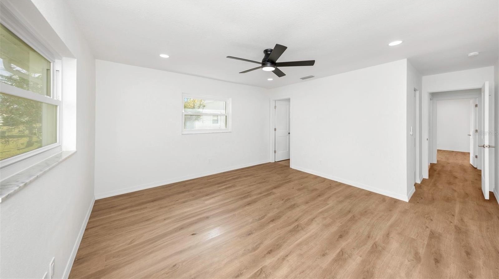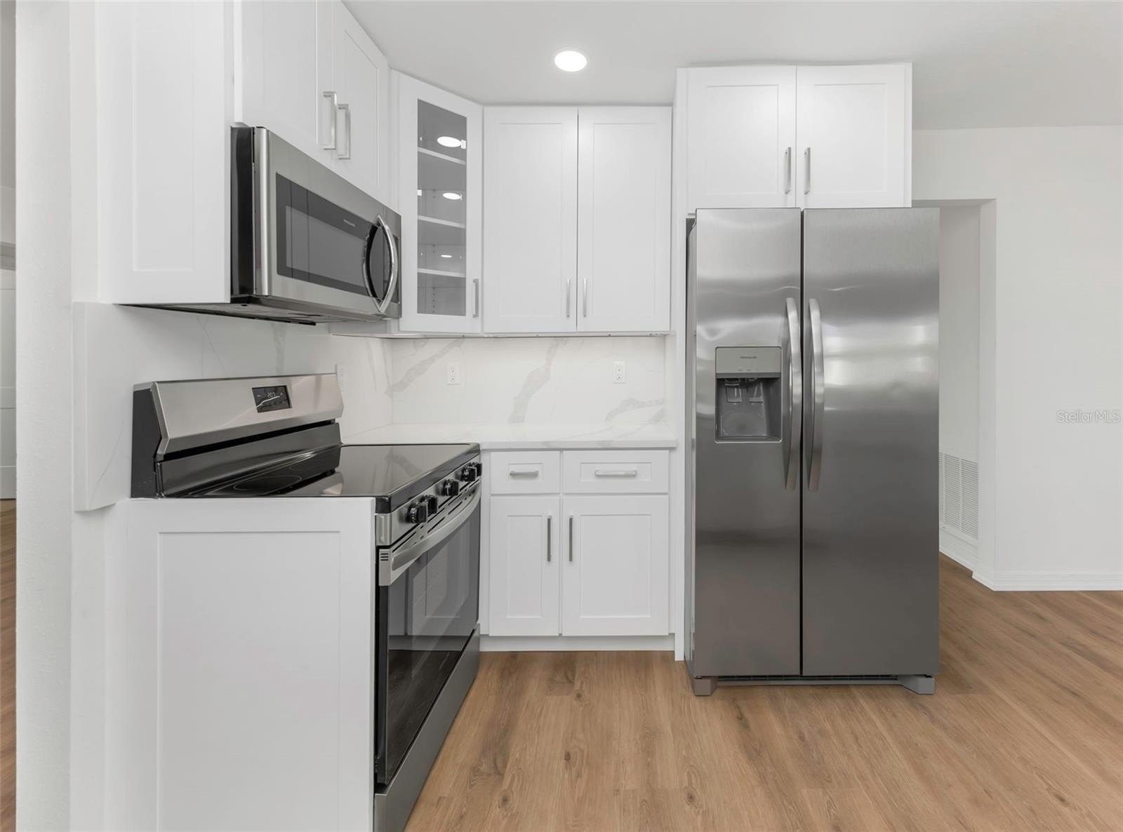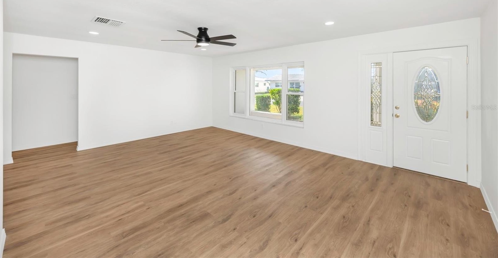 The oversized covered front porch welcomes you into this completely renovated home in the desirable Mainlands of Tamarac 55+ community. Featuring impact-rated windows and a front door with decorative glass and sidelight, this move-in ready residence offers style and peace of mind. Inside, enjoy over 1,600 square feet of new waterproof vinyl plank flooring with no transitions, neutral colors, recessed lighting, and ceiling fans throughout. The updated kitchen showcases white shaker cabinets — including select glass-front cabinets for a modern touch — quartz countertops, stainless steel appliances, and under-cabinet lighting. Retreat to the spacious primary suite featuring a walk-in closet and a stylishly renovated en-suite bath. The second bedroom includes built-in closets for ample storage and functionality. Both bathrooms have been fully updated with tiled showers (no tubs), new vanities, and contemporary finishes throughout. Washer and dryer with utility tub are located in the garage, which also features a reinforced garage door and newly finished floor. Affordable monthly maintenance fee of $485 includes roof repair and replacement, lawn care, exterior painting, water, sewer, trash, reclaimed water irrigation, internet, and two digital cable boxes — providing exceptional value and peace of mind. Mainlands community offers clubhouse, heated in-ground pool, shuffleboard courts, and a full calendar of activities. The neighborhood surrounds an 18-hole public golf course and is adjacent to Freedom Lake Park, featuring paved walking trails around two lakes, outdoor fitness equipment, bocce courts, playground, picnic pavilions, dog park, and sailboat racing. Conveniently located near shopping, dining, medical facilities, banking, and cultural and sporting venues.