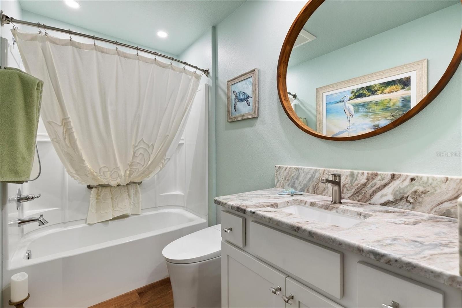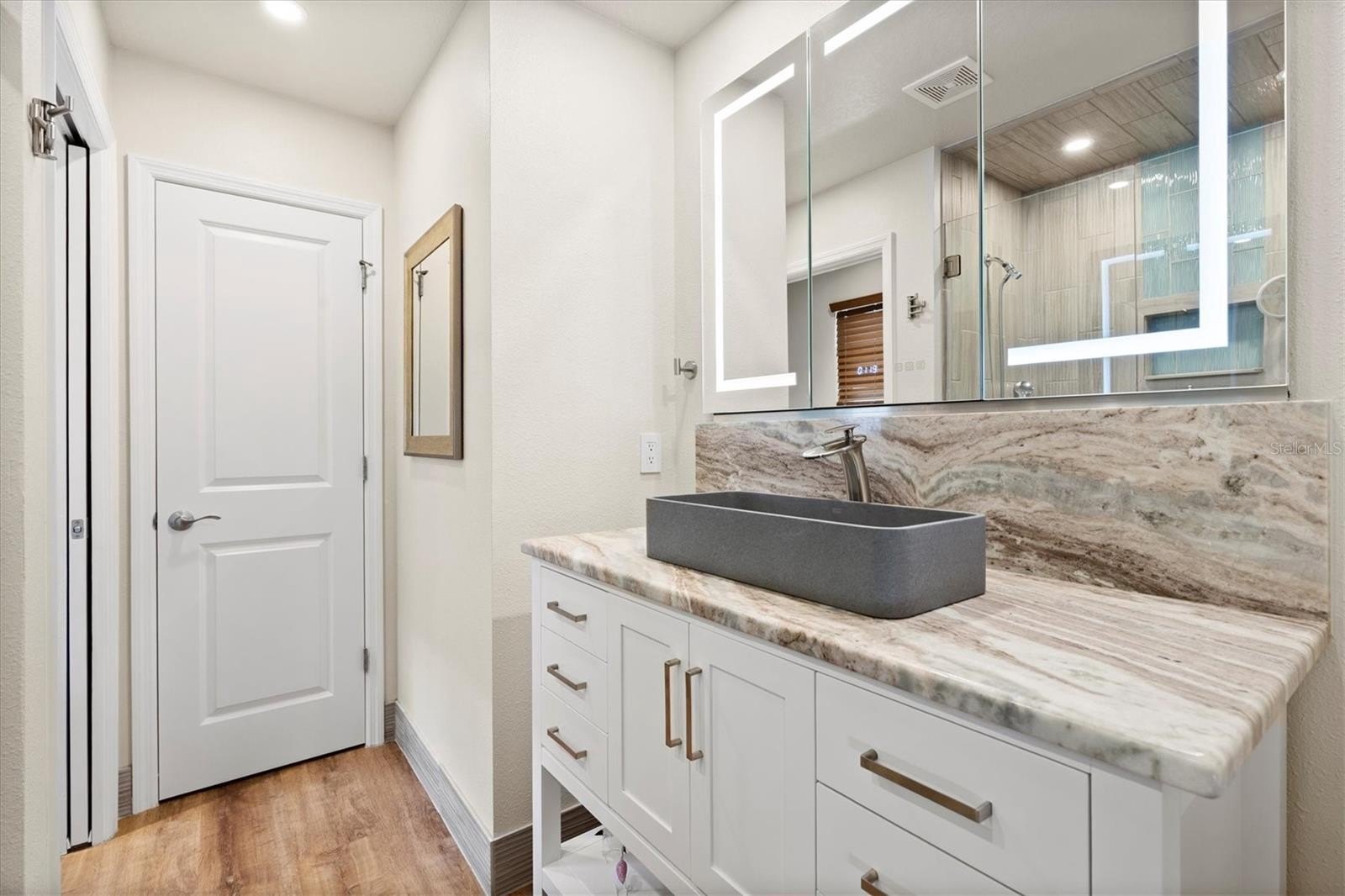 My master bathroom received the same level of attention. Full TILED SHOWER with a TEAK seat, 3/8-inch shower glass doors, new DELTA plumbing fixtures, a Smart medicine cabinet, and an EPLO smart toilet. New vanity, new granite top with backsplash, new faucet every detail deliberate. My guest bath holds its own as well, with a granite countertop, its own toilet, and new FIXTURES