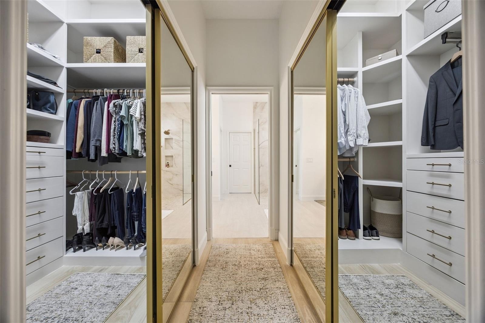 **The primary suite serves as a private sanctuary, showcasing an oversized bedroom, decorative wood-plank tray ceiling, elegant gas fireplace, French door opening to the lanai, and dual custom walk-in closets. The spa-inspired primary bath features a luxurious soaking tub, oversized walk-in shower, custom vanity, and a pocket-door connection to an adjoining office complete with built ins and hideway walk in closet—ideal space for a den, nursery or private retreat.