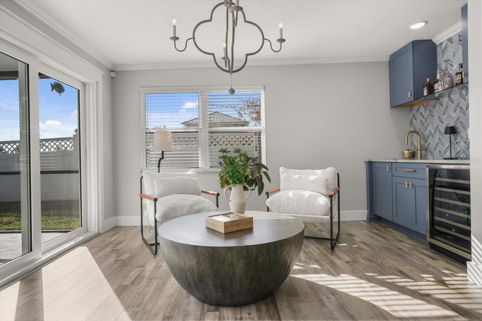 The stunning kitchen is truly the heart of the home, thoughtfully redesigned with all new soft-close upper and lower cabinetry, full-extension drawers, and pull-outs for optimal storage. Quartzite countertops, a subway tile backsplash, under-cabinet lighting, and a large island with bar seating and a farmhouse sink create a beautiful and functional gathering space. A Bosch dishwasher (2023), 36” five-burner gas range with oven, and an expansive custom walk-in pantry with frosted-glass pocket doors and motion lighting complete the space. Just off the main living area, a custom bar adds even more entertaining appeal, featuring soft-close cabinetry, glass shelving, brass fixtures, quartzite counters, tiled backsplash, and a wine refrigerator.