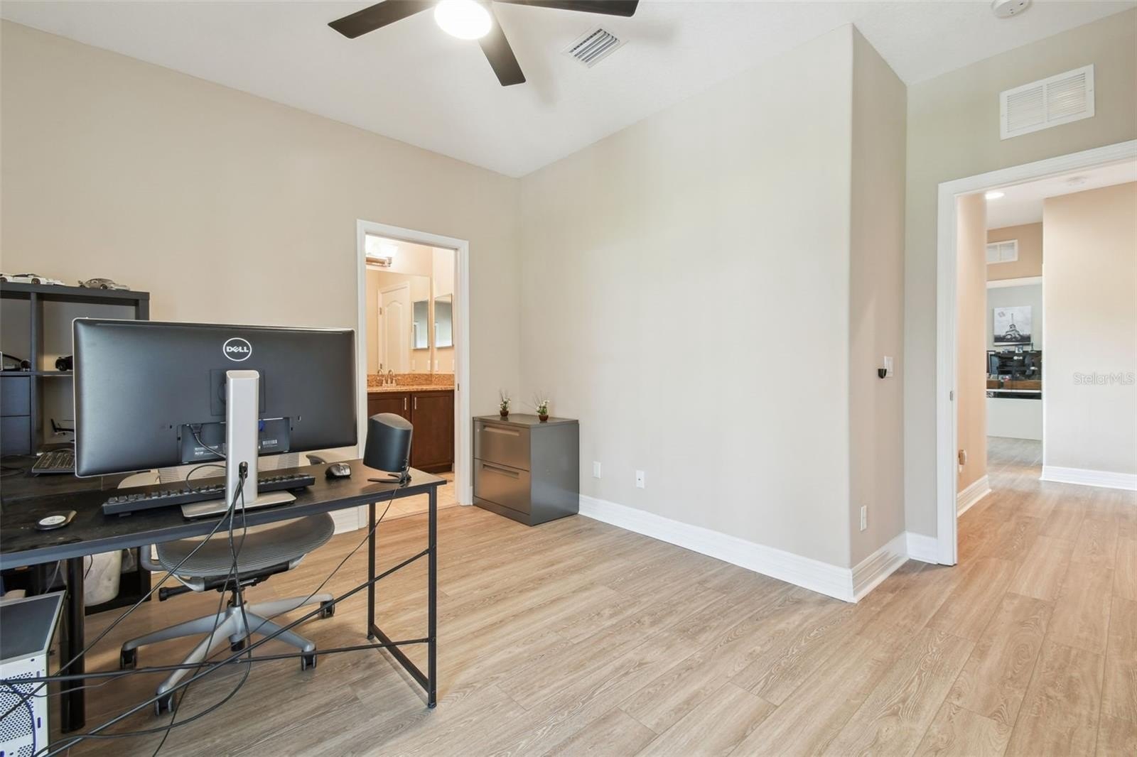The main level offers exceptional convenience with a private in-law or guest suite featuring its own en-suite bath with large walk-in shower, complemented by a separate full pool bath and an additional half bath for guests when visiting.