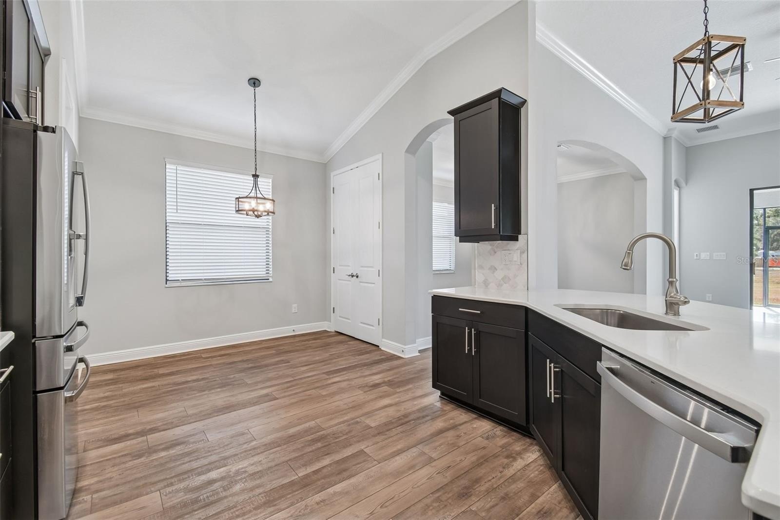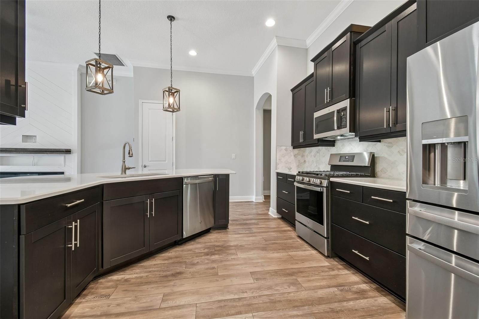 Wide luxury vinyl plank flooring flows effortlessly from room to room, while tile bathrooms and crown molding throughout add a timeless, finished touch. At the heart of the home, the kitchen invites connection, featuring quartz countertops, GE Cafe stainless steel appliances, and a gas range—perfect for morning coffee, shared meals, and conversations that linger.
