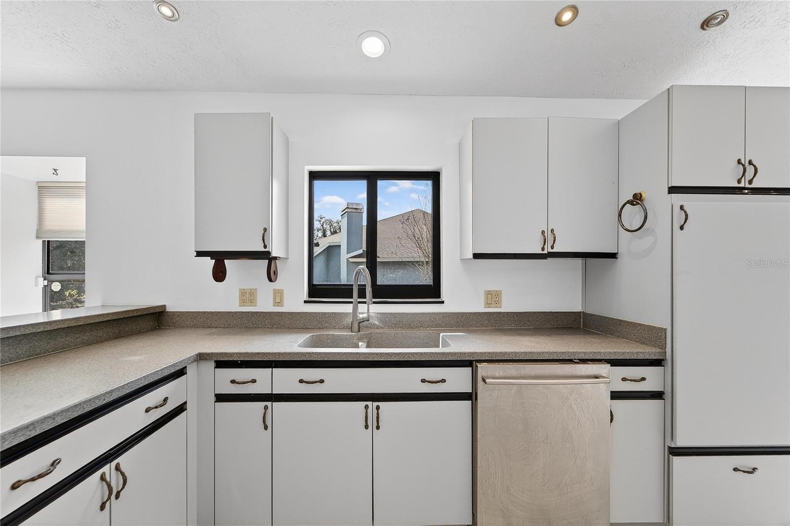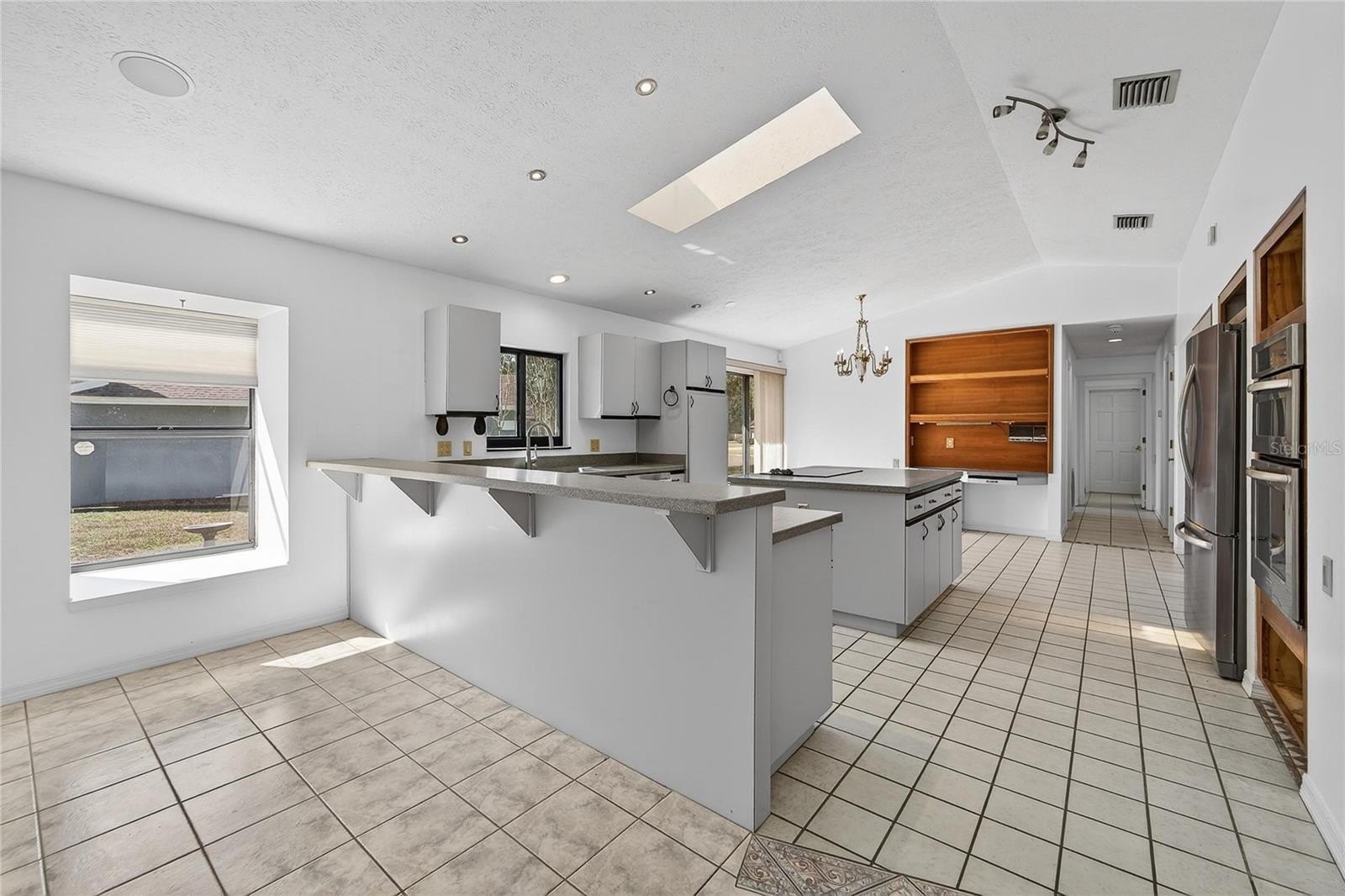 The kitchen sits right where it should — connected to everything. Plenty of SPACE, Cabinet space and has a FANTASTIC layout.