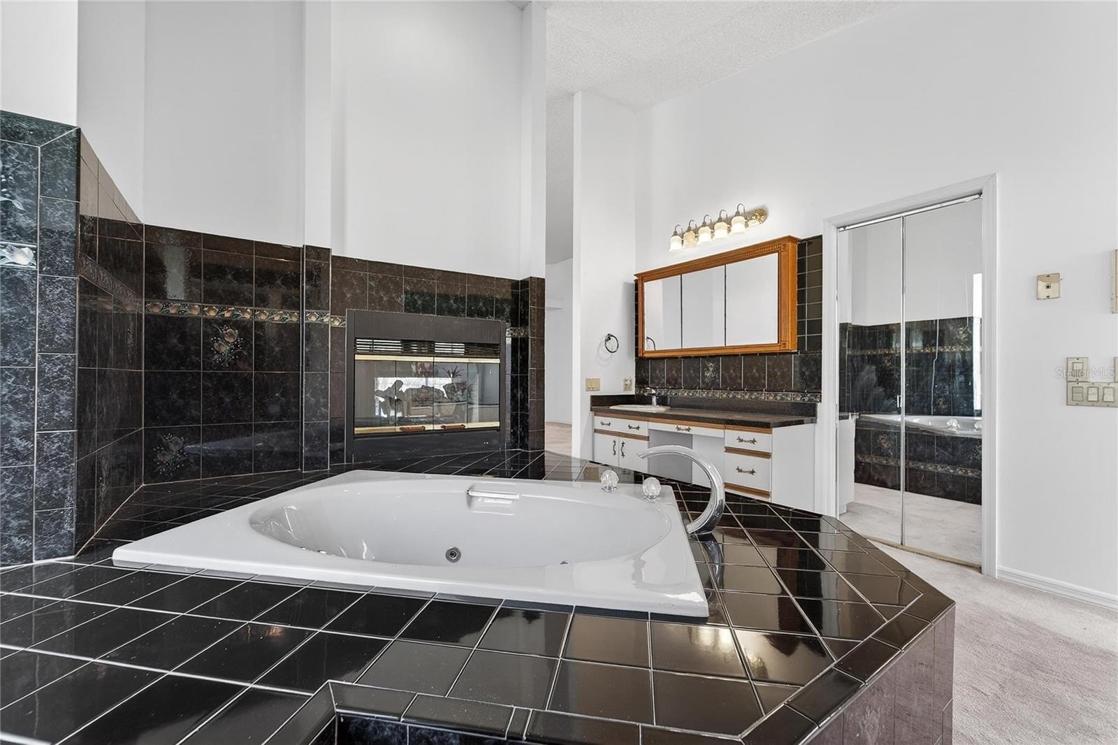 The MASTER SUITE is private and oversized with high ceilings, a WOOD-BURNING FIREPLACE, and triple sliding glass doors leading directly to the HEATED POOL. The bathroom offers dual vanities, a garden soaking tub, separate walk-in shower, and a large walk-in closet.
