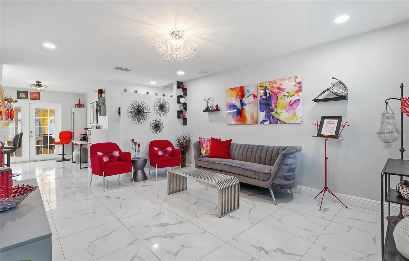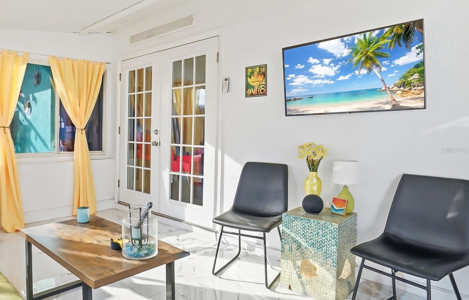 Interior features wood cabinetry, quartz countertops, newer stainless appliances, LED lighting, USB outlets, porcelain tile flooring, newer carpet in two bedrooms, indoor washer/dryer (conveys), Schlage smart lock, Ring doorbell, and transferable soft water/filtration system. The Florida bonus sunroom includes a mini-split A/C and new window screens (in progress).