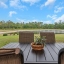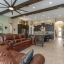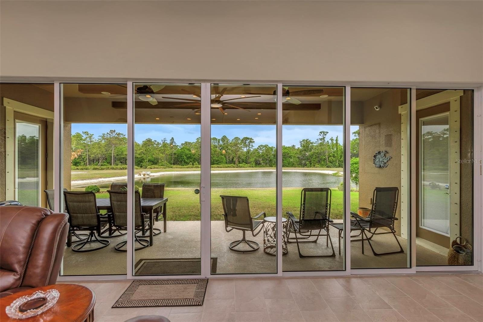 A paver driveway leads to an oversized covered front porch, perfect for relaxing or welcoming guests. Step through the etched-glass entry and enjoy a dramatic sightline straight through the home to the stunning pond and conservation view beyond. Soaring 12-ft tray ceilings, elegant architectural details, and a 25-ft wall of sliding glass doors create a breathtaking front-to-back visual. Large windows throughout flood the home with natural light, enhancing the open-concept grand room with decorative ceiling beams and designer finishes.