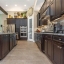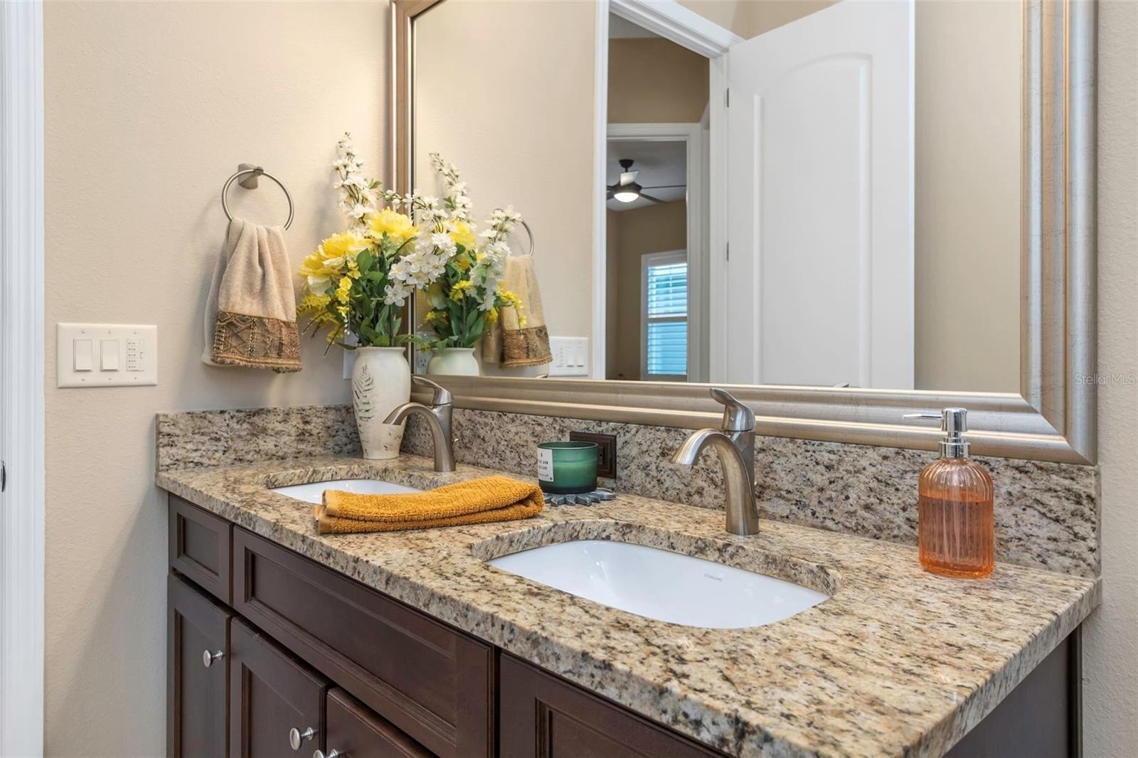 The gourmet kitchen features espresso cabinetry, marbled granite countertops, GE Café appliances, 5-burner gas cooktop, custom backsplash, and an oversized island ideal for gathering and entertaining. Dimmable lighting, plantation shutters, premium fixtures, and smart-home features add both comfort and sophistication.