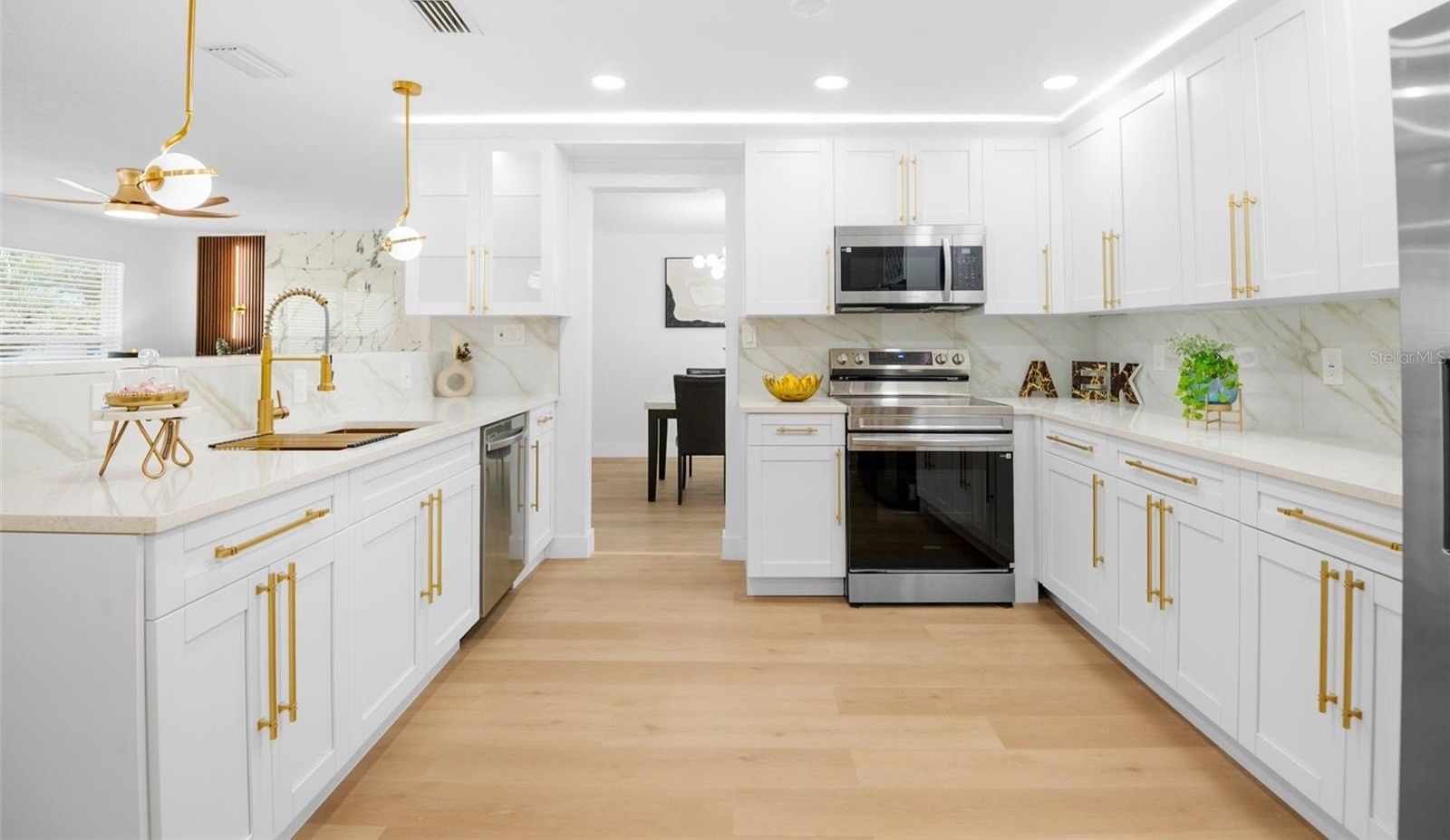 Absolutely Gorgeous & Fully Renovated 4-Bedroom Home! Prepare to be impressed by this meticulously renovated 4-bedroom, 2-bath, 2-car garage residence, where charm meets modern luxury. From the moment you step inside, you’ll be greeted by a bright, open floor plan that seamlessly combines the living, dining, and kitchen areas. The entire main living space is finished with brand-new, contemporary, water-resistant vinyl wood flooring for style and durability. The stunning new kitchen is a showstopper — spacious, well-lit, and designed for both function and beauty. It features an abundance of quartz countertops, a modern tile backsplash, all-new soft-close shaker hardwood cabinets, and brand-new Samsung stainless steel appliances. The generous master suite offers a spa-like retreat with an en-suite bath featuring gorgeous tile work, dual sinks, glass shower walls, a walk-in closet, and a stylish barn door entry. The additional bedrooms are spacious and bright. Every inch of this home has been upgraded with high-quality finishes, including new baseboards, modern ceiling fans, LED lighting, new dimensional-shingle roof (2025), newer AC system & units, newer windows, fresh interior and exterior paint, and lush new sod in the front and back yards. This home radiates curb appeal and is ideally located just a few steps from Taylor Park, and just a short drive from the beach, shopping, dining, schools, and recreation. Mint condition — all you need to do is move in and enjoy!