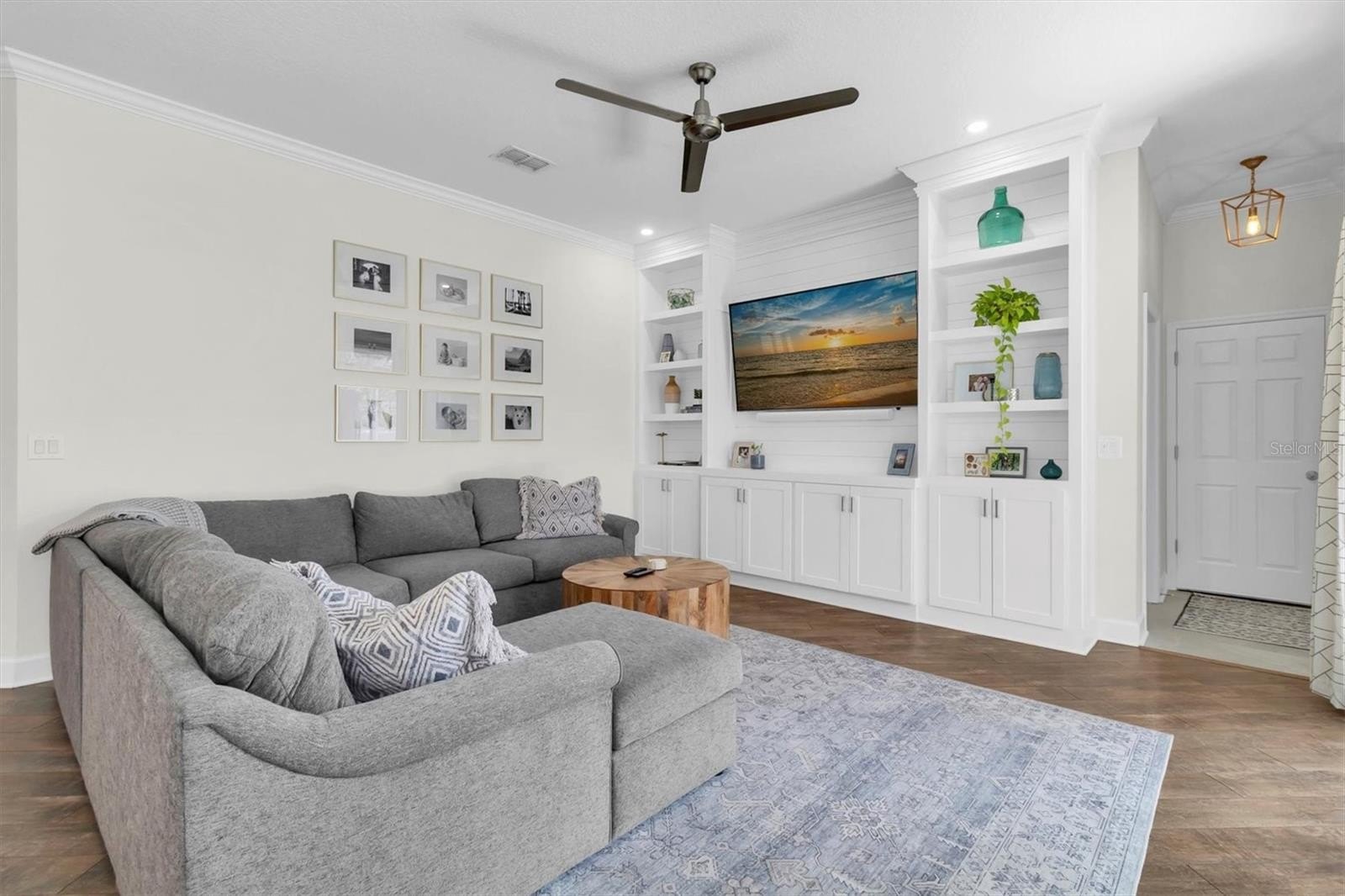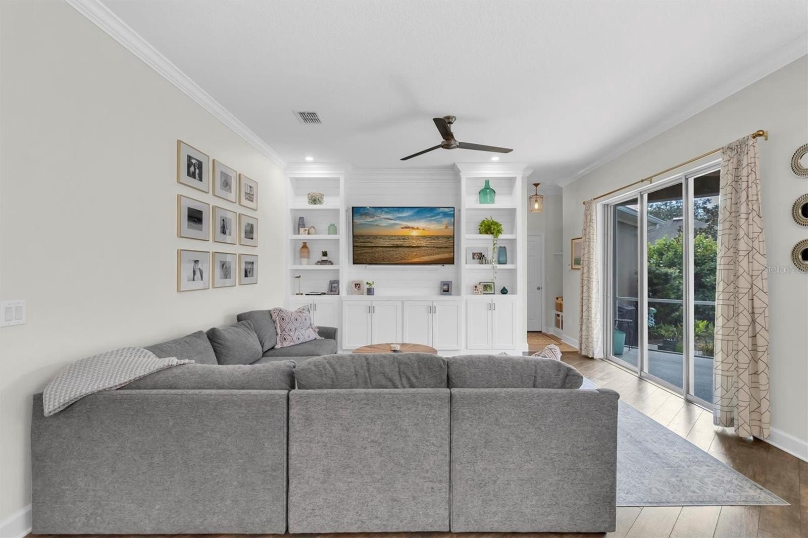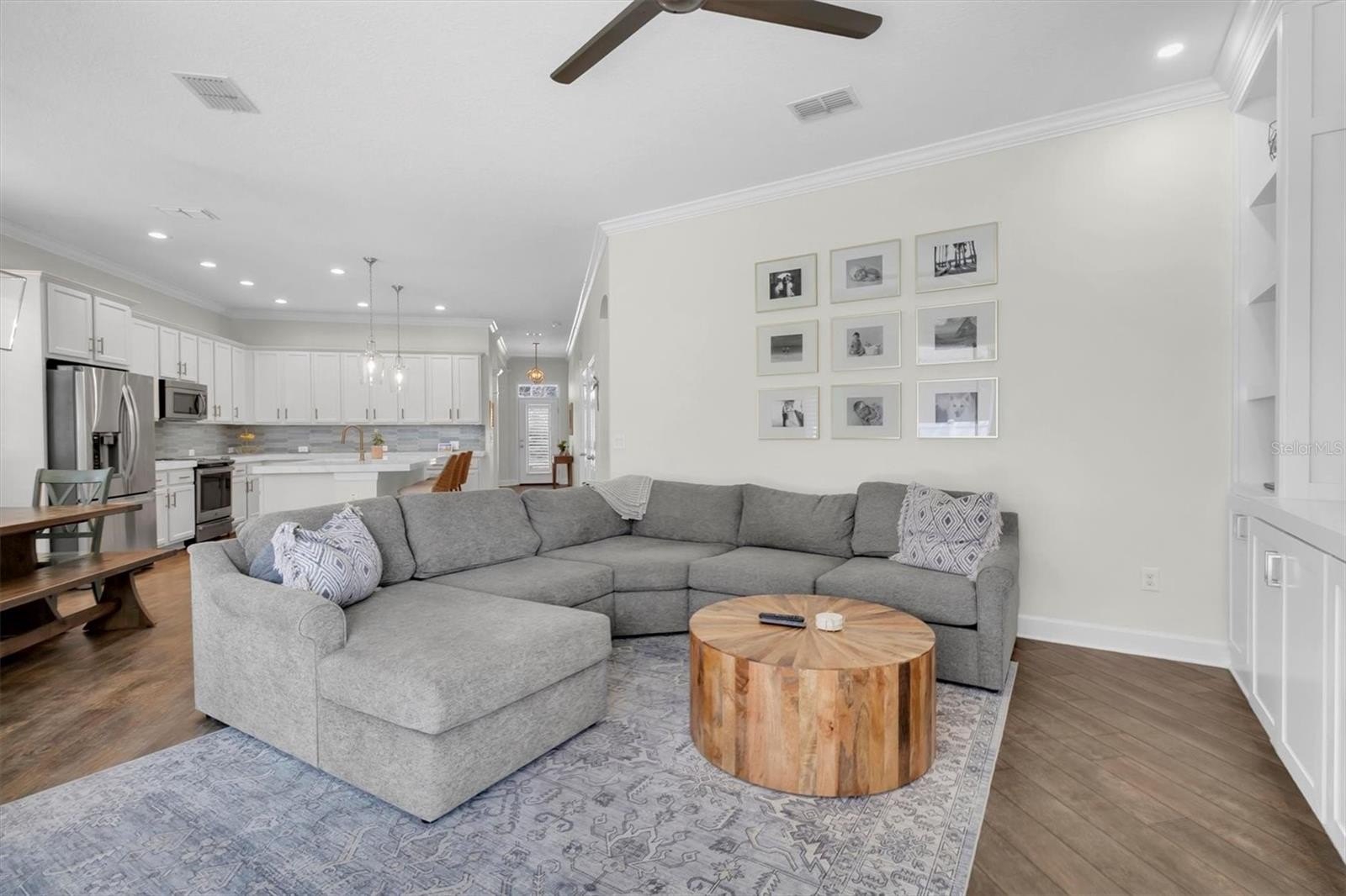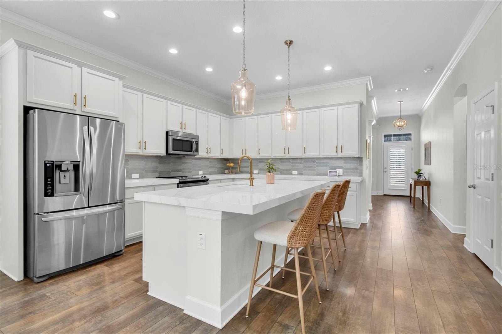 This highly sought-after David Weekley Woodlawn floor plan is a 3-bedroom, 2.5-bath home located in the desirable community of Longleaf and is loaded with upgrades throughout. The centrally located chef’s kitchen features stainless steel appliances, an electric stovetop pre-plumbed for easy gas conversion, an oversized island with breakfast bar, updated hardware, and was upgraded with stunning Cambria quartz countertops installed in 2024 in a rare, upgraded thickness along with new tile backsplash. The primary en-suite bathroom was fully remodeled and redesigned in 2024 with a fully enclosed glass shower, freestanding soaking tub, double-sink vanity and new flooring. The secondary bath was fully remodeled in 2025. Brand new air conditioning was installed in 2025. The interior has been recently repainted and recessed lighting added throughout. This home also includes a water softener. Crown molding accents the foyer, front room, main living room and primary bedroom, while plantation shutters on all windows add timeless elegance; the home is also pre-wired for surround sound. Custom living room and front office built-ins were installed in 2020, and the oversized interior laundry room and adjacent mini mudroom with custom shelving greets you from the garage entry. Enjoy an inviting front porch with plenty of room for everyone—perfect for relaxing and gathering—along with a fully fenced backyard featuring white PVC fencing for privacy and a clean, polished look. The two additional bedrooms share a versatile flex space ideal for use as a playroom, an additional living area, or hobby room. Longleaf offers a true small-town atmosphere with inviting front porches and a golf cart-friendly lifestyle, complete with an elementary school, village greens, three playgrounds, a dog park, heated community pool and spa, charming downtown shops and restaurants, tree-lined streets with wide sidewalks, a clay baseball field, soccer field, two miles of paved hiking and biking trails, natural greenbelts, fishing lakes, planned community events, beach volleyball, tennis and basketball courts, a Town Hall recreation building, multiple parks, and expansive green spaces, with a new phase adding additional parks and a second pool. Walking distance to the elementary school, shops, and restaurants, and conveniently located in the heart of Trinity near dining, shopping, hospitals, schools, and entertainment, this home is approximately 15 minutes to the beaches and 30 minutes to Tampa International Airport. No flood insurance required, and the home remained high and dry during recent hurricanes.
