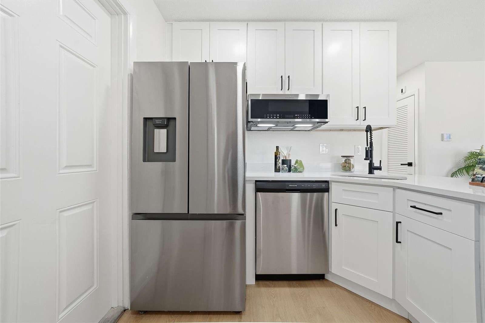 Inside, fresh interior paint and new luxury vinyl plank flooring create a bright, cohesive look throughout. The modern kitchen is completely updated with new cabinetry, fixtures, and appliances, highlighted by a sleek peninsula with white quartz countertops—ideal for both everyday living and entertaining.