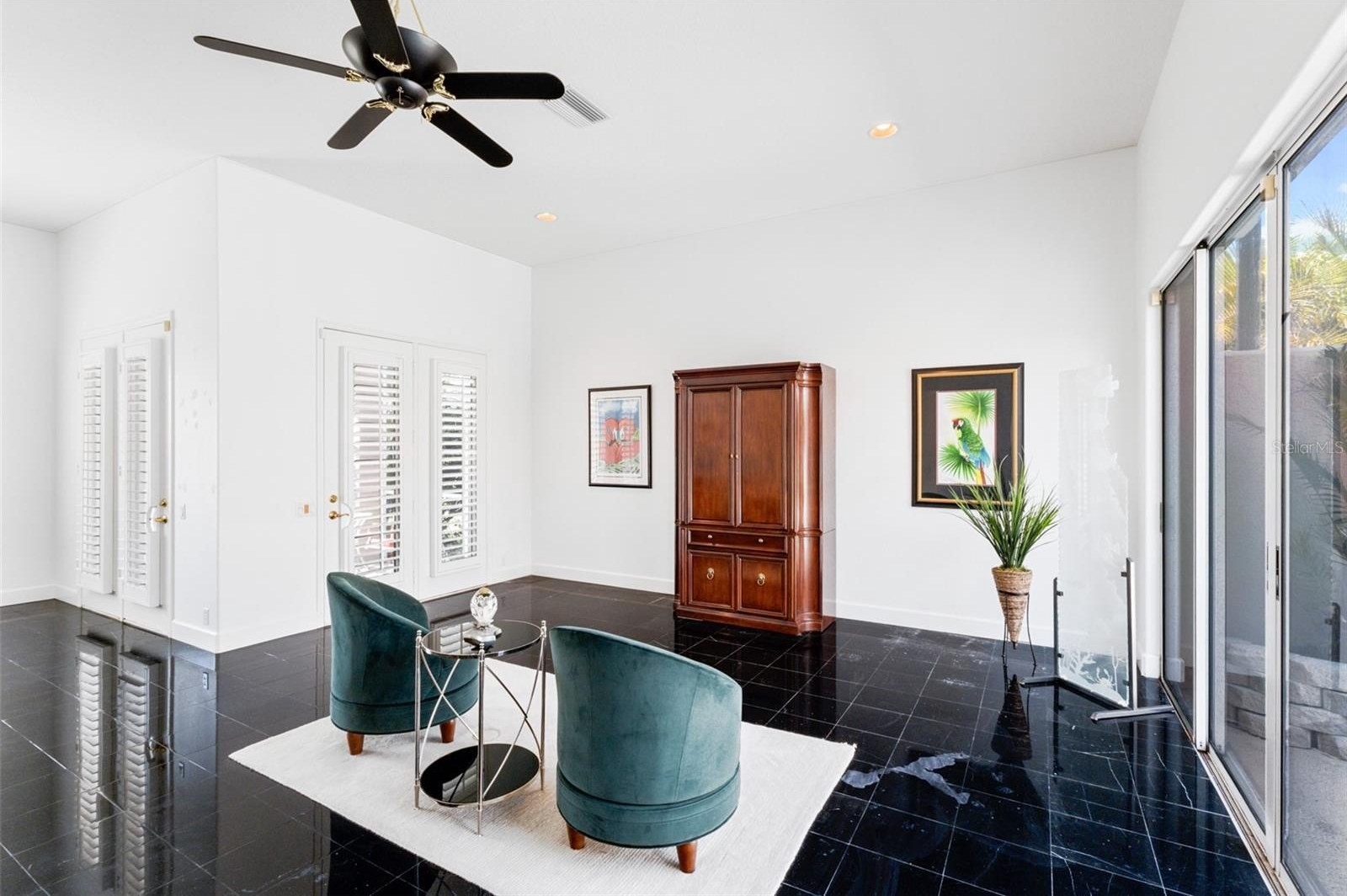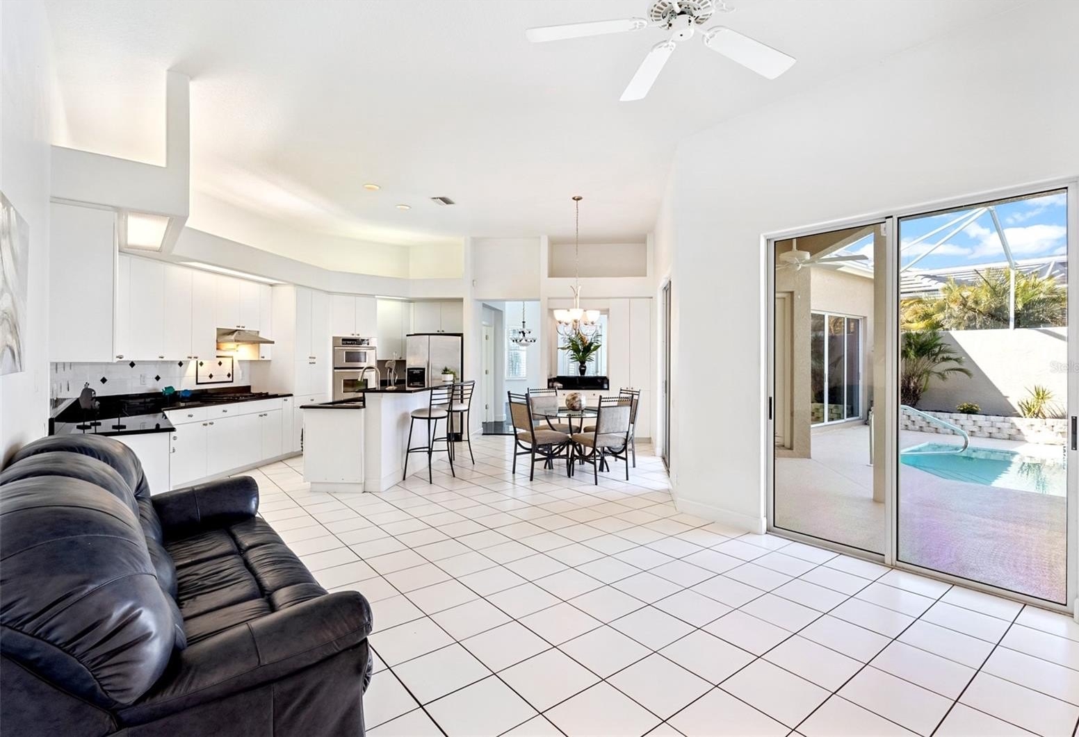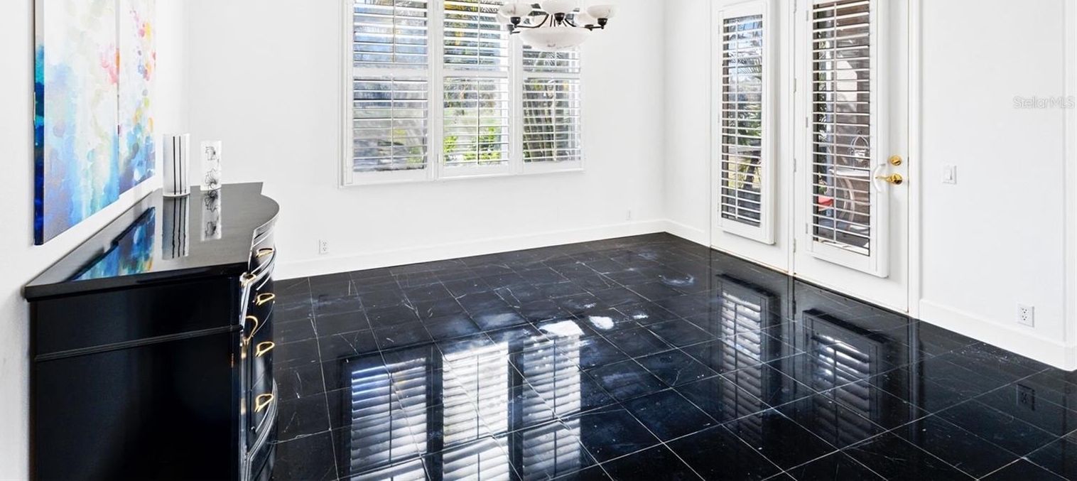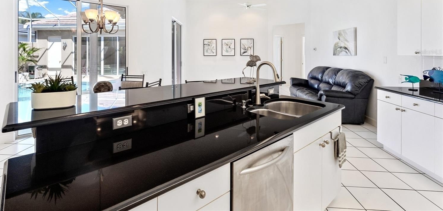 Inside, you’ll find marble tile flooring in the formal living and dining rooms, plantation shutters, and an abundance of natural light throughout. The open family room and kitchen combination is light, bright, and welcoming — complete with light cabinetry galore, tile backsplash, stone countertops, an eat-in dining space, and seamless access to the lanai. A convenient pool bath entrance enhances functionality for entertaining.