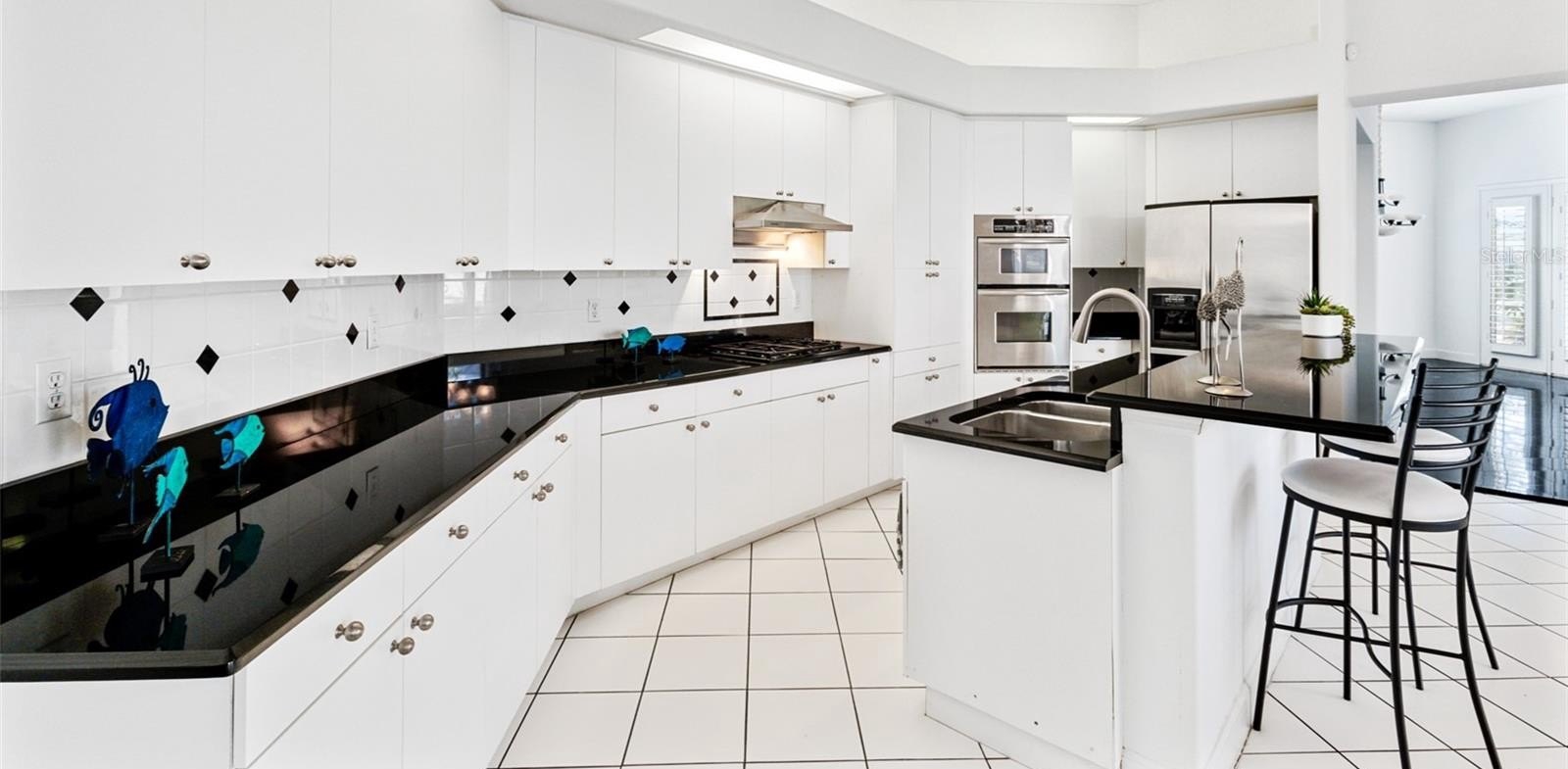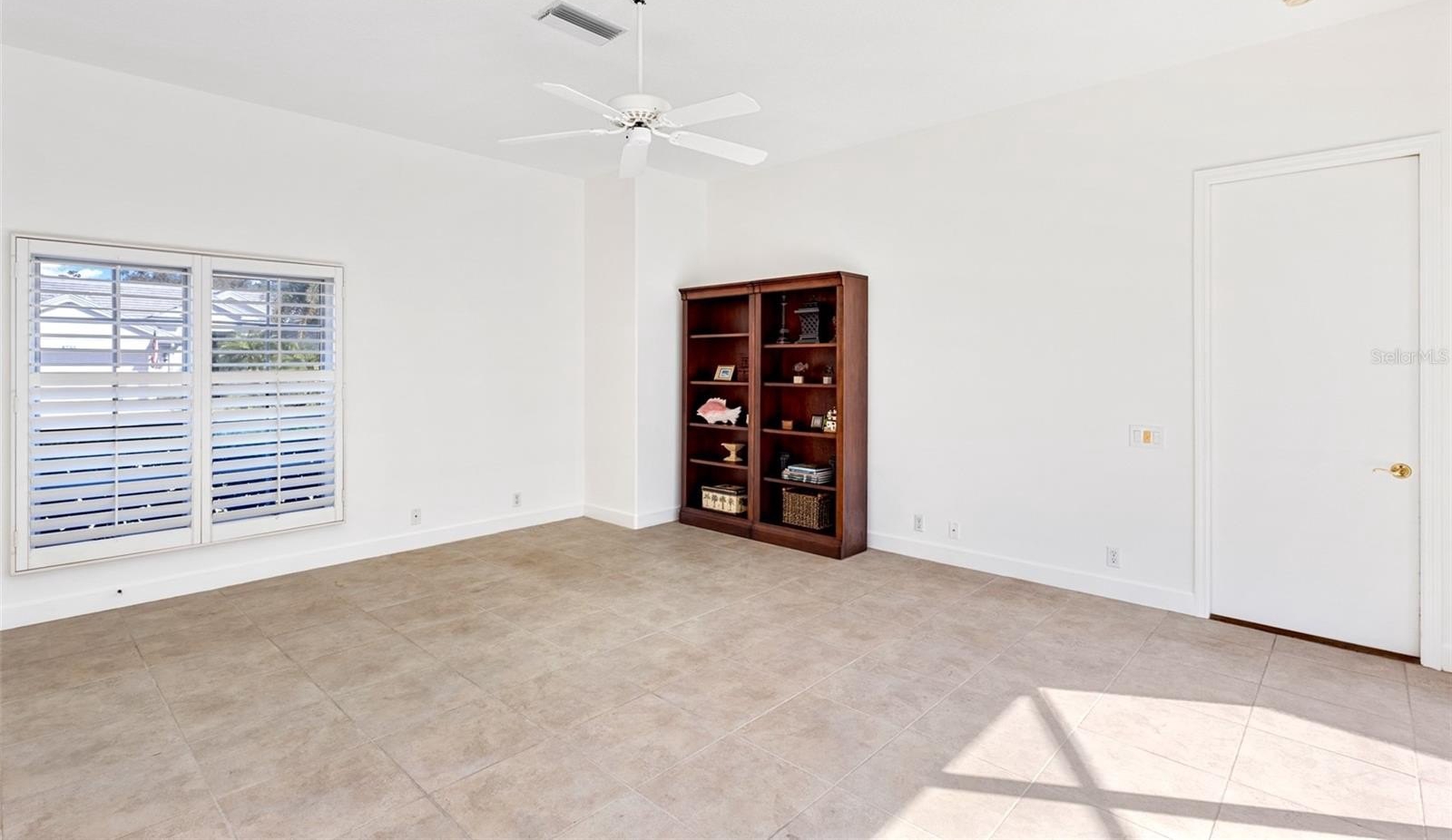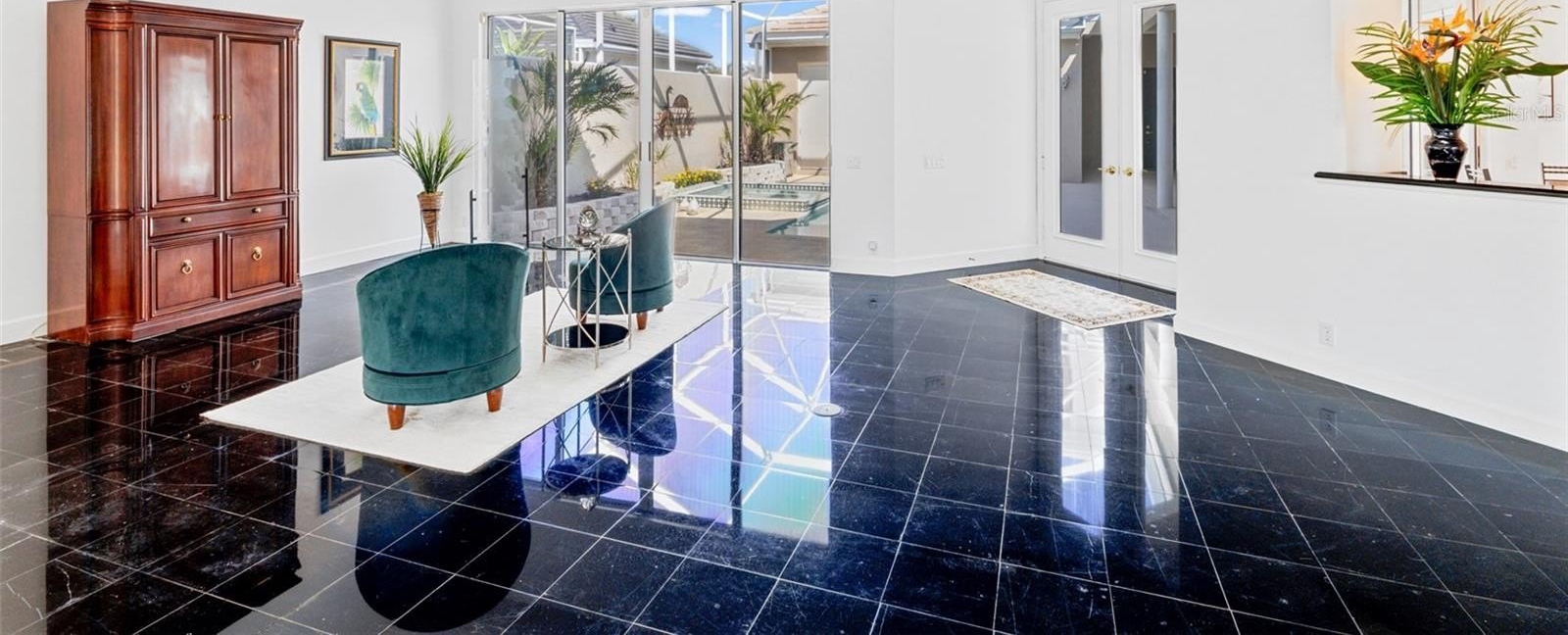 Inside, you’ll find marble tile flooring in the formal living and dining rooms, plantation shutters, and an abundance of natural light throughout. The open family room and kitchen combination is light, bright, and welcoming — complete with light cabinetry galore, tile backsplash, stone countertops, an eat-in dining space, and seamless access to the lanai. A convenient pool bath entrance enhances functionality for entertaining.