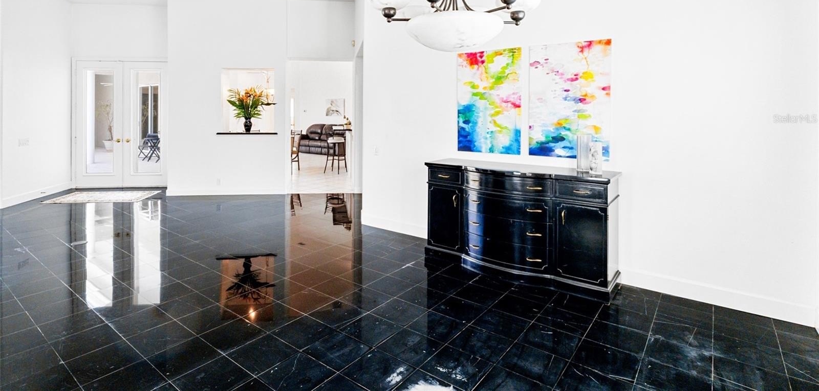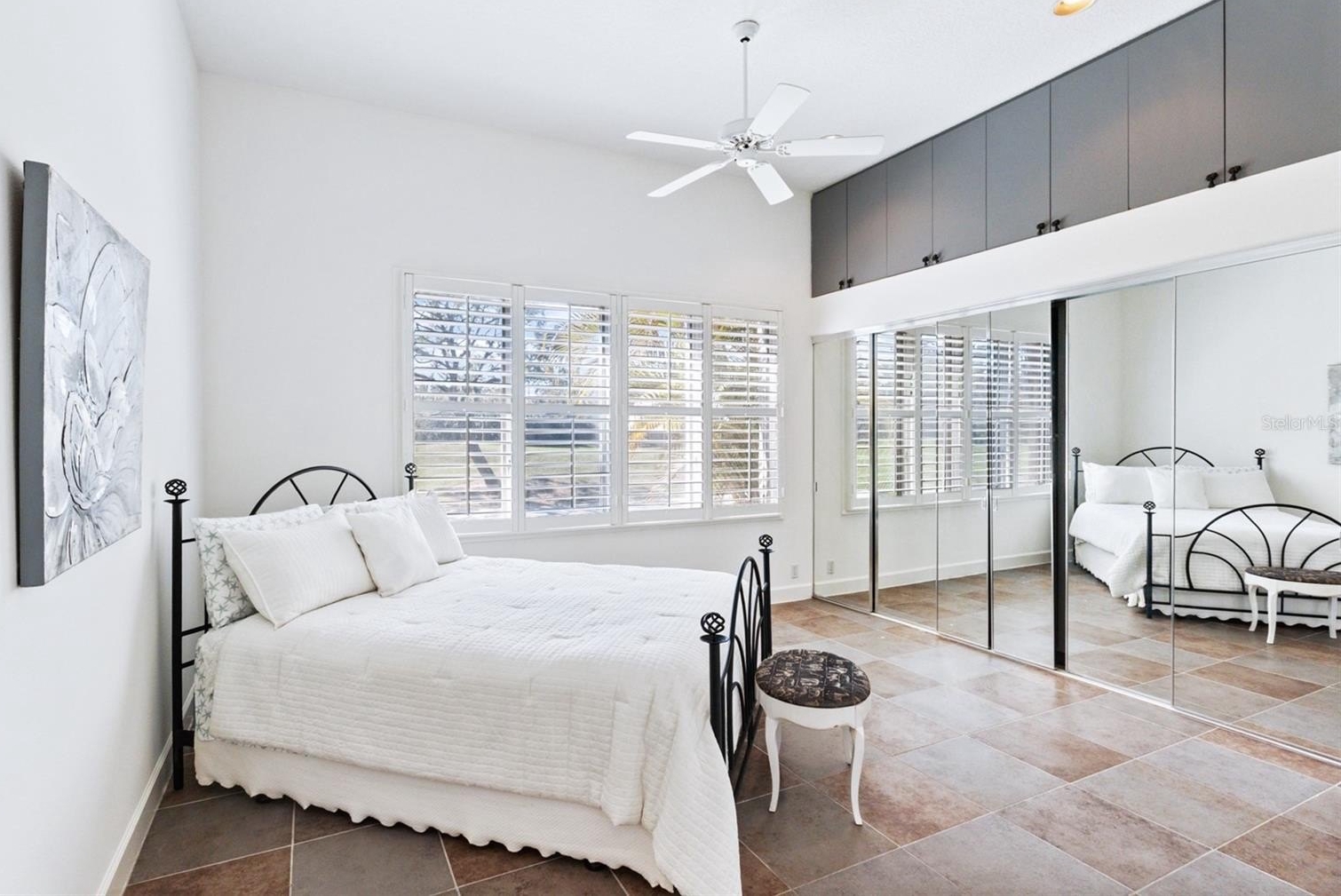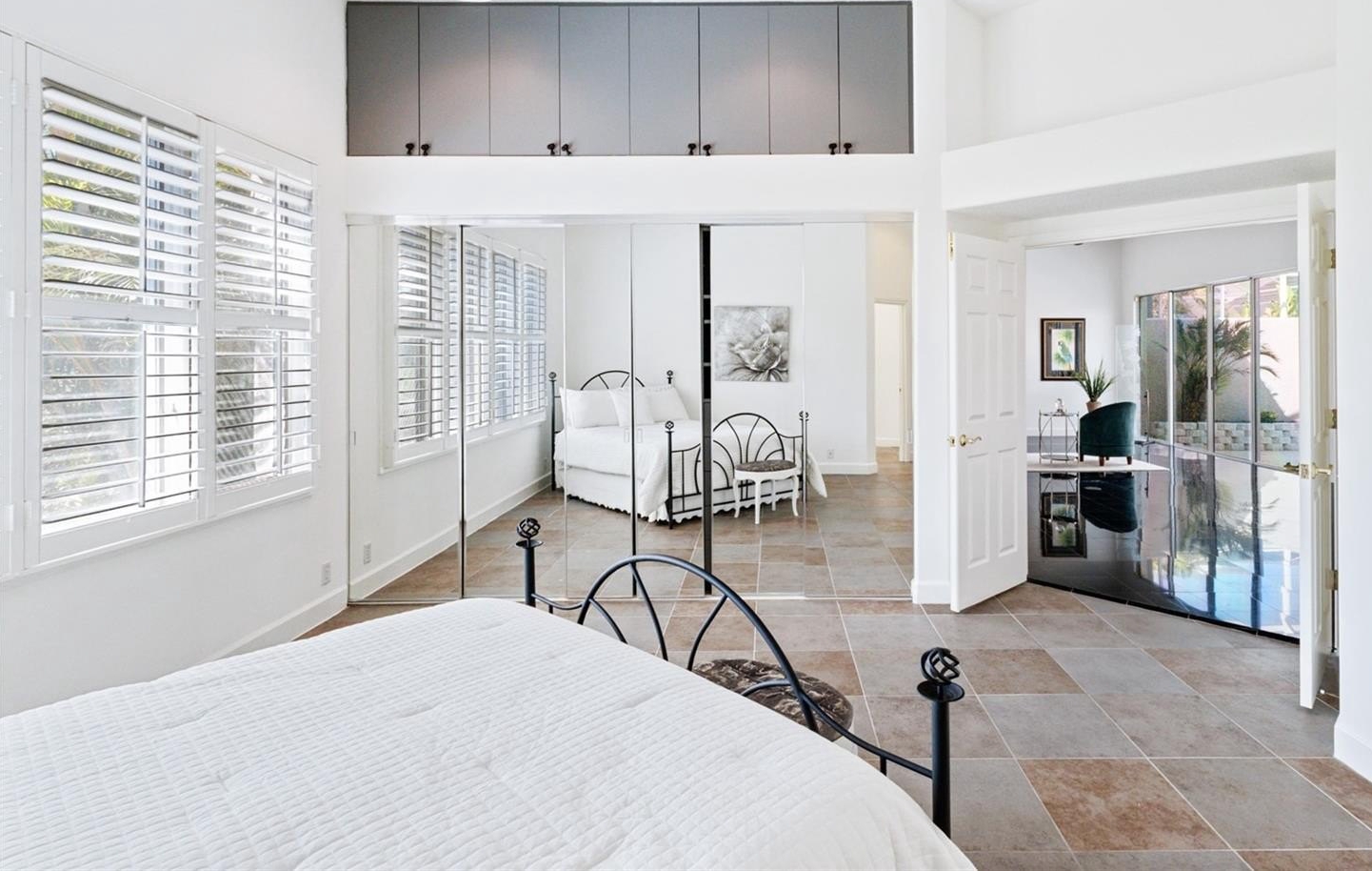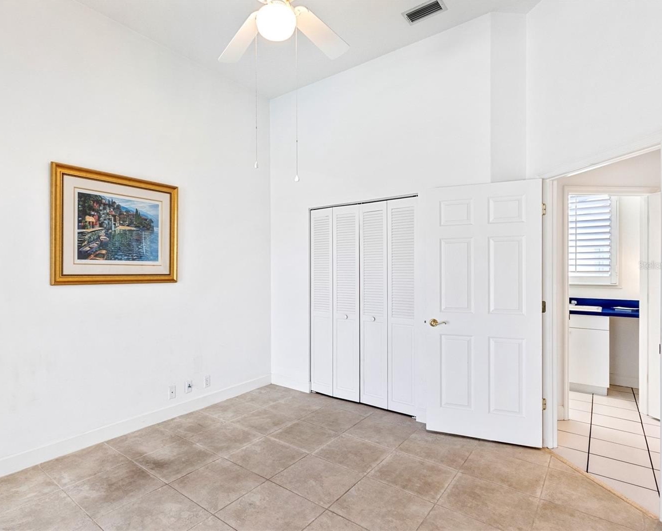 Inside, you’ll find marble tile flooring in the formal living and dining rooms, plantation shutters, and an abundance of natural light throughout. The open family room and kitchen combination is light, bright, and welcoming — complete with light cabinetry galore, tile backsplash, stone countertops, an eat-in dining space, and seamless access to the lanai. A convenient pool bath entrance enhances functionality for entertaining.