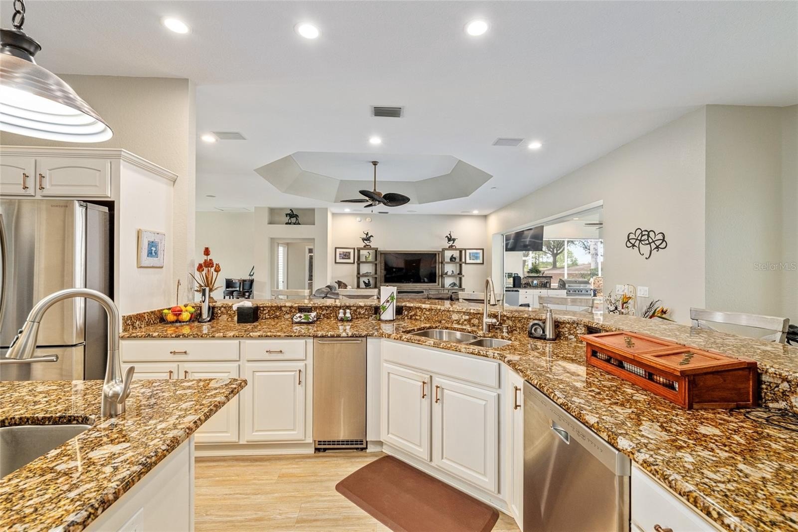 The living room opens seamlessly with stack-back sliding glass doors to your private outdoor oasis — a gorgeous heated pool and spa with stunning water feature, resurfaced in 2019, along with newer LED lighting, pool pump, and gas heater. The fully equipped summer kitchen and expansive birdcage enclosure make this the perfect space for entertaining while enjoying sweeping golf course views. Just outside the enclosure, a paved side patio with privacy hedge creates an additional serene retreat.