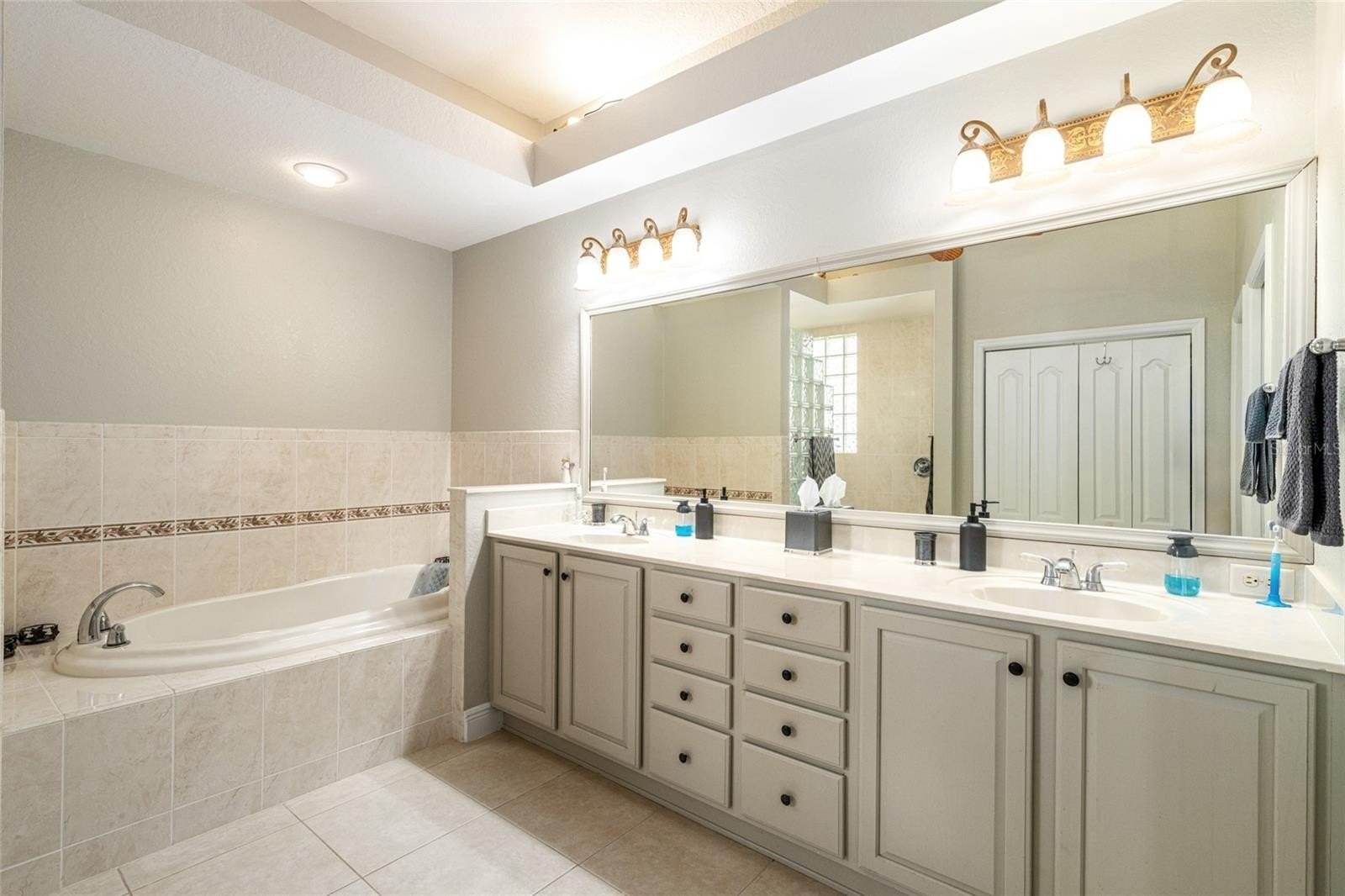 The oversized primary suite features a tray ceiling, wall-mounted TV, and a luxurious en-suite bath with dual sinks, garden tub, Roman shower, private water closet, and a huge walk-in closet.