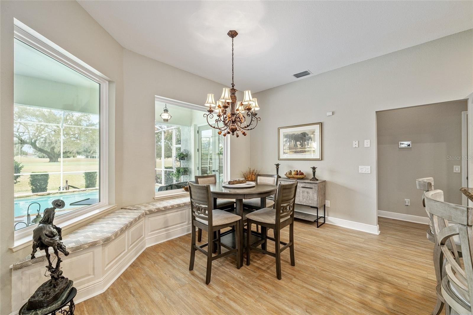 The casual dining area offers charming custom window seats and peaceful views of the pool.