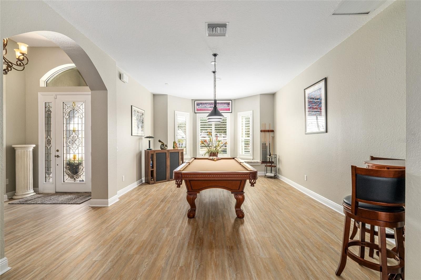 Inside, you’ll find beautiful new vinyl planking flowing through the foyer, living and dining rooms, kitchen, laundry, hallways, and baths, with vinyl planking flooring in the guest bedrooms, and engineered wood flooring in the primary bedroom