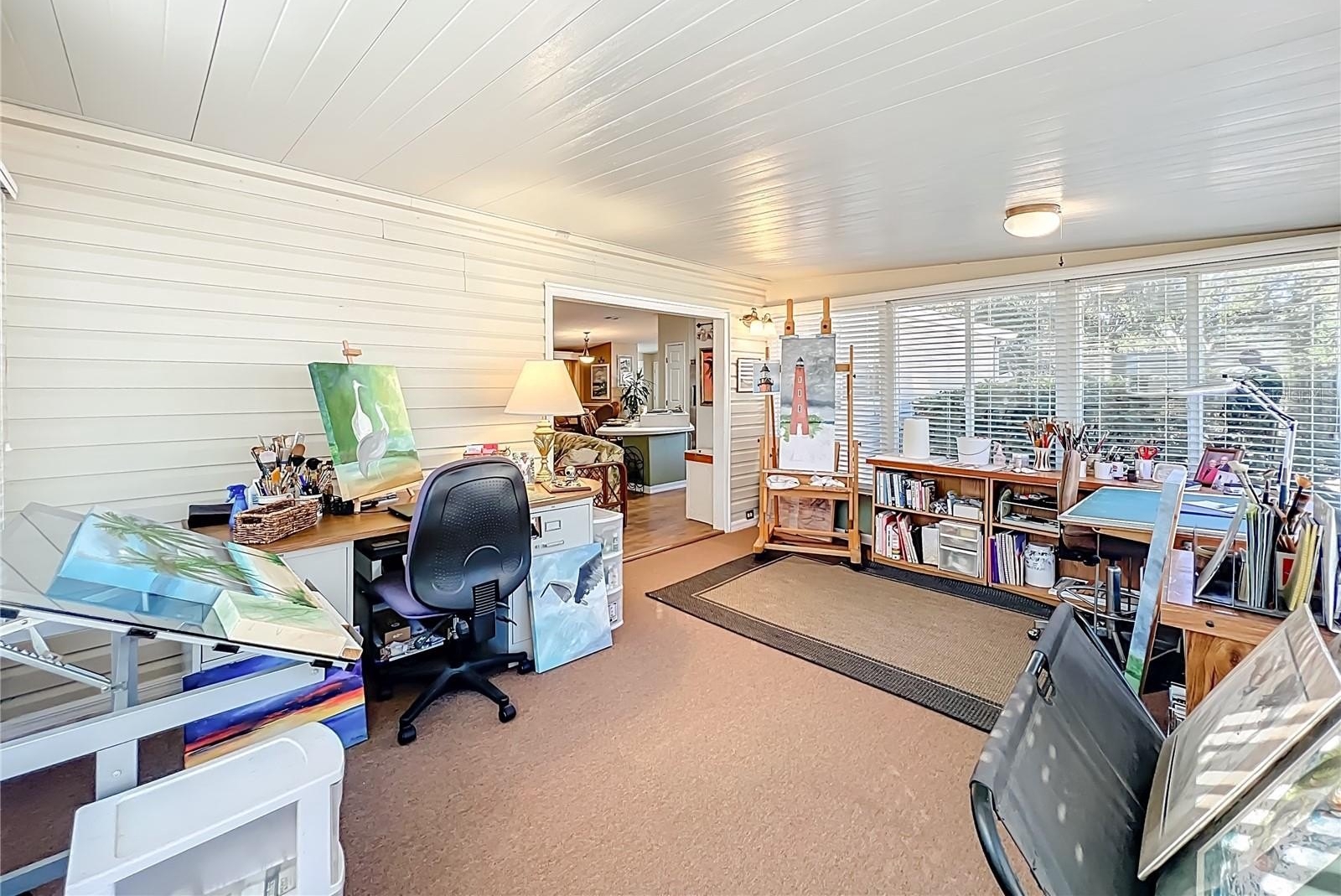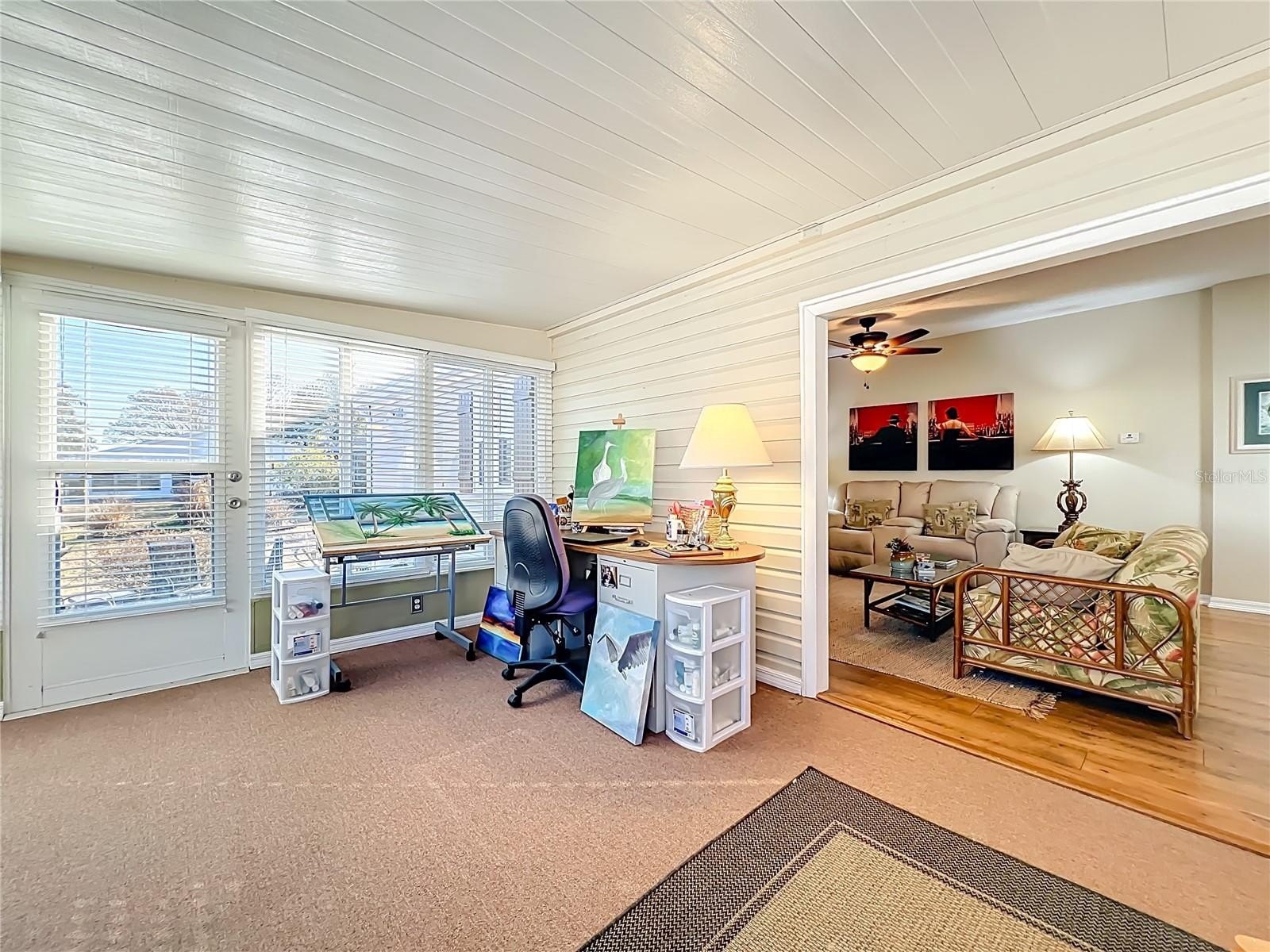 Most Furniture and Golf Cart are negotiable, you can purchase this property Turnkey with some exceptions! This spectacular residence offers over 1,800 square feet under central air and is designed for comfort, flexibility, and effortless living. Featuring two spacious, light-filled bedrooms plus a versatile bonus room currently used as an art studio with beautiful glass windows, this space could easily serve as a sewing room, hobby space, or private home office—the possibilities are truly endless.Step inside to a welcoming foyer complete with a convenient coat closet. The impressive formal living room showcases a custom built-in unit perfect for displaying books and collectibles, while the dining room features a charming built-in hutch—ideal for entertaining. The open-concept layout seamlessly connects the living areas. The kitchen is equipped with upgraded appliances, a breakfast island, and opens to the inviting family room. A stylish wet bar adds character and convenience, or could easily be transformed into a gourmet coffee bar for your morning routine. Elegant upgraded flooring flows throughout the home, offering both beauty and easy maintenance. The spacious primary suite comfortably accommodates a king-size bed and large dressers, and features a generous walk-in closet. The primary bath includes a relaxing Jacuzzi tub, walk-in shower, and multiple cabinets providing abundant storage. The guest suite is equally comfortable, offering ample space and its own large walk-in closet—perfect for family or visiting friends.Additional highlights include an indoor laundry room with cabinetry and extra storage, a carport, and a working shed for hobbies or additional workspace.Major updates include: New Roof (2017), Upgraded HVAC, Upgraded Water Heater This beautifully maintained home offers space, functionality, and thoughtful upgrades—ready for you to move in and enjoy.A Premier 55+ Active Lifestyle Community. Enjoy leisurely rounds of golf on two beautifully maintained 18-hole championship courses, or stay active on lighted tennis courts perfect for evening matches. Unwind by one of three sparkling pools and Jacuzzis, or embrace a healthy lifestyle with access to world-class fitness centers, volleyball, and pickleball courts. With over 100 planned activities each week, there’s always something exciting to look forward to—whether it’s social gatherings, fitness classes, or hobby clubs. The community is set against a backdrop of scenic, landscaped boulevards and tranquil lakes, offering the perfect setting for fishing, walking, or simply relaxing in nature.Three expansive clubhouses serve as hubs of activity and connection, while an on-site restaurant offers delicious dining just steps from your door. At The Plantation at Leesburg, everything you need to enjoy a vibrant, fulfilling lifestyle is right at your fingertips.