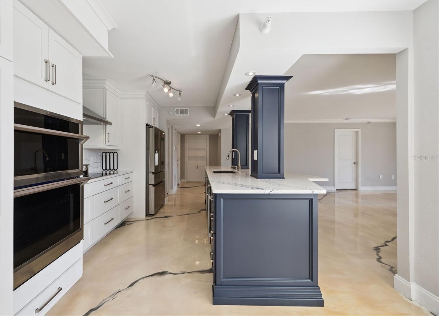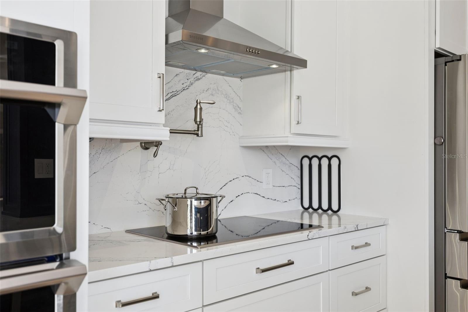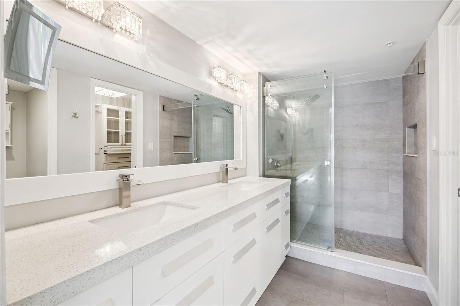 The state-of-the-art chef’s kitchen is a true showpiece, thoughtfully designed for both beauty and function. It includes modern quartz countertops, a smart refrigerator with TV, with AI vision that updates your shopping list, planning and interactive features, a wine refrigerator, new stainless steel appliances, a vented hood, cooktop with pot filler, Bosch dishwasher, and a double oven with convection microwave combination and convection oven—perfect for hosting and everyday luxury. A discreet pantry closet houses a stackable washer and dryer, seamlessly integrating convenience into the design.
