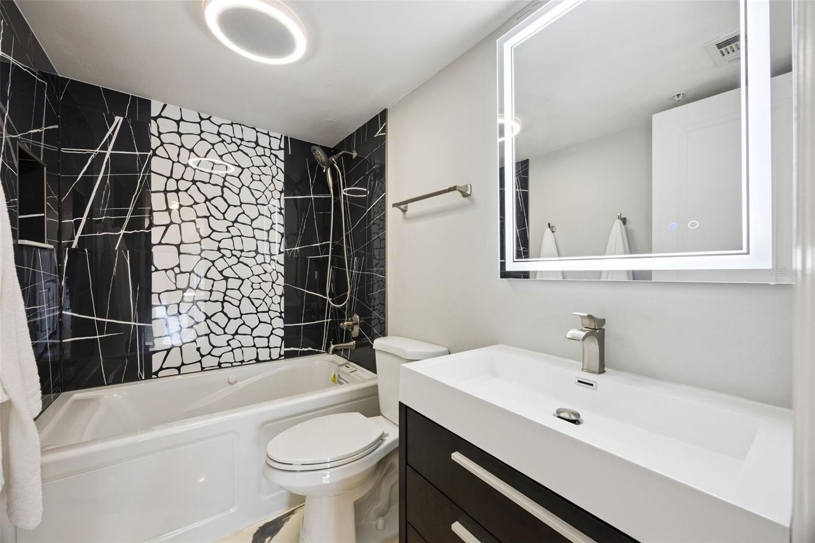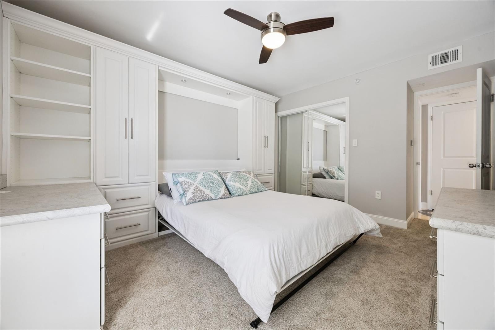 The guest suite is equally impressive, featuring a custom Murphy bed with integrated storage and desk, dresser, television, and elegant glass closet doors. The adjacent guest bath has been fully reimagined as a spa sanctuary with a jetted soaking tub, designer tile, a custom light-up mirror, and new quartz top vanity.