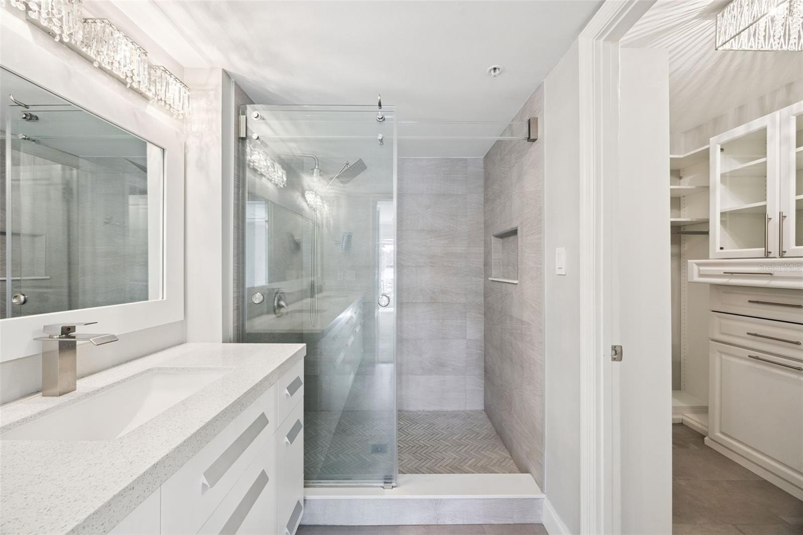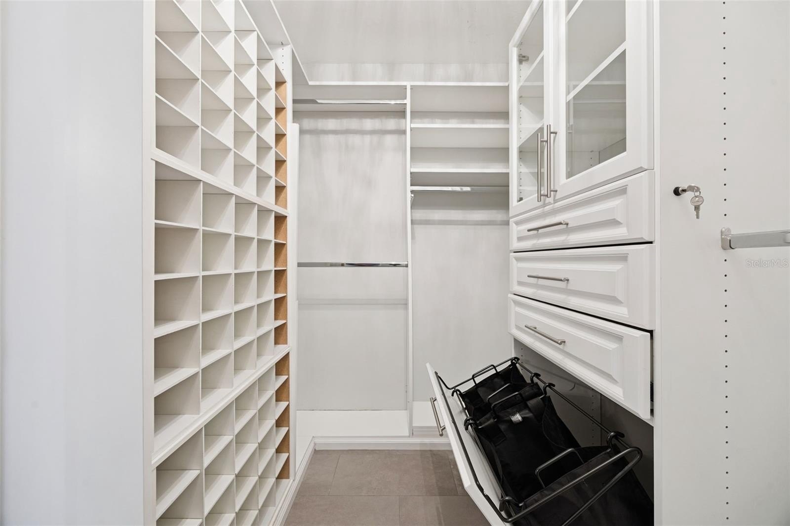 The primary suite is a tranquil retreat with stunning lake views and a custom walk-in closet system complete with jewelry drawer, laundry bins, and generous storage. The spa-inspired primary bath features dual quartz vanities, a frameless glass shower, and a luxurious rain shower head, while the high-end bidet toilet automatically opens upon entry for an added touch of modern indulgence.