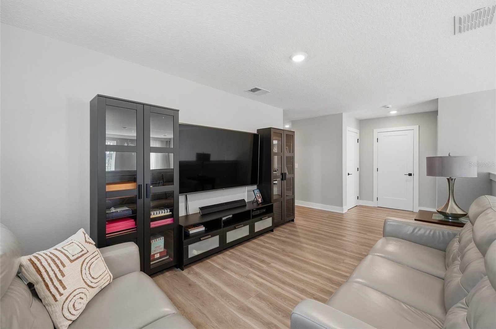 From the moment you enter, the dramatic double height ceilings create an impressive sense of space and natural light. A custom floor to ceiling wood paneled TV feature wall serves as a stunning focal point in the main living area, adding warmth and architectural presence. Throughout the home, custom made window treatments have been thoughtfully installed and will remain with the property, an elegant and valuable enhancement rarely included.