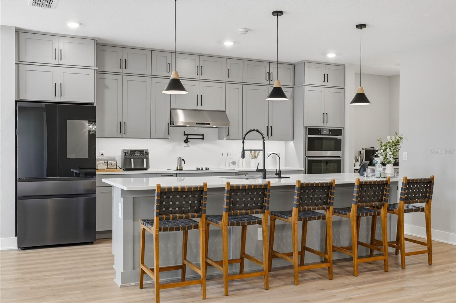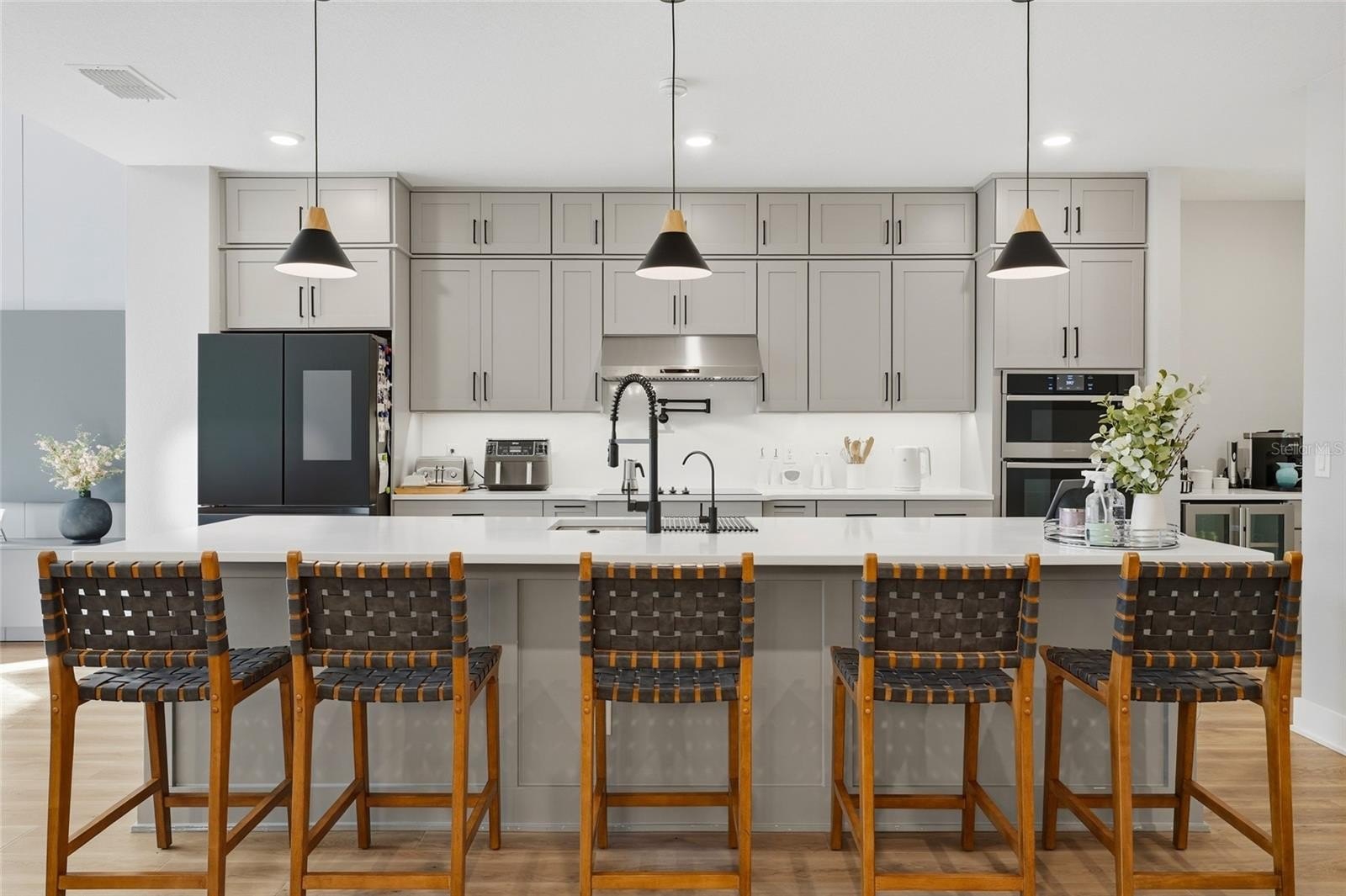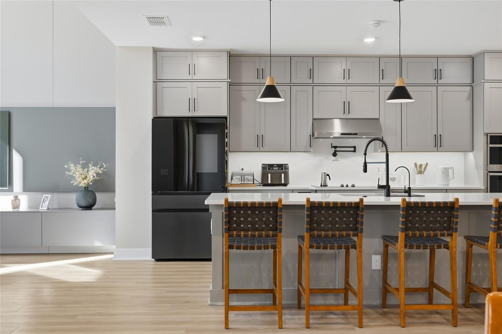 The open concept kitchen blends timeless finishes with modern functionality, featuring upgraded cabinetry, quartz countertops, refined plumbing fixtures, and carefully selected design details throughout. Over 115,000 dollars in builder design upgrades were invested into this home, in addition to custom improvements completed after construction.