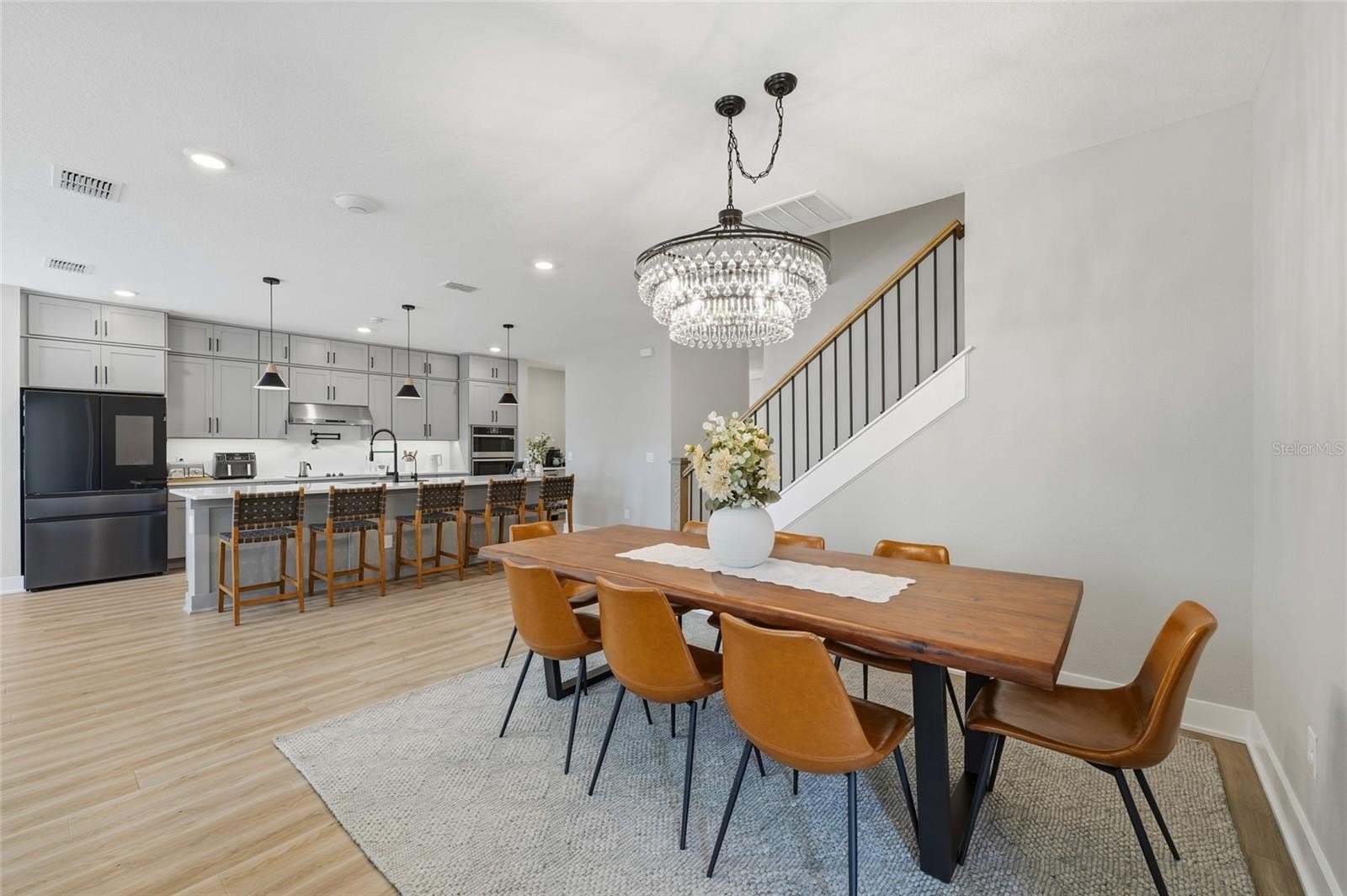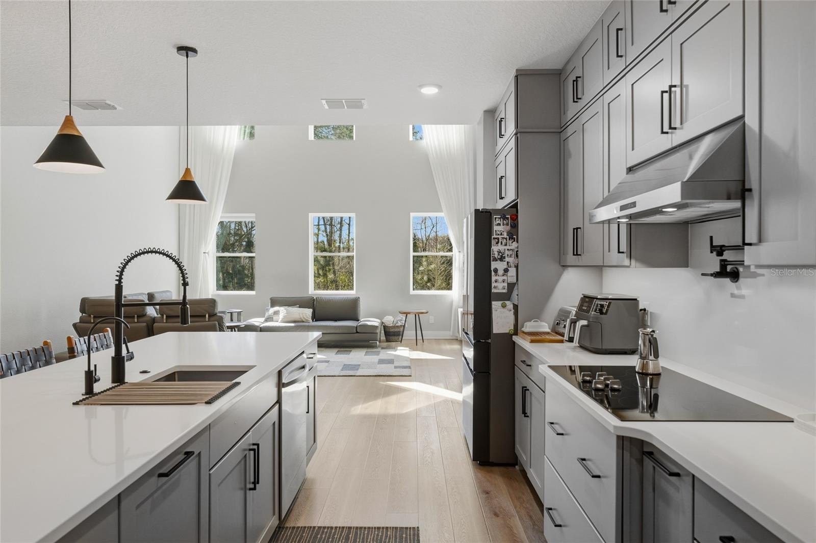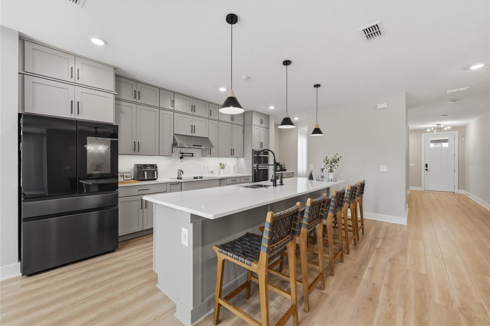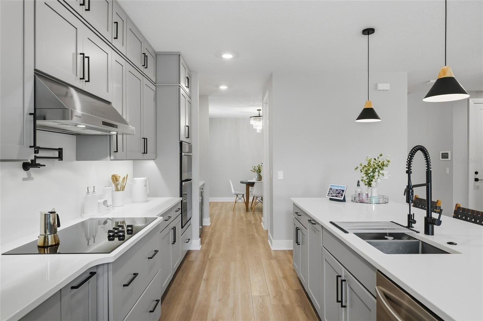 The open concept kitchen blends timeless finishes with modern functionality, featuring upgraded cabinetry, quartz countertops, refined plumbing fixtures, and carefully selected design details throughout. Over 115,000 dollars in builder design upgrades were invested into this home, in addition to custom improvements completed after construction.