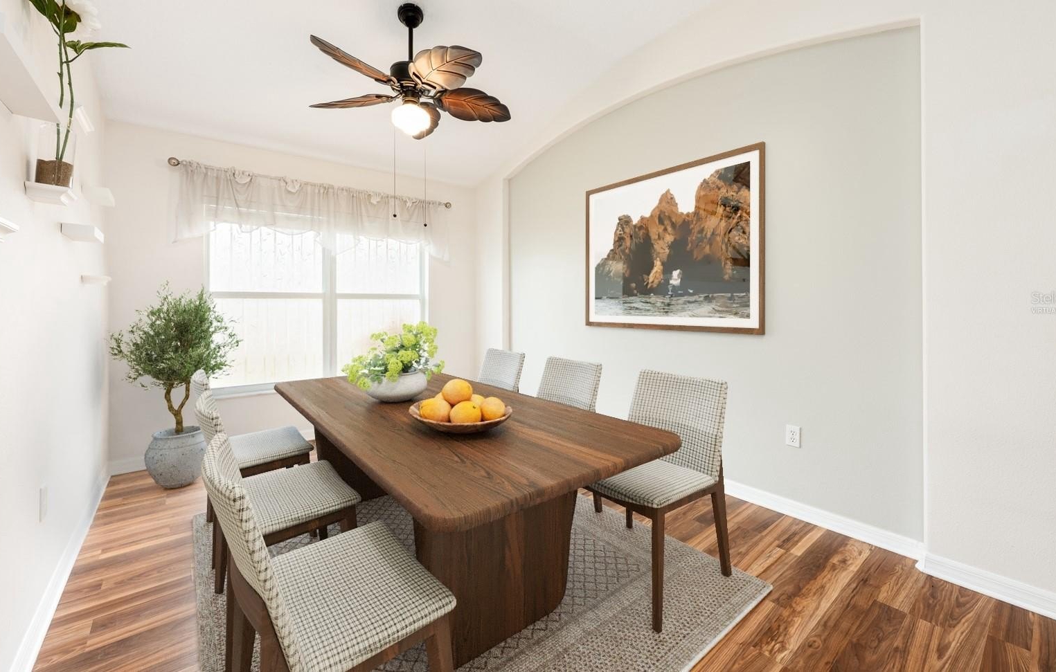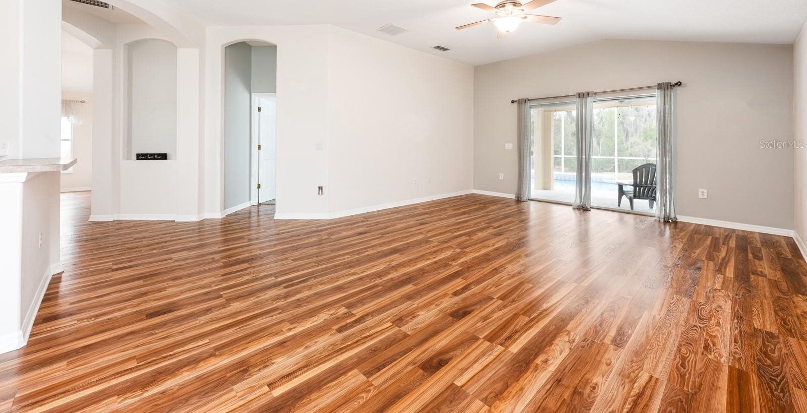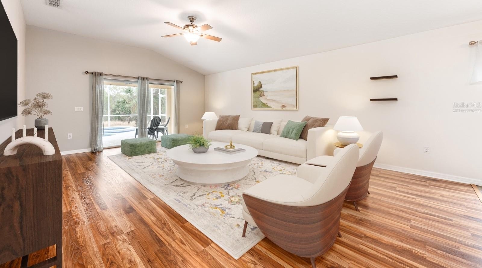 One or more photo(s) has been virtually staged. **Seller may consider buyer concessions if made in an offer**Welcome to your PRIVATE RETREAT in the highly desirable Fairways at Mount Plymouth — a peaceful community built on a former golf course where SCENIC WALKING TRAILS, open green space, and a charming SMALL-TOWN ATMOSPHERE create an exceptional lifestyle. Perfectly positioned with NO REAR NEIGHBORS and backing directly to the former fairways, this beautifully UPDATED 3-bedroom, 2-bath single-story home offers tranquility, privacy, and true MOVE-IN READY comfort. From the moment you arrive, you’ll appreciate the FRESHLY PAINTED EXTERIOR (2024), NEWER ROOF (2022), and UPGRADED IRRIGATION SYSTEM (2024), all reflecting the meticulous care this home has received. Inside, high ceilings and abundant natural light enhance the open-concept design, while WOOD-LOOK LAMINATE FLOORING and UNIQUE ARCHITECTURAL DETAILS add warmth and character. The Living Room, Kitchen, and Dinette flow effortlessly together, creating a welcoming space ideal for both entertaining and everyday living while a separate Dining Room nearby provides the perfect setting for more formal occasions. The STUNNING, LIGHT-FILLED KITCHEN is a showpiece, featuring quartz countertops, solid wood cabinetry, stainless steel appliances, a stylish backsplash, center island, breakfast bar, and a spacious eat-in space. Just off the Kitchen, a well-appointed laundry room offers built-in cabinetry for added convenience and organization. The Living Room’s sliding glass doors open to your own PRIVATE RETREAT—an expansive covered patio and a screened pool and spa enclosure recently enhanced with a NEW POOL CAGE (2021). The professionally maintained, PRIVATE IN-GROUND HEATED POOL AND SPA feel like a luxury resort, complete with a NEW POOL PUMP AND HEATER (2024) to ensure year-round enjoyment. The oversized Primary Suite offers DIRECT ACCESS to the patio and pool through sliding glass doors, creating a seamless indoor-outdoor flow. NEWLY INSTALLED carpet in the Primary Bedroom and closets (2025) adds fresh comfort, while the EN SUITE BATH featuring a relaxing garden tub with shower, and spacious walk-in closet completes this private sanctuary. A thoughtful SPLIT-BEDROOM LAYOUT places two additional bedrooms and a SECOND FULL BATH on the opposite side of the home, providing privacy and flexibility for family or guests. With a LOW HOA, EXCELLENT SCHOOLS, and a QUIET NEIGHBORHOOD atmosphere, Fairways at Mount Plymouth offers the perfect combination of serenity and convenience. You’re just minutes from the HISTORIC CHARM of Mount Dora and Tavares, known for waterfront dining, festivals, boutique shopping, and year-round community events. EASY ACCESS to SR-429, US-441, and the Florida Turnpike makes commuting to Orlando and surrounding areas simple and convenient. If you’ve been searching for a home that combines tranquility, upgrades, outdoor living, and a WELCOMING COMMUNITY FEEL — this is the one!