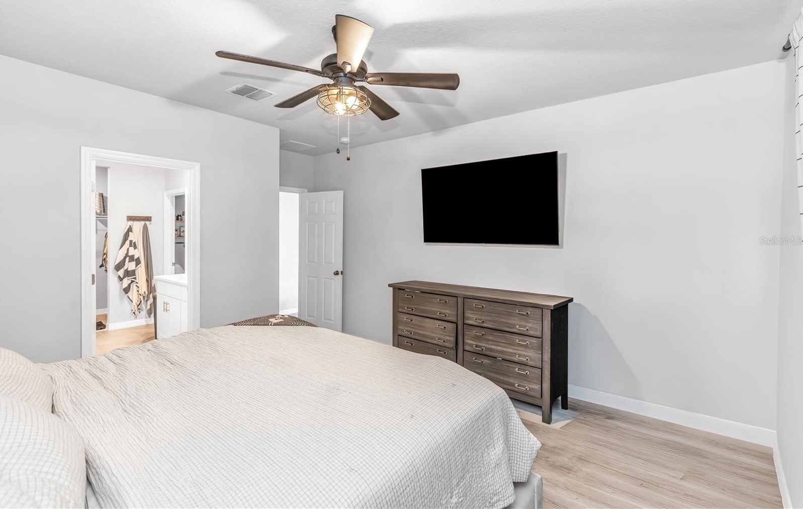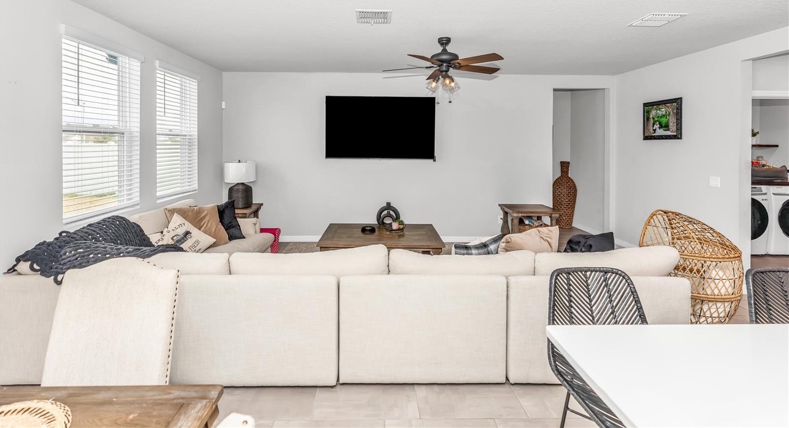 The kitchen features white cabinetry paired with Bengal White granite countertops, stainless steel appliances, and generous prep space. Tile flooring runs throughout the home with all carpet removed, offering durability and easy maintenance. Ceiling fans are installed in every room for added comfort.